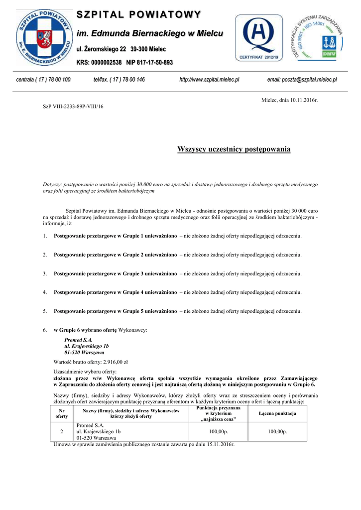 SZPITAL POWIATOWY im. Edmunda Biernackiego w Mielcu ul. Żeromskiego 22 39-300 Mielec KRS: 0000002538 NIP 817-17-50-893 centrala ( 17 ) 78 00 100 tel/fax. ( 17 ) 78 00 146 http://www.szpital.mielec.pl email: [email protected] Mielec, dnia 10.11.2016r. SzP VIII-2233-89P-VIII/16 Wszyscy uczestnicy postępowania Dotyczy: postępowanie o wartości poniżej 30.000 euro na sprzedaż i dostawę jednorazowego i drobnego sprzętu medycznego oraz folii operacyjnej ze środkiem bakteriobójczym Szpital Powiatowy im. Edmunda Biernackiego w Mielcu - odnośnie postępowania o wartości poniżej 30 000 euro na sprzedaż i dostawę jednorazowego i drobnego sprzętu medycznego oraz folii operacyjnej ze środkiem bakteriobójczym informuje, iż: 1. Postępowanie przetargowe w Grupie 1 unieważniono – nie złożono żadnej oferty niepodlegającej odrzuceniu. 2. Postępowanie przetargowe w Grupie 2 unieważniono – nie złożono żadnej oferty niepodlegającej odrzuceniu. 3. Postępowanie przetargowe w Grupie 3 unieważniono – nie złożono żadnej oferty niepodlegającej odrzuceniu. 4. Postępowanie przetargowe w Grupie 4 unieważniono – nie złożono żadnej oferty niepodlegającej odrzuceniu. 5. Postępowanie przetargowe w Grupie 5 unieważniono – nie złożono żadnej oferty niepodlegającej odrzuceniu. 6. w Grupie 6 wybrano ofertę Wykonawcy: Promed S.A. ul. Krajewskiego 1b 01-520 Warszawa Wartość brutto oferty: 2.916,00 zł Uzasadnienie wyboru oferty: złożona przez w/w Wykonawcę oferta spełnia wszystkie wymagania określone przez Zamawiającego w Zaproszeniu do złożenia oferty cenowej i jest najtańszą ofertą złożoną w niniejszym postępowaniu w Grupie 6. Nazwy (firmy), siedziby i adresy Wykonawców, którzy złożyli oferty wraz ze streszczeniem oceny i porównania złożonych ofert zawierającym punktację przyznaną oferentom w każdym kryterium oceny ofert i łączną punktację: Nr oferty Nazwy (firmy), siedziby i adresy Wykonawców którzy złożyli oferty Punktacja przyznana w kryterium „najniższa cena” Promed S.A. ul. Krajewskiego 1b 100,00p. 01-520 Warszawa Umowa w sprawie zamówienia publicznego zostanie zawarta po dniu 15.11.2016r. 2 Łączna punktacja 100,00p. 7. w Grupie 7 wybrano ofertę Wykonawcy: Medicom Sp. z o.o. ul. M. Skłodowskiej-Curie 34 41-819 Zabrze Wartość brutto oferty: 14.952,60 zł Uzasadnienie wyboru oferty: złożona przez w/w Wykonawcę oferta spełnia wszystkie wymagania określone przez Zamawiającego w Zaproszeniu do złożenia oferty cenowej i jest najtańszą ofertą złożoną w niniejszym postępowaniu w Grupie 7. Nazwy (firmy), siedziby i adresy Wykonawców, którzy złożyli oferty wraz ze streszczeniem oceny i porównania złożonych ofert zawierającym punktację przyznaną oferentom w każdym kryterium oceny ofert i łączną punktację: Nr oferty Nazwy (firmy), siedziby i adresy Wykonawców którzy złożyli oferty Punktacja przyznana w kryterium „najniższa cena” Przedsiębiorstwo Medres Zbigniew Majcher 87,40p. ul. Torowa 3 35-205 Rzeszów Medicom Sp. z o.o. 4 ul. M. Skłodowskiej-Curie 34 100,00p. 41-819 Zabrze Umowa w sprawie zamówienia publicznego zostanie zawarta po dniu 15.11.2016r. 3 8. Łączna punktacja 87,40p. 100,00p. w Grupie 8 wybrano ofertę Wykonawcy: Anpico s.c. Jerzy Wasilewski, Anna Wołoszyńska ul. Namysłowska 2 lok. U2 03-454 Warszawa Wartość brutto oferty: 16.750,80 zł Uzasadnienie wyboru oferty: złożona przez w/w Wykonawcę oferta spełnia wszystkie wymagania określone przez Zamawiającego w Zaproszeniu do złożenia oferty cenowej i jest najtańszą ofertą złożoną w niniejszym postępowaniu w Grupie 8. Nazwy (firmy), siedziby i adresy Wykonawców, którzy złożyli oferty wraz ze streszczeniem oceny i porównania złożonych ofert zawierającym punktację przyznaną oferentom w każdym kryterium oceny ofert i łączną punktację: Nr oferty Nazwy (firmy), siedziby i adresy Wykonawców którzy złożyli oferty Punktacja przyznana w kryterium „najniższa cena” MCMedical Marcin Cieślak ul. Owocowy Sad 5 98,50p. 05-500 Piaseczno Anpico s.c. Jerzy Wasilewski, Anna Wołoszyńska 5 100,00p. ul. Namysłowska 2 lok. U2 03-454 Warszawa Umowa w sprawie zamówienia publicznego zostanie zawarta po dniu 15.11.2016r. 1 9. W prowadzonym postępowaniu nie wykluczono żadnego Wykonawcy. 10. W prowadzonym postępowaniu nie odrzucono oferty żadnego Wykonawcy. Łączna punktacja 98,50p. 100,00p.