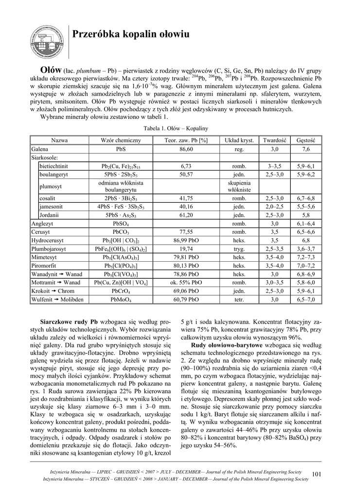 Przeróbka kopalin ołowiu Ołów (łac. plumbum – Pb) – pierwiastek z rodziny węglowców (C, Si, Ge, Sn, Pb) należący do IV grupy układu okresowego pierwiastków. Ma cztery izotopy trwałe: 204Pb, 206Pb, 207Pb i 208Pb. Rozpowszechnienie Pb w skorupie ziemskiej szacuje się na 1,6·10–3% wag. Głównym minerałem użytecznym jest galena. Galena występuje w złożach samodzielnych lub w paragenezie z innymi minerałami np. sfalerytem, wurzytem, pirytem, smitsonitem. Ołów Pb występuje również w postaci licznych siarkosoli i minerałów tlenkowych w złożach polimineralnych. Ołów pochodzący z tych złóż jest odzyskiwany w procesach hutniczych. Wybrane minerały ołowiu zestawiono w tabeli 1. Tabela 1. Ołów – Kopaliny Nazwa Galena Siarkosole: bietiechtinit boulangeryt plumosyt cosalit jamesonit Jordanii Anglezyt Cerusyt Hydrocerusyt Plumbojarosyt Mimetesyt Piromorfit Wanadynit t Wanad Mottramit t Wanad Krokoit t Chrom Wulfenit t Molibden Wzór chemiczny PbS Teor. zaw. Pb [%] 86,60 Układ kryst. reg. Twardość 3,0 Gęstość 7,6 Pb2(Cu, Fe)21S15 5PbS · 2Sb2S3 odmiana włóknista boulangerytu 2PbS · 3Bi2S3 4PbS · FeS · 3Sb2S3 5PbS · As2S3 PbSO4 PbCO3 Pb3[OH | CO3]2 PbFe6[(OH)6 | (SO4)2] Pb5[Cl(AsO4)3] Pb5[Cl(PO4)3] Pb5[Cl(VO4)3] Pb(Cu, Zn)[OH | VO4] PbCrO4 PbMoO4 6,73 50,57 romb. jedn. skupienia włókniste romb. jedn. jedn. romb. romb. heks. tryg. heks. heks. heks. romb. jedn. tetr. 3–3,5 2,5–3,0 5,9–6,1 5,9–6,2 2,5–3,0 2,0–2,5 2,5–3,0 3,0 3,5 3,5 2,5–3,5 3,5–4,0 3,5–4,0 3,0 3,0–3,5 2,5–3,0 3,0 6,7–6,8 5,5–5,6 5,8 6,1–6,4 6,5–6,6 6,8 3,6–3,7 7,2–7,3 7,0–7,2 6,8–6,9 5,8–6,0 5,9–6,1 6,5–7,0 41,75 40,16 61,20 77,55 86,99 PbO 19,74 79,81 PbO 80,13 PbO 78,86 PbO ok. 55% PbO 69,06 PbO 60,79 PbO Siarczkowe rudy Pb wzbogaca się według prostych układów technologicznych. Wybór rozwiązania układu zależy od wielkości i równomierności wpryśnięć galeny. Dla rud grubo wpryśniętych stosuje się układy grawitacyjno-flotacyjne. Drobno wpryśniętą galenę wydziela się przez flotację. Jeżeli w nadawie występuje piryt, stosuje się jego depresję przy pomocy małych ilości cyjanków. Przykładowy schemat wzbogacania monometalicznych rud Pb pokazano na rys. 1 Ruda surowa zawierająca 22% Pb kierowana jest do rozdrabniania i klasyfikacji, w wyniku których uzyskuje się klasy ziarnowe 6–3 mm i 3–0 mm. Klasy te wzbogaca się w osadzarkach, uzyskując końcowy koncentrat galeny, produkt pośredni, poddawany wzbogacaniu kontrolnemu na stołach koncentracyjnych, i odpady. Odpady osadzarek i stołów po domieleniu przekazuje się do flotacji. Jako odczynniki stosowane są ksantogenian etylowy 10 g/t, krezol 5 g/t i soda kalcynowana. Koncentrat flotacyjny zawiera 75% Pb, koncentrat grawitacyjny 78% Pb, przy całkowitym uzysku ołowiu wynoszącym 96%. Rudy ołowiowo-barytowe wzbogaca się według schematu technologicznego przedstawionego na rys. 2. Ze względu na drobno wpryśnięte minerały rudę (90–100%) rozdrabnia się do uziarnienia ziaren <0,4 mm, po czym wzbogaca flotacyjnie, wydzielając najpierw koncentrat galeny, a następnie barytu. Galenę flotuje się mieszaniną ksantogenianów butylowego i etylowego. Depresorem skały płonnej jest szkło wodne. Stosuje się siarczkowanie przy pomocy siarczku sodu 1 kg/t. Baryt flotuje się siarczanem alkilu i naftą. W wyniku wzbogacania otrzymuje się koncentrat galeny o zawartości 44–46% Pb przy uzysku ołowiu 80–82% i koncentrat barytowy (80–82% BaSO4) przy jego uzysku 54–56%. Inżynieria Mineralna — LIPIEC – GRUDZIEŃ < 2007 > JULY – DECEMBER— Journal of the Polish Mineral Engineering Society Inżynieria Mineralna — STYCZEŃ – GRUDZIEŃ < 2008 > JANUARY – DECEMBER— Journal of the Polish Mineral Engineering Society 101 Rys. 2. Schemat wzbogacania rud ołowiowo-barytowych Rudy Cu i Pb są rzadko spotykane. Wzbogaca się je według schematu flotacji kolektywnej z późniejszym rozdzieleniem koncentratu kolektywnego w środowisku zasadowym przy depresji galeny cyjankami lub siarczanem cynku. Rys. 1. Schemat wzbogacania rud Pb metodą grawitacyjno-flotacyjną 102 Sposoby wzbogacania rud cynkowo-ołowiowych omówiono pod hasłem „Cynk”, fluorytowo-galenowych pod hasłem „Przeróbka kopalin fluorytowych”, polimetalicznych pod hasłem „Przeróbka kopalin kobaltowych”, miedziowo-ołowiowych pod hasłem „Przeróbka kopalin miedziowych”. Inżynieria Mineralna — LIPIEC – GRUDZIEŃ < 2007 > JULY – DECEMBER— Journal of the Polish Mineral Engineering Society Inżynieria Mineralna — STYCZEŃ – GRUDZIEŃ < 2008 > JANUARY – DECEMBER— Journal of the Polish Mineral Engineering Society
