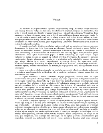Wałkoń Już nie bawi się w piaskownicy, wyrósł z niego sążnisty chłop. Ale umysł wciąż dziecinny. Łazi między domami, wałęsa się bez sensu po asfaltowych alejkach, rozgląda się bezmyślnie, dwa kroki w przód, postój, pięć kroków w przeciwną stronę. I tak całymi godzinami. Wyszedł na dwór najedzony; w domu nie ma co robić, więc wybył. I teraz zabić czas do pory następnego żarcia. Po czym, nie mając w swoich pieleszach nic do roboty, znowu – jeśli będzie jeszcze widno – wylezie. Następnego dnia mieszkańcy bloków znów ze swych okien będą mogli obserwować to bezcelowe szwendanie się wte i wewte; łażenie, gdzie nogi poniosą. Całkowicie bezużyteczne życie, ciężar dla rodzicieli i dla społeczeństwa. A przecież można by i takiego osobnika wykorzystać, dać mu zajęcie pożyteczne a zarazem dopasowane do jego trybu życia i poziomu umysłowego. Zawód: chodzenie z psem. Ściślej: z psami, ze wszystkimi psiskami i psinami hodowanymi w blokach tego osiedla, z każdą bestią po kolei. Powiedzmy, że właścicielowi lub właścicielce nie chce się wyjść, woli posiedzieć przed telewizorem. Więc tylko wyprowadza pupila z klatki schodowej, po czym wręcza smycz wałkoniowi. Łażąc z psem, do czegoś się wałkoń przydaje. Pożyteczny dla sąsiadów i zarazem zmniejszający koszty własnego utrzymania, bo ci właściciele psów odpalaliby mu coś niecoś za jego usługę. Można by to nawet zorganizować, wyznaczyć dyżury. Ba, opracować grafik. Właściciel czworonoga wiedziałby, że o godzinie 16,35 może liczyć na „pożytecznego wałkonia”; wiadomo byłoby owemu właścicielowi, że zawsze jest w pogotowiu ktoś, na kogo można zwalić obowiązek. Jerzy, z zawodu psycholog, uśmiecha się wysłuchawszy mojej relacji o wałkoniu, połączonej z projektem przedzierzgnięcia wałkonienia się w profesję, projektem, którego oczywiście nie traktowałem zbyt serio. – Czysta abstrakcja – brzmi komentarz mojego przyjaciela, znawcy dusz. Po czym zaserwowano mi wykład. Dlaczego ludzie trzymają psy, koty? Odpowiedzi na to pytanie dostarcza psychologia ewolucyjna. Zachowały się w nas pierwotne potrzeby, których ośrodkiem jest stara część mózgu. Tam właśnie, w tych „archaicznych” zakątkach mózgownicy, są ślady zachowań naszych przodków, którzy trudnili się zbieractwem lub hodowlą. Wyprowadzali zwierzęta na pastwisko, towarzyszyli im w wędrówce do miejsc zasobnych w paszę. Ten atawizm pasterski stwarza teraz potrzebę posiadania psa, którego wyprowadza się z domu, by odbyć spacer po najbliższym terenie. My, wywodzący się z plemion hodujących zwierzaki, wciąż „wychodzimy na pastwisko”. Zgodnie z tym, co zakodowane pod sklepieniem naszej czaszki. Toteż jeśli ktoś obecnie sprawia sobie psa, to nie po to, aby takie spacery zwalić na innego. Nie po to, aby rolę spacerowicza przekazać znajomkowi, któremu w dodatku trzeba płacić. – A jednak – podjąłem dyskusję – a jednak widuje się kobiecinę, co drepcze z psem, bo musi. Widać z jej miny, że to dla niej tylko obowiązek. I o ile pies chciałby spacerować jak najdłużej, to jego właścicielka – jak najkrócej. Ty, jako opiekun swojej Duni, jesteś bez zarzutu, ale w innych rodzinach, składających się z członków dwu- i czworonożnych, ci pierwsi, podejrzewam, nierzadko wykręcają się od czegoś, co traktowane jest przez nich jako „psi obowiązek”, zwalając go na siebie wzajem, ojciec na syna, brat na siostrę lub odwrotnie. A zresztą to, co napisał Roland Topor, choć w intencji humorystycznej, zawiera ziarno prawdy. Wymyślił postać usługodawcy, co lokuje się na ulicy jak straganiarz, lecz niczego nie sprzedaje; on za opłatą pozwala przechodniowi psa pogłaskać, pobawić się, pobaraszkować nawet. Jedno głaśnięcie kosztuje pięć sous, dziesięć 1 głaśnięć jednego franka. Handlowa oferta jest adresowana do takich, co lubią zwierzęta, ale są zbyt leniwi, aby zajmować się karmieniem, sprzątaniem et cetera. – Są pasterze dobrzy i źli – zakończył polemikę Jerzy. W polemice, powarkując od czasu do czasu, bierze udział Dunia, dorodny okaz z rasy psów pasterskich. Powarkiwanie nasila się, gdy uznawszy, że czas kończyć wizytę, biorę bez pośpiechu tyłek w troki. Kiedy po paru krokach znalazłem się w przedpokoju, moje ręce, zamiast zdjąć z haczyka płaszcz, uniosły się do uszu znękanych szczekaniem. – Nie lubi mnie? – O, nic podobnego – mówi Joanna, żona Jerzego, która właśnie nadeszła z głębi mieszkania, by się ze mną pożegnać. Stoimy we trójkę, Joanna, Jerzy i ja, a nieco dalej Dunia – z wlepionym we mnie srogim spojrzeniem. Dowiaduję się, że zachowanie zwierza jest normalne, ot pies pasterski, co strzeże pastwiska. Nie tylko wobec mnie bywa wymierzona ta przeplatanka warknięć i szczeknięć. Przy innych gościach to samo. Nawet gdy syn lub córka opuszcza mieszkanie (mają już domostwa własne), suka powarkuje także. Nie jest rada, że się stado rozchodzi. – Przypomina mi się opowiadanie Mrożka. Zapinając guziki płaszcza streszczam nowelkę: – Owczarek zaczął obiegać w kółko grupę gości zaproszonych na garden party i toczących konwersację w ogródku. Nie koniec na tym. Pies zmusił wszystkich, każdego po kolei, do opuszczenia się na czworaki, po czym kazał im żreć trawę. Moja poważna mina miała zasugerować, że cytowany przeze mnie fakt jest autentyczny. Ale Joanna, zapamiętawszy nazwisko autora, wiedziała już, co o tej historyjce sądzić: – No tak, Mrożek... 2