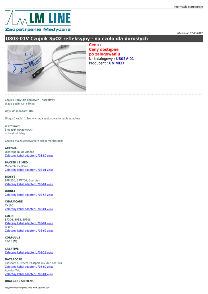 Informacje o produkcie Utworzono 07-03-2017 U803-01V Czujnik SpO2 refleksyjny - na czoło dla dorosłych Cena : Ceny dostępne po zalogowaniu Nr katalogowy : U803V-01 Producent : UNIMED Czujnik SpO2 dla dorosłych - naczołowy Waga pacjenta: +40 kg. Wtyk do monitora: DB9 Długość kabla: 1.1m, wymaga zastosowania kabla adaptera. W zestawie: 5 opasek naczołowych uchwyt rektalny Czujnik ma zastosowanie w wielu monitorach: ARTEMA: Diascope 8000, Athena Zalecany kabel adapter U708-80 wejdź BAXTER / SIMED Monarch, Explorer Zalecany kabel adapter U708-01 wejdź BIOSYS BPM200, BPM700, Guardian Zalecany kabel adapter U708-01 wejdź BOINET Zalecany kabel adapter U708-58 wejdź CHARMCARE CX100 Zalecany kabel adapter U708-01 wejdź COLIN BP306, BP88, BP508 Zalecany kabel adapter U708-01 wejdź BP88S Zalecany kabel adapter U708-69 wejdź CORPULUS 08/16 (M) CREATIVE Zalecany kabel adapter U708-29 wejdź DATASCOPE Passport II, Expert, Passport XG, Accutor Plus Zalecany kabel adapter U708-69 wejdź Accutor-Trio Zalecany kabel adapter U708-01 wejdź DRAEGER / SIEMENS Wygenerowano w programie www.oscGold.com Vitalert 1000, Cicero Zalecany kabel adapter U708-28 wejdź Narkomed-Oxysat 2 Zalecany kabel adapter U710-85 wejdź Sirecust, Sirem SpO2 Zalecany kabel adapter U708-33 wejdź SC6000, 7000, 9000 Zalecany kabel adapter U708-23 wejdź EDAN Oksymetry Edan: M9, M99A, M8, M8A, M8B, M3, M3B Zalecany kabel adapter U708-29 wejdź FUKUNDA DENSHI DS5100E, DS5300W Zalecany kabel adapter U708-01 wejdź GE COROMETRIX 128, 128F, 129, 129F, 188 Zalecany kabel adapter U708-01 wejdź 118, 120, 510, 511, 556 Zalecany kabel adapter U708-25 wejdź 128, 129 Zalecany kabel adapter U708-21 wejdź GE CRITIKON Dinamap, 9700, 9701, 9702 Plus, MPS Portable, Compact Zalecany kabel adapter U708-01 wejdź Dinamap, ProSeries V1, ProSeries V2 Zalecany kabel adapter U708-69 wejdź Dinamap, 8700, 8710, 8720 Pulse, Oxyshuttle 1/2 Zalecany kabel adapter U708-10 wejdź GE DATEX-OHMEDA Moduły M-NSAT AS/3, CS/3, S/5 Zalecany kabel adapter U708-69 wejdź GE HELLIGE Cardioserv, Eagle 1000-3000 Zalecany kabel adapter U708-55 wejdź GE MARQUETTE Eagle 1000/3000/4000 Dash 2000/3000/4000 Solar 8000/8000M i9500 (Tram 451/451N/851/851N) CardioLab / MacLab Corometrix 120 / 2120 (Tram 451/451N) Responder 3000 Zalecany kabel adapter U708-21 wejdź GOLDWAY Wtyczka Redel 5 pin - U708-37 wejdź Wtyczka Redel 7 pin - U708-38 wejdź Wtyczka Lemo 5 pin - U708-11 wejdź Wtyczka Pace Tech - U708-39 wejdź IVY BIOMEDICAL 405P, 405T Zalecany kabel adapter U708-01 wejdź 405A, 405D Zalecany kabel adapter U710-85 wejdź KONTRON 7150, 7850, Ivy 2000 Zalecany kabel adapter U708-01 wejdź 7840, 7845, Minimon, 7337 Micromon, Supermon, Kolormon, Trakmon Zalecany kabel adapter U708-13 wejdź Inne Zalecany kabel adapter U708-53 wejdź MDE INVIVO 20300, 20401, 20403, Prism Zalecany kabel adapter U708-01 wejdź Escort 1, Escort 300 Zalecany kabel adapter U708-69 wejdź Informacje o produkcie MEDTRONIC / PHYSIO-CONTROL Lifepack 12 Zalecany kabel adapter U708-01 wejdź MEK Zalecany kabel adapter U708-56 wejdź MENNEN Envoy Zalecany kabel adapter U708-54 wejdź Horizon 1100, 2000 XL, Mercury, MR 1300 Zalecany kabel adapter U710-85 wejdź Horizon XL, Mercury 1200, MR 1300 Zalecany kabel adapter U708-24 wejdź MINDRAY 509B, MEC-1000, Nowy PM6000, PM7000, PM8000, PM9000, PM9000 Express, VS800 Zalecany kabel adapter U708-29 wejdź PM6000 Zalecany kabel adapter U708-22 wejdź T5 / T8 Zalecany kabel adapter U708-48 wejdź NELLCOR NPB20, NPB40, NPB75, NPB180, NPB185, NPB190, NPB195, NPB3900, NPB4000 Zalecany kabel adapter U708-01 wejdź N200 Zalecany kabel adapter U710-85 wejdź NPB3000, NPB3100, NPB290, NPB295, NPB395, Symphony Zalecany kabel adapter U708-69 wejdź PACE TECH Zalecany kabel adapter U708-38 wejdź Zalecany kabel adapter U708-39 wejdź PHILIPS / HP 78352C, 78354C, 78834C, M1020A, M1025A, M1020B, M1350B, M1772A, M1772B, M1732A, M1732B, M2475B Zalecany kabel adapter U708-20 wejdź A1, A3 Zalecany kabel adapter U708-01 wejdź C1, C3, M3, M4, Viridia, MP20, MP30, MP40, MP50, MP60, MP70, MP90, VM4, VM6, VM8 Zalecany kabel adapter U708-43 wejdź SCHILLER ODM / BRUKER TM 910 - Defigard 500 Zalecany kabel adapter U708-63 wejdź Propaq SC, seria Encore, Atlas Zalecany kabel adapter U708-01 wejdź SPACELABS 90351-0/6, 90465, 90466, 90456, PC Express Zalecany kabel adapter U708-04 wejdź Ultraview Zalecany kabel adapter U708-74 wejdź Wygenerowano w programie www.oscGold.com