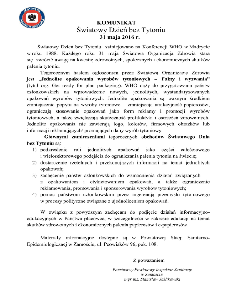 KOMUNIKAT Światowy Dzień bez Tytoniu 31 maja 2016 r. Światowy Dzień bez Tytoniu zainicjowano na Konferencji WHO w Madrycie w roku 1988. Każdego roku 31 maja Światowa Organizacja Zdrowia stara się zwrócić uwagę na kwestię zdrowotnych, społecznych i ekonomicznych skutków palenia tytoniu. Tegorocznym hasłem ogłoszonym przez Światową Organizację Zdrowia jest „Jednolite opakowania wyrobów tytoniowych – Fakty i wyzwania” (tytuł org. Get ready for plan packaging). WHO dąży do przygotowania państw członkowskich na wprowadzenie nowych, jednolitych, wystandaryzowanych opakowań wyrobów tytoniowych. Jednolite opakowania są ważnym środkiem zmniejszenia popytu na wyroby tytoniowe – zmniejszają atrakcyjność papierosów, ograniczają stosowanie opakowań jako form reklamy i promocji wyrobów tytoniowych, a także zwiększają skuteczność profilaktyki i ostrzeżeń zdrowotnych. Jednolite opakowania nie zawierają logo, kolorów, firmowych obrazków lub informacji reklamujących/ promujących dany wyrób tytoniowy. Głównymi zamierzeniami tegorocznych obchodów Światowego Dnia bez Tytoniu są: 1) podkreślenie roli jednolitych opakowań jako części całościowego i wielosektorowego podejścia do ograniczania palenia tytoniu na świecie; 2) dostarczenie rzetelnych i przekonujących informacji na temat jednolitych opakowań; 3) zachęcenie państw członkowskich do wzmocnienia działań związanych z opakowaniem i etykietowaniem opakowań, a także ograniczenie reklamowania, promowania i sponsorowania wyrobów tytoniowych; 4) pomoc państwom członkowskim przez ingerencją przemysłu tytoniowego w procesy polityczne związane z ujednoliceniem opakowań. W związku z powyższym zachęcam do podjęcie działań informacyjnoedukacyjnych w Państwa placówce, w szczególności w zakresie edukacji na temat skutków zdrowotnych i ekonomicznych palenia papierosów i e-papierosów. Materiały informacyjne dostępne są w Powiatowej Stacji SanitarnoEpidemiologicznej w Zamościu, ul. Peowiaków 96, pok. 108. Z poważaniem Państwowy Powiatowy Inspektor Sanitarny w Zamościu mgr inż. Stanisław Jaślikowski