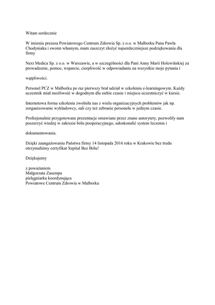 Witam serdecznie W imieniu prezesa Powiatowego Centrum Zdrowia Sp. z o.o. w Malborku Pana Pawła Chodyniaka i swoim własnym, mam zaszczyt złożyć najserdeczniejsze podziękowania dla firmy Next Medica Sp. z o.o. w Warszawie, a w szczególności dla Pani Anny Marii Holewińskiej za prowadzenie, pomoc, wsparcie, cierpliwość w odpowiadaniu na wszystkie moje pytania i wątpliwości. Personel PCZ w Malborku po raz pierwszy brał udział w szkoleniu e-learningowym. Każdy uczestnik miał możliwość w dogodnym dla siebie czasie i miejscu uczestniczyć w kursie. Internetowa forma szkolenia zwolniła nas z wielu organizacyjnych problemów jak np. zorganizowanie wykładowcy, sali czy też zebranie personelu w jednym czasie. Profesjonalnie przygotowane prezentacje omawiane przez znane autorytety, pozwoliły nam poszerzyć wiedzę w zakresie bólu pooperacyjnego, udoskonalić system leczenia i dokumentowania. Dzięki zaangażowaniu Państwa firmy 14 listopada 2016 roku w Krakowie bez trudu otrzymaliśmy certyfikat Szpital Bez Bólu! Dziękujemy z poważaniem Małgorzata Zasempa pielęgniarka koordynująca Powiatowe Centrum Zdrowia w Malborku