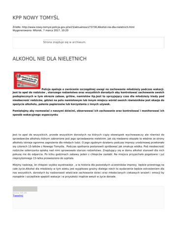 KPP NOWY TOMYŚL Źródło: http://www.nowy-tomysl.policja.gov.pl/w15/aktualnosci/73730,Alkohol-nie-dla-nieletnich.html Wygenerowano: Wtorek, 7 marca 2017, 10:20 Strona znajduje się w archiwum. ALKOHOL NIE DLA NIELETNICH Policja apeluje o zwrócenie szczególnej uwagi na zachowanie młodzieży podczas wakacji. Jest to apel do rodziców , starszego rodzeństwa oraz wszystkich dorosłych aby kontrolować zachowanie swoich podopiecznych w tym okresie zabaw, grilów, namiotów itp.Jest to sprzyjający czas dla młodzieży kiedy pod nieobecność rodziców, gdzieś na polu namiotowym lub innym miejscu wśród swoich rówieśników jest okazja do spożycia alkoholu, palenia papierosów lub korzystania z innych używek. Pamiętajmy aby rozmawiać z naszymi dziećmi, obserwować ich zachowanie oraz kontrolować i monitorować ich sposób wakacyjnego wypoczynku Jest to apel do wszystkich, przede wszystkim dorosłych na których ciąży obowiązek wychowawczy ale również do sprzedawców alkoholu którym zabronione jest jego sprzedawanie nieletnim. Jak się niedawno okazało to właśnie ze strony alkoholu istnieje ogromne zagrożenie dla młodych ludzi. O jego zgubnym działaniu podczas imprezy urodzinowej przekonało się czterech 15-latków z Nowego Tomyśla. Podczas spotkania postanowili spróbować jak smakuje wódka. Pod nieobecność rodziców solenizanta opiekę nad nimi sprawowało starsze rodzeństwo. Znajdujący się w domu alkohol stanowił dla nich pokusę nie do odparcia. Po kilku godzinach zabawy jeden z chłopców zasłabł. Na miejsce przyjechało pogotowie i już nieprzytomnego 15-latka przewieziono do szpitala. Miejmy nadzieję, że chłopiec szybko wyzdrowieje , a ta historia dla pozostałych uczestników imprezy będzie przestrogą na całe życie.Alkohol dla młodzieży w tym wieku jest wyjątkowo groźny dlatego niech to wydarzenie będzie ostrzeżeniem dla nas wszystkich, dorosłych by nadzorowali właściwie zachowanie dzieci oraz młodocianych ciekawych wrażeń i emocji by rozsądnie i szczęśliwie spędzili wakacje i w przyszłości mądrze weszli w życie dorosłe. Ocena: 0/5 (0) Tweetnij