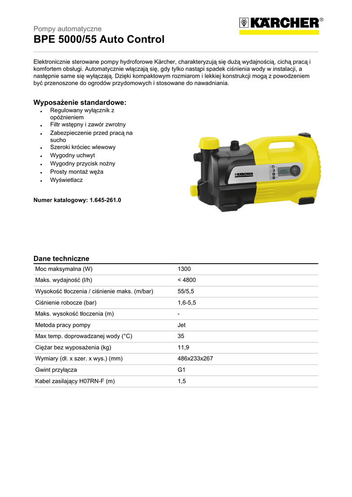 Pompy automatyczne BPE 5000/55 Auto Control Elektronicznie sterowane pompy hydroforowe Kärcher, charakteryzują się dużą wydajnością, cichą pracą i komfortem obsługi. Automatycznie włączają się, gdy tylko nastąpi spadek ciśnienia wody w instalacji, a następnie same się wyłączają. Dzięki kompaktowym rozmiarom i lekkiej konstrukcji mogą z powodzeniem być przenoszone do ogrodów przydomowych i stosowane do nawadniania. Wyposażenie standardowe: • • • • • • • • Regulowany wyłącznik z opóźnieniem Filtr wstępny i zawór zwrotny Zabezpieczenie przed pracą na sucho Szeroki króciec wlewowy Wygodny uchwyt Wygodny przycisk nożny Prosty montaż węża Wyświetlacz Numer katalogowy: 1.645-261.0 Dane techniczne Moc maksymalna (W) 1300 Maks. wydajność (l/h) < 4800 Wysokość tłoczenia / ciśnienie maks. (m/bar) 55/5,5 Ciśnienie robocze (bar) 1,6-5,5 Maks. wysokość tłoczenia (m) - Metoda pracy pompy Jet Max temp. doprowadzanej wody (°C) 35 Ciężar bez wyposażenia (kg) 11,9 Wymiary (dł. x szer. x wys.) (mm) 486x233x267 Gwint przyłącza G1 Kabel zasilający H07RN-F (m) 1,5 Szczegóły Opis Elektrycznie sterowane pompy hydroforowe są wydajne i mocne. Automatycznie włączają się i wyłączają, gdy tylko zachodzi taka potrzeba. Są lekkie i mają niewielkie rozmiary, co pozwala także na łatwe ich przenoszenie, na przykład do ogrodu, gdzie mogą służyć do podlewania roślin. Bezpieczne. Pompy hydroforowe są standardowo wyposażone w filtr wstępny. Chroni on pompę przed zanieczyszczeniami zwiększając tym samym bezpieczeństwo jej funkcjonowania. Przyjazne dla środowiska. Zostały skonstruowane zgodnie z zasadą redukcji poziomu hałasu. Dodatkowo czas opóźnienia, który ma na celu unikanie zbyt częstego włączania się pompy, można regulować wedle indywidualnych potrzeb. Wyposażone są we wziernik ułatwiający odpowietrzanie oraz zabezpieczenie przed pracą na sucho. BPE 5000/55 AUTO CON posiada czytelny wyświetlacz, który pomaga użytkownikowi, informując go m. in. o wydatku wody. Panel sterowana został stworzony z myślą o wygodnym użytkowaniu.rowana został stworzony z myślą o wygodnym użytkowaniu. Opcjonalne wyposażenie Adaptery / Przyłącza Przyłącz węża z zaworem zwrotnym, mały Przyłącz węża z zaworem zwrotnym zapewniający odporne na podciśnienie połączenie węża ssącego z pompą ogrodową lub wysokociśnieniową pompą do użytku domowego. Numer katalogowy 6.997-359.0 Zestaw przyłączeniowy, Basic Zestaw przyłączeniowy do podłączania węży ogrodowych do pomp ogrodowych oraz wysokociśnieniowych pomp do użytku domowego. Do łatwego łączenia węża z pompą. Numer katalogowy 6.997-358.0 Zestaw przyłączeniowy Zestaw do podłączenia węży ogrodowych do pomp ogrodowych i pomp wysokociśnieniowych do użytku domowego. Do łatwego łączenia węża z pompą. Numer katalogowy 6.997-340.0 Filtry Filtr do pomp z zaworem zwrotnym 3/4", Basic Filtr Basic z zaworem zwrotnym do połączenia z wężem 3/4" ciętym z metra. Numer katalogowy 6.997-345.0 Filtr do pomp z zaworem zwrotnym 1", Basic Filtr Basic z zaworem zwrotnym do połączenia z wężem 1" ciętym z metra. Numer katalogowy 6.997-342.0 Filtr do pomp z zaworem zwrotnym, Premium Filtr Premium z zaworem zwrotnym do połączenia z wężem ciętym z metra. Numer katalogowy 6.997-341.0 Filtry Filtr wody, duży Filtr wody chroni pompy ogrodowe i wysokociśnieniowe przed cząstkami zanieczyszczeń i piaskiem. Numer katalogowy 6.997-344.0 Pozostałe Wyłącznik pływakowy Wyłącznik pływakowy automatycznie włącza i wyłącza pompę w zależności od poziomu wody. Numer katalogowy 6.997-356.0 Wąż wyrównujący ciśnienie Wąż wyrównujący ciśnienie do podłączenia pomp ciśnieniowych do systemu sztywnych rur. Numer katalogowy 6.997-417.0 Węże ssące Wąż ssący "z metra", 3/4" Spiralny wąż w sprzedaży jako produkt "cięty z metra". Do podłączenia pomp zanurzeniowych, ogrodowych, ciśnieniowych pomp zanurzeniowych i pomp wysokociśnieniowych. Numer katalogowy 6.997-347.0 Wąż ssący "z metra", 1" Spiralny wąż w sprzedaży jako produkt "cięty z metra". Do podłączenia pomp zanurzeniowych, ogrodowych, ciśnieniowych pomp zanurzeniowych i pomp wysokociśnieniowych. Numer katalogowy 6.997-346.0 Wąż ssący do pomp, 3,5 m Gotowy do użycia, odporny na podciśnienie wąż spiralny do pomp ogrodowych i pomp wysokociśnieniowych. Odpowiedni jako przedłużenie węża ssącego lub do użycia z filtrami. Numer katalogowy 6.997-348.0 Węże ssące Zestaw węża ssącego, 3,5 m Kompletny, gotowy do użycia zestaw ze spiralnym wężem, filtrem oraz zaworem zwrotnym. Przeznaczony do pomp ogrodowych i pomp wysokociśnieniowych. Doskonały jako przedłużenie węża ssącego. Numer katalogowy 6.997-350.0 Zestaw węża ssącego, 7 m Kompletny, gotowy do użycia zestaw ze spiralnym wężem, filtrem oraz zaworem zwrotnym. Przeznaczony do pomp ogrodowych i pomp wysokociśnieniowych. Doskonały jako przedłużenie węża ssącego. Numer katalogowy 6.997-349.0 Wąż ssący do podłączenia z instalacją domową Gotowy do użycia, odporny na podciśnienie wąż ssący do podłączenia pomp do studni lub instalacji domowej po stronie ssącej. Przeznaczony do pomp wysokociśnieniowych do użytku domowego. Numer katalogowy 6.997-360.0