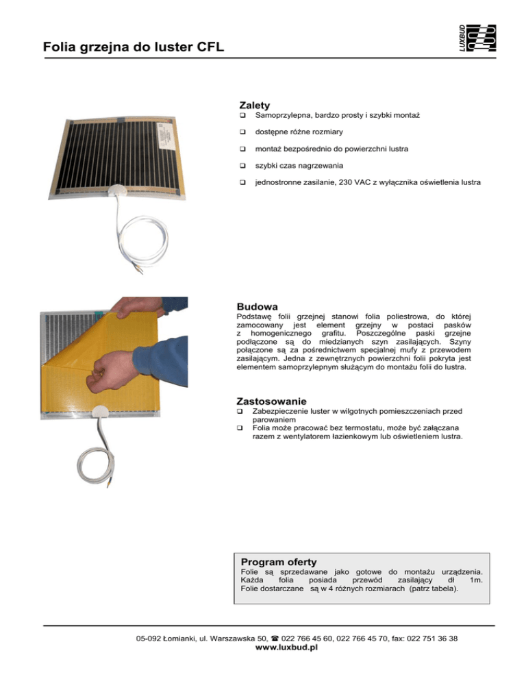 Folia grzejna do luster CFL Zalety Samoprzylepna, bardzo prosty i szybki montaż dostępne różne rozmiary montaż bezpośrednio do powierzchni lustra szybki czas nagrzewania jednostronne zasilanie, 230 VAC z wyłącznika oświetlenia lustra Budowa Podstawę folii grzejnej stanowi folia poliestrowa, do której zamocowany jest element grzejny w postaci pasków z homogenicznego grafitu. Poszczególne paski grzejne podłączone są do miedzianych szyn zasilających. Szyny połączone są za pośrednictwem specjalnej mufy z przewodem zasilającym. Jedna z zewnętrznych powierzchni folii pokryta jest elementem samoprzylepnym służącym do montażu folii do lustra. Zastosowanie Zabezpieczenie luster w wilgotnych pomieszczeniach przed parowaniem Folia może pracować bez termostatu, może być załączana razem z wentylatorem łazienkowym lub oświetleniem lustra. Program oferty Folie są sprzedawane jako gotowe do montażu urządzenia. Każda folia posiada przewód zasilający dł 1m. Folie dostarczane są w 4 różnych rozmiarach (patrz tabela). 05-092 Łomianki, ul. Warszawska 50, 022 766 45 60, 022 766 45 70, fax: 022 751 36 382 www.luxbud.pl Folia grzejna do luster CFL Dane techniczne CFL Zabezpieczenie luster przed parowaniem Jednostkowa moc grzejna: 200 W/m2 Napięcie znamionowe: 230 V AC +70 oC Max. wytrzymałość temperaturowa: Stopień ochrony IP 54 po zamontowaniu Długość przewodu zasilającego: 1m Grubość folii grzejnej: 0,4 mm Standardowe folie grzejne: Symbol Wymiary [mm] Moc [W] CFL-12,5 274 x 252 12,5 CFL-25 274 x 574 25 CFL-50 519 x 524 50 CFL-100 1004 x 524 100 05-092 Łomianki, ul. Warszawska 50, 022 766 45 60, 022 766 45 70, fax: 022 751 36 382 www.luxbud.pl