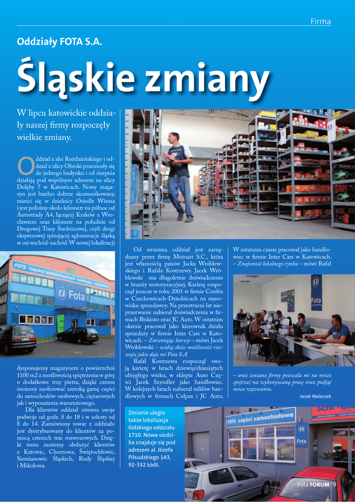 Firma Oddziały FOTA S.A. Śląskie zmiany W lipcu katowickie oddziały naszej firmy rozpoczęły wielkie zmiany. O ddział z alei Roździeńskiego i oddział z ulicy Obroki przeniosły się do jednego budynku i od sierpnia działają pod wspólnym adresem na ulicy Dulęby 7 w Katowicach. Nowy magazyn jest bardzo dobrze skomunikowany, mieści się w dzielnicy Osiedle Witosa i jest położny około kilometr na północ od Autostrady A4, łączącej Kraków z Wrocławiem oraz kilometr na południe od Drogowej Trasy Średnicowej, czyli drogi ekspresowej spinającej aglomeracje śląską w osi wschód-zachód. W nowej lokalizacji dysponujemy magazynem o powierzchni 1100 m2 z możliwością spiętrzenia w górę o dodatkowe trzy pietra, dzięki czemu możemy zaoferować szeroką gamę części do samochodów osobowych, ciężarowych jak i wyposażenia warsztatowego. Dla klientów oddział otwiera swoje podwoje od godz. 8 do 18 i w soboty od 8 do 14. Zamówiony towar z oddziału jest dystrybuowany do klientów za pomocą czterech tras rozwozowych. Dzięki temu możemy obsłużyć klientów z Katowic, Chorzowa, Świętochłowic, Siemianowic Śląskich, Rudy Śląskiej i Mikołowa. Od września oddział jest zarządzany przez firmę Motoart S.C., która jest własnością panów Jacka Wróblewskiego i Rafała Kostrzewy. Jacek Wróblewski ma długoletnie doświadczenie w branży motoryzacyjnej. Karierę rozpoczął jeszcze w roku 2001 w firmie Confex w Czechowicach-Dziedzicach na stanowisku sprzedawcy. Na przestrzeni lat nieprzerwanie nabierał doświadczenia w firmach Biskioto oraz JC Auto. W ostatnim okresie pracował jako kierownik działu sprzedaży w firmie Inter Cars w Katowicach. – Zmieniając barwy – mówi Jacek Wróblewski – widzę duże możliwości rozwoju jakie daje mi Fota S.A. Rafał Kostrzewa rozpoczął swoją karierę w latach dziewięćdziesiątych ubiegłego wieku, w sklepie Auto Części Jacek Szyndler jako handlowiec. W kolejnych latach nabierał szlifów handlowych w firmach Colpax i JC Auto. W ostatnim czasie pracował jako handlowiec w firmie Inter Cars w Katowicach. – Znajomość lokalnego rynku – mówi Rafał – oraz zmiana firmy pozwala mi na nowo spojrzeć na wykonywaną pracę oraz podjąć nowe wyzwania. Jacek Waleczek Zmianie uległa także lokalizacja łódzkiego oddziału 1710. Nowa siedziba znajduje się pod adresem al. Józefa Piłsudzkiego 143, 92-332 Łódź. Fota FORUM 9