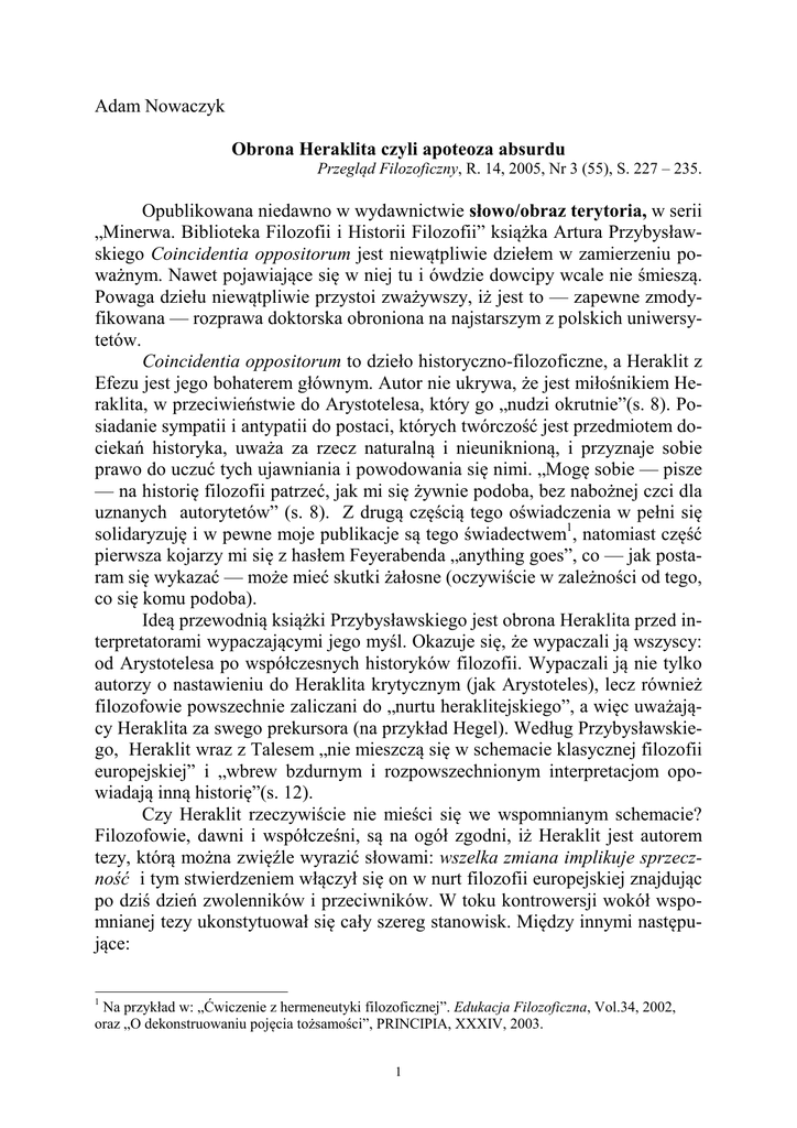 Adam Nowaczyk Obrona Heraklita czyli apoteoza absurdu Przegląd Filozoficzny, R. 14, 2005, Nr 3 (55), S. 227 – 235. Opublikowana niedawno w wydawnictwie słowo/obraz terytoria, w serii „Minerwa. Biblioteka Filozofii i Historii Filozofii” książka Artura Przybysławskiego Coincidentia oppositorum jest niewątpliwie dziełem w zamierzeniu poważnym. Nawet pojawiające się w niej tu i ówdzie dowcipy wcale nie śmieszą. Powaga dziełu niewątpliwie przystoi zważywszy, iż jest to — zapewne zmodyfikowana — rozprawa doktorska obroniona na najstarszym z polskich uniwersytetów. Coincidentia oppositorum to dzieło historyczno-filozoficzne, a Heraklit z Efezu jest jego bohaterem głównym. Autor nie ukrywa, że jest miłośnikiem Heraklita, w przeciwieństwie do Arystotelesa, który go „nudzi okrutnie”(s. 8). Posiadanie sympatii i antypatii do postaci, których twórczość jest przedmiotem dociekań historyka, uważa za rzecz naturalną i nieuniknioną, i przyznaje sobie prawo do uczuć tych ujawniania i powodowania się nimi. „Mogę sobie — pisze — na historię filozofii patrzeć, jak mi się żywnie podoba, bez nabożnej czci dla uznanych autorytetów” (s. 8). Z drugą częścią tego oświadczenia w pełni się solidaryzuję i w pewne moje publikacje są tego świadectwem1, natomiast część pierwsza kojarzy mi się z hasłem Feyerabenda „anything goes”, co — jak postaram się wykazać — może mieć skutki żałosne (oczywiście w zależności od tego, co się komu podoba). Ideą przewodnią książki Przybysławskiego jest obrona Heraklita przed interpretatorami wypaczającymi jego myśl. Okazuje się, że wypaczali ją wszyscy: od Arystotelesa po współczesnych historyków filozofii. Wypaczali ją nie tylko autorzy o nastawieniu do Heraklita krytycznym (jak Arystoteles), lecz również filozofowie powszechnie zaliczani do „nurtu heraklitejskiego”, a więc uważający Heraklita za swego prekursora (na przykład Hegel). Według Przybysławskiego, Heraklit wraz z Talesem „nie mieszczą się w schemacie klasycznej filozofii europejskiej” i „wbrew bzdurnym i rozpowszechnionym interpretacjom opowiadają inną historię”(s. 12). Czy Heraklit rzeczywiście nie mieści się we wspomnianym schemacie? Filozofowie, dawni i współcześni, są na ogół zgodni, iż Heraklit jest autorem tezy, którą można zwięźle wyrazić słowami: wszelka zmiana implikuje sprzeczność i tym stwierdzeniem włączył się on w nurt filozofii europejskiej znajdując po dziś dzień zwolenników i przeciwników. W toku kontrowersji wokół wspomnianej tezy ukonstytuował się cały szereg stanowisk. Między innymi następujące: 1 Na przykład w: „Ćwiczenie z hermeneutyki filozoficznej”. Edukacja Filozoficzna, Vol.34, 2002, oraz „O dekonstruowaniu pojęcia tożsamości”, PRINCIPIA, XXXIV, 2003. 1 (1) Wprawdzie zmiana implikuje sprzeczność, ale sprzeczności w bycie musiałaby odpowiadać sprzeczność w myśleniu, a ta jest nie przyjęcia. Zatem żadna zmiana nie jest możliwa (Parmenides). (2) Zmiana (stawanie się) rzeczywiście implikuje sprzeczność, zatem pełnych prawd (spekulatywnych) o rzeczywistości nie da wypowiedzieć inaczej, jak za pomocą zdań sprzecznych (Hegel). (3) Zmiana implikuje sprzeczność, ale sprzeczność ta nie jest ontologicznym korelatem sprzeczności logicznej, lecz rodzajem przeciwieństw lub przeciwstawnych tendencji (cywilizowani marksiści, np. A. Schaff). (4) Zmiana nie implikuje sprzeczności. Wszelką zmianę można opisać w sposób koherentny tj. respektując logiczną zasadę niesprzeczności (Arystoteles i prawie cała racjonalistyczna tradycja filozofii europejskiej). Z powyższego wyliczenia wynika, że Heraklit ma zapewnioną ważną pozycję w dziejach filozofii europejskiej i jego zasługi jako inspiratora istotnego i trwałego wątku dociekań filozoficznych są nie do zakwestionowania. Tymczasem Przybysławski usiłuje nas przekonać, że Heraklit nie ma z tym wszystkim nic wspólnego, że jest postacią „z innej opowieści”, a — jak się okazuje — z postmodernistycznej komedii pisanej pod natchnieniem płynącym z dzieł Paula de Mana i Jacquesa Derridy. Postać ta wypowiada szereg sprzeczności, ale wyłącznie po to, aby podważyć naszą wiarę w istnienie rzeczy, oraz w to, że nasz język o czymś mówi. Utrzymuje ona, że wprawdzie ma miejsce stawanie się, ale nawet ono musi pozostać nienazwane, ponieważ posłużenie się nazwą „stawanie” błędnie sugerowałoby, że jest to nazwa pewnego przedmiotu. Można się zgodzić, że Heraklit i heraklitejczycy mają wiele wspólnego z postmodernizmem. Potwierdza to opinia, jaką im wystawił Platon w Teajtecie2, która przystaje do postmodernistów jak kostium szyty na miarę. Jednakże pasowanie Heraklita na prekursora współczesnego antyrealizmu daje się wyjaśnić tylko skłonnością do przedstawiania historii filozofii w sposób przez Przybysławskiego deklarowany, czyli „jak mi się żywnie podoba”. „Ostateczną konkluzją Heraklita jest więc milczenie” (s. 9) — oto wynik wysiłków Przybysławskiego nad rozszyfrowaniem myśli Heraklita. Jak wiadomo, do tego samego wniosku doszedł znacznie wcześniej Kratylos, który sądził, że wszystko zmienia się tak szybko, że zanim coś powiemy, już to przestaje odpowiadać rzeczywistości. Argumentacja Przybysławskiego jest niewątpliwie bardziej wyrafinowana i dlatego warto się jej przyjrzeć. Punktem wyjścia jest oskarżenie Arystotelesa o negowanie „prostego faktu historycznego”. Oto Arystoteles powiada (w Metafizyce), że: „Jest bowiem niemożliwe, ażeby mógł ktoś sądzić, że ta sama rzecz istnieje i nie istnieje, jak, zdaniem pewnych filozofów twierdził Heraklit.” Tymczasem — utrzymuje Przybysławski — „Heraklit rzeczywiście tak sądził, tak twierdził i tak pisał” (s. 52). Heraklit jest zatem przypadkiem obalającym ogólną tezę Arystotelesa. 