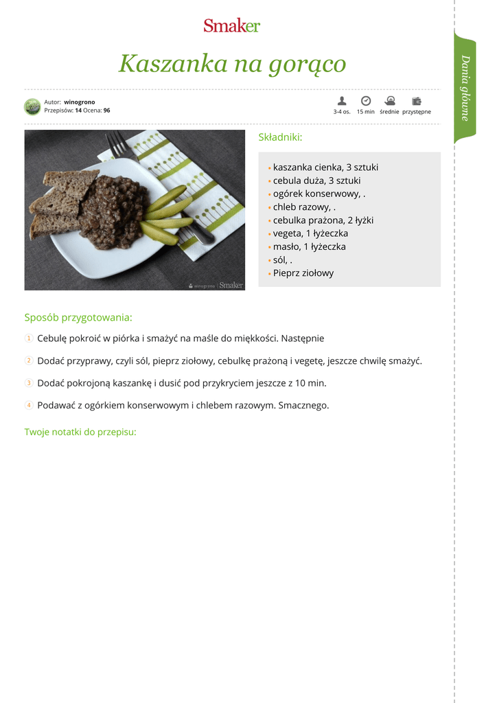 Kaszanka na gorąco Autor: winogrono Przepisów: 14 Ocena: 96 3-4 os. 15 min średnie przystępne Składniki: kaszanka cienka, 3 sztuki cebula duża, 3 sztuki ogórek konserwowy, . chleb razowy, . cebulka prażona, 2 łyżki vegeta, 1 łyżeczka masło, 1 łyżeczka sól, . Pieprz ziołowy Sposób przygotowania: 1 Cebulę pokroić w piórka i smażyć na maśle do miękkości. Następnie 2 Dodać przyprawy, czyli sól, pieprz ziołowy, cebulkę prażoną i vegetę, jeszcze chwilę smażyć. 3 Dodać pokrojoną kaszankę i dusić pod przykryciem jeszcze z 10 min. 4 Podawać z ogórkiem konserwowym i chlebem razowym. Smacznego. Twoje notatki do przepisu: