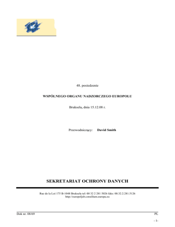 48. posiedzenie WSPÓLNEGO ORGANU NADZORCZEGO EUROPOLU Bruksela, dnia 15.12.08 r. Przewodniczący: David Smith SEKRETARIAT OCHRONY DANYCH Rue de la Loi 175 B-1048 Bruksela tel: 00 32 2 281 5026 faks: 00.32.2.281.5126 http://europoljsb.consilium.europa.eu Dok nr. 08/69 PL - 1- SPIS TREŚCI Uczestnicy........................................................................................................................................3 OMAWIANE PUNKTY.................................................................................................................4 1. Nominacje w Komisji Odwoławczej .......................................................................4 2. Nowa podstawa prawna Europolu .........................................................................4 3. Projekt aktu prawnego dotyczącego opracowania funkcji indeksu oraz dostępu do niego.....................................................................................................4 4. Projekt przepisów dotyczących stowarzyszenia z AWF..........................................4 5. Regulamin WON.....................................................................................................4 6. OASIS .....................................................................................................................4 7. AWF........................................................................................................................4 8. SIENA .....................................................................................................................4 9. Europol i przetwarzanie danych.............................................................................5 10. Sprawozdanie z działalności 2006-2008 ................................................................5 11. Kontrola w 2009 r. .................................................................................................5 Dok nr. 08/69 PL - 2- Uczestnicy Austria Litwa Gregor KÖNIG Rita VAITKEVIČIENĖ Belgia Neringa KAKTAVIČIŪTĖ-MICKIENĖ Priscilla de LOCHT Luksemburg Bułgaria Pierre WEIMERSKIRCH Veselin TSELKOV Malta Cypr David CAUCHI Louiza MARKIDOU Holandia Czechy Laetitia KRÖNER Miroslava MATOUŠOVÁ Polska Dania Piotr DROBEK Jens HARKOV HANSEN Portugalia Sten HANSEN Isabel CRUZ Tina Susanne NIELSEN Clara GUERRA Estonia Rumunia Taago PÄHKEL Georgeta BASARABESCU Pŏlma KŰLLIKE George GRIGORE Finlandia Słowacja Heikki HUHTINIEMI Peter LIESKOVSKÝ Francja Tomaš MIČO Georges de LA LOYÈRE Słowenia Lim LAURENT Alenka JERŠE Niemcy Hiszpania Wolfgang Von POMMER ESCHE Marta AGUIRRE CALZADA Angelika SCHRIEVER-STEINBERG Szwecja Grecja Agneta RUNMARKER Dina KAMPOURAKI Wielka Brytania Grigorios LAZARAKOS David SMITH (przewodniczący) Węgry Jonathan BAMFORD Ágnes PAJÓ Irlandia Diarmuid HALLINAN Włochy Vanna PALUMBO Łotwa - Dok nr. 08/69 PL - 3- OMAWIANE PUNKTY 1. Nominacje w Komisji Odwoławczej Pan András Jóri z delegacji węgierskiej został mianowany członkiem Komisji Odwoławczej. Pani Susanne Nielsen z delegacji duńskiej została mianowana zastępcą członka Komisji Odwoławczej (począwszy od 1 stycznia 2009 r.). Ms. Elizabeth Wallin z delegacji szwedzkiej została mianowana zastępcą członka Komisji Odwoławczej. 2. Nowa podstawa prawna Europolu Sekretariat powiadomił członków WON o ostatnich zmianach związanych z decyzją Rady ustanawiającą Europejski Urząd Policji. 3. Projekt aktu prawnego dotyczącego opracowania funkcji indeksu oraz dostępu do niego Sekretariat powiadomił WON o ostatnich zmianach dotyczących projektu aktu prawnego w zakresie opracowania funkcji indeksu oraz dostępu do niego. Dyskusja skoncentrowała się na wymogach dotyczących logowania do ukrytych rezultatów wyszukiwania. 4. Projekt przepisów dotyczących stowarzyszenia z AWF WON przedyskutował sprawę projektu przepisów dotyczących stowarzyszenia z AWF. WON uzgodnił, że Europol powinien powiadomić WON o wszelkich zmianach związanych z konkretną umową stowarzyszeniową. 5. Regulamin WON Zgodnie z art. 34 ust. 7 decyzji Rady ustanawiającej Europejski Urząd Policji (wejście w życie przewidziane na 1 stycznia 2010 r.) WON musi przyjąć własny regulamin, który następnie zostanie przedłożony Radzie do zatwierdzenia. Nowy regulamin zastąpi obecny regulamin. Podczas spotkania WON omówił konieczne zmiany odnośnie do procedury, w szczególności w miejscu, gdzie obecne przepisy pozwalają WON i Komisji Odwoławczej na podjęcie szybkich i skutecznych działań. 6. OASIS WON otrzymał informacje na temat najnowszych zmian odnoszących się do projektu OASIS. 7. AWF WON omówił odpowiedź Europolu na wysłane przez siebie pismo dotyczące polecenia otwarcia AWF i zakwestionował istotę niektórych danych do celów AWF. Podczas dyskusji poruszono również kwestię roli i celu polecenia otwarcia oraz konieczność weryfikacji całej metody. 8. SIENA Sekretariat powiadomił WON o ostatnich zmianach dotyczących projektu SIENA i następstwach w sferze Dok nr. 08/69 PL - 4- ochrony danych, które zostały omówione podczas spotkania w Europolu w dniu 24 listopada 2008 r. 9. Europol i przetwarzanie danych WON omówił kwestię zgodności szczególnych form przetwarzania danych osobowych z ramami prawnymi w świetle obecnych i przyszłych projektów dotyczących kwestii danych osobowych. WON podtrzymał stanowisko, na którym stał już w 2004 r., że Europol w zasadzie nie jest upoważniony do przetwarzania danych osobowych do celów operacyjnych wykraczających poza elementy systemu, o których mowa w artykule 6 (po wprowadzeniu nowego artykułu 6A konwencja zezwala na to pod pewnymi warunkami. Dane te przeznaczone są do przetwarzania do celów określonych w tym artykule). 10. Sprawozdanie z działalności 2006-2008 Tekst sprawozdania z działalności została przyjęty i zostanie wysłany do tłumaczenia. 11. Kontrola w 2009 r. WON omówił kwestię mandatu i zakres następnej kontroli w 2009 r. ora
