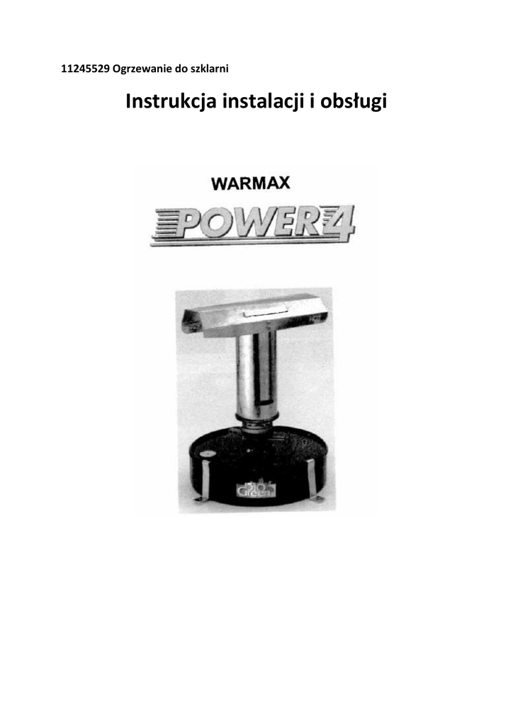 11245529 Ogrzewanie do szklarni Instrukcja instalacji i obsługi Instalacja Dane techniczne Typ urządzenia: Rodzaj oleju parafinowego: Pojemność zbiornika: Zużycie paliwa: Moc: Czas palenia: Wymiary: (dł. x szer. x wys.) WARMAX Power 4 Premium ok. 4,5 l 0,027 litra/h 300 W max. 7 dni 300/300/410 mm WAŻNE: Przed instalacją urządzenia należy dokładnie zapoznać się z instrukcją oraz przestrzegać jej zaleceń. Instrukcję należy przechowywać tak, aby móc do niej zajrzeć w późniejszym czasie. W razie wystąpienia wątpliwości, co do bezpiecznego korzystania z urządzenia, należy porozumieć się ze specjalistą. Informacje ogólne Po rozpakowaniu a przed uruchomieniem urządzenia upewnij się, że urządzenie oraz wszystkie elementy wyposażenia dodatkowego są kompletne oraz nieuszkodzone. Jeśliby doszło do uszkodzenia w trakcie transportu, należy się natychmiast zwrócić do odpowiedniego dystrybutora lub do producenta. Materiały z opakowania (plastikową torebkę, polistyrol, zszywki itp.) nie mogą zostać pozostawione w pobliżu dzieci, ponieważ stanowią źródło niebezpieczeństwa. Dotyczy to także drobnych części, wchodzących w skład urządzenia, które mogą zostać połknięte. Wskazówki dotyczące bezpieczeństwa i ewentualnych niebezpieczeństw Jeśli masz wątpliwości, co do pracy urządzenia lub jego bezpieczeństwa, zwróć się do specjalisty. Jeśli urządzenie przez dłuższy czas nie jest używane, usuń z niego pozostały olej parafinowy. Urządzenie jest przeznaczone do korzystania z niego w szklarni. Minimalny odstęp od palnych elementów musi wynosić min. 60 cm. Urządzenie musi zostać postawione na podłożu stabilnym, odpornym na wysokie temperatury, niepalnym. Uwaga! Obudowa, mimo szlifowania, może ciągle jeszcze mieć ostre brzegi. Ryzyko skaleczenia! Olej parafinowy, który się rozleje, musi zostać starannie wytarty. W przeciwnym razie istnieje ryzyko powstania pożaru! Postaw urządzenie w szklarni tam, gdzie zapewniona jest dobra cyrkulacja powietrza. Urządzenie nie powinno być jednak narażone na działnie przeciągu, który mógłby zdmuchnąć płomień. Urządzenie nie nadaje się do hodowli orchidei i kaktusów, ponieważ niektóre orchidee nie znoszą nasycenia CO2. Zasięgnij porady swojego ogrodnika. Uwaga! Obudowa urządzenia mocno się rozgrzewa. Przed przeniesieniem urządzenia pozwól, aby całkowicie ostygło. Urządzenie nie nadaje się do wykorzystania do ogrzewania mieszkań ani pomieszczeń, w których są hodowane zwierzęta. Należy utrzymywać element palny w czystości. Nie przenoś palącego się grzejnika, podobnie nie dolewaj paliwa, gdy urządzenie jest uruchomione. Ryzyko powstania pożaru! Korzystaj z oleju parafinowego klasy Premium. Nie wolno korzystać z żadnych innych palnych cieczy ani paliw (np. oleju do lamp). Nie pozwól, aby do zbiornika na paliwo dostała się woda. Nie wolno używać ogrzewacza w roli kuchenki. Nie pozostawiaj pracującego ogrzewacza przez zbyt długi czas bez nadzoru. Niniejsza instrukcja obsługi stanowi integralną część urządzenia i powinna być starannie przechowywana. Jeśli urządzenie będzie przekazywane kolejnym osobom, należy dołączyć do niego instrukcje obsługi. W firmach, korzystających z ogrzewacza, muszą być stosowane przepisy BHP rzemieślniczych związków zawodowych. Jeśli nie będziesz miec pewności, co do prawidłowego działania urządzenia lub jeśli pojawią się pytania, na które nie znajdziesz odpowiedzi w instrukcji obsługi, skontaktuj się z producentem lub sprzedawcą. W pobliżu urządzenia nie wolno przechowywać, ani korzystać z palnych substancji ani sprayów. Ryzyko powstania pożaru! Z urządzenia nie wolno korzystać w atmosferze łatwopalnej (np. w pobliżu gazu palnego ani pojemników ze sprayem). Ryzyko eksplozji i pożaru! Nie przykrywaj grzejnika. Ryzyko powstania pożaru! Nigdy nie susz palnych przedmiotów przy otworach urządzenia. Ryzyko powstania pożaru! Podczas korzystania z urządzenia jego obudowa mocno się rozgrzewa. Urządzenie należ y zainstalować tak, aby uniknąć przypadkowego kontaktu z urządzeniem. Ryzyko poparzenia! Urządzenie po wyłączeniu go stygnie dość powoli. Urządzenie nie jest przeznaczone do korzystania z niego przez osoby z ograniczonymi zdolnościami cielesnymi, ruchowymi lub mentalnymi, dotyczy to również osób, którym brak jest doświadczenia i wiedzy w obchodzeniu się z tego typu urządzeniami, chyba, że będą one nadzorowane przez osoby, odpowiedzialne za ich bezpieczeństwo, które będa im udzielać wskazówek, dotyczących korzystania z urządzenia. Obsługa urządzenia 1. Napełnij zbiornik urządzenia 4,5 litrami oleju parafinowego klasy Premium. Pozostaw w zbiorniku 10 mm wolnej przestrzeni. 2. Knot potrzebuje ok. godziny, aby nasiąknąć olejem. Nigdy nie zapalaj suchego knota. 3. Postaw urządzenie w takim miejscu, w którym będzie chronione przed popychaniem. Odstęp od palnych przedmiotów powinien wynosić co najmniej 30 cm. 4. Zabezpiecz urządzenie na podłożu, korzystając z klamr, które należy rozmieścić równomiernie wokół urządzenia i przykręcić je do podłoża. 5. Podpal knot, gdy nie jest on zbyt wysunięty. 6. Nałóż komin i pokrywę tak, jak pokazano na rys. nr 3 i przymocuj je do zbiornika. Sprawdź wysokość płomienia po ok. 5 minutach i ponownie po ok. 15 minutach. Jeśli powstanie zbyt dużo dymu, skoryguj wysokośc płomienia przy pomocy pokrętła. Wysokość płomienia nie może przekraczać środkowej części elementu palnego. Ustawienie wyższego płomienia prowadzi do wysuszenia knota i do tworzenia się dymu. Aby zgasić płomień, skręć całkowicie knot i zdmuchnij płomień. Nadmiar sadzy na knocie należy usunąć miękką szczoteczką lub ściereczką. Podczas palenia się knota należy zapewnić wystarczające wietrzenie. W przeciwnym razie płomień nie otrzyma wystarczającej ilości tlenu i zgaśnie. 