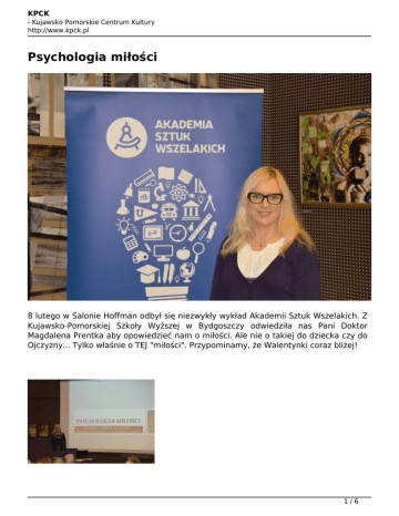 KPCK - Kujawsko Pomorskie Centrum Kultury http://www.kpck.pl Psychologia miłości 8 lutego w Salonie Hoffman odbył się niezwykły wykład Akademii Sztuk Wszelakich. Z Kujawsko-Pomorskiej Szkoły Wyższej w Bydgoszczy odwiedziła nas Pani Doktor Magdalena Prentka aby opowiedzieć nam o miłości. Ale nie o takiej do dziecka czy do Ojczyzny... Tylko właśnie o TEJ "miłości". Przypominamy, że Walentynki coraz bliżej! 1/6 KPCK - Kujawsko Pomorskie Centrum Kultury http://www.kpck.pl 2/6 KPCK - Kujawsko Pomorskie Centrum Kultury http://www.kpck.pl 3/6 KPCK - Kujawsko Pomorskie Centrum Kultury http://www.kpck.pl 4/6 KPCK - Kujawsko Pomorskie Centrum Kultury http://www.kpck.pl Metryczka newsu: Opublikował – Julian Waszak, dnia 10.02.2017 Kontakt – [email protected], tel. 52 585 15 01 Facebook – zapraszamy do polubienia PIMu na Facebooku Kalendarz – zapraszamy do subskrybowania wydarzeń PIMu Zdjęcia – zapraszamy do obejrzenia naszych albumów na Facebooku Filmy – zapraszamy do obejrzenia naszych filmów na Facebooku Polecamy – portal kulturawzasiegu.pl Zastrzeżenie – treści publikowane na (tej) stronie internetowej przez jej autorów w rozumieniu przepisów ustawy o prawie autorskim i prawach pokrewnych z dnia 4 lutego 1994 r. (t. j. Dz. U. z 2015 r., poz. 1923 z późn. zm.) podlegają ochronie przewidzianej w tej ustawie. Komentarze – informujemy, że nie ponosimy odpowiedzialności za treść 5/6 KPCK - Kujawsko Pomorskie Centrum Kultury http://www.kpck.pl zamieszczanych komentarzy. Dane dotyczące IP mogą być udostępniane prokuraturze, sądowi lub organom ścigania na ich wniosek. 6/6 Powered by TCPDF (www.tcpdf.org)