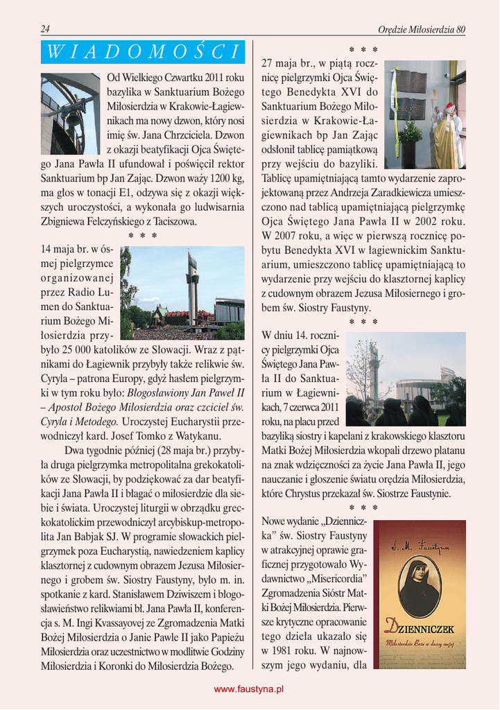 24 Orędzie Miłosierdzia 80 WIADOMOŚCI Od Wielkiego Czwartku 2011 roku bazylika w Sanktuarium Bożego Miłosierdzia w Krakowie-Łagiewnikach ma nowy dzwon, który nosi imię św. Jana Chrzciciela. Dzwon z okazji beatyfikacji Ojca Świętego Jana Pawła II ufundował i poświęcił rektor Sanktuarium bp Jan Zając. Dzwon waży 1200 kg, ma głos w tonacji E1, odzywa się z okazji większych uroczystości, a wykonała go ludwisarnia Zbigniewa Felczyńskiego z Taciszowa. * * * 14 maja br. w ósmej pielgrzymce organizowanej przez Radio Lumen do Sanktuarium Bożego Miłosierdzia przybyło 25 000 katolików ze Słowacji. Wraz z pątnikami do Łagiewnik przybyły także relikwie św. Cyryla – patrona Europy, gdyż hasłem pielgrzymki w tym roku było: Błogosławiony Jan Paweł II – Apostoł Bożego Miłosierdzia oraz czciciel św. Cyryla i Metodego. Uroczystej Eucharystii przewodniczył kard. Josef Tomko z Watykanu. Dwa tygodnie później (28 maja br.) przybyła druga pielgrzymka metropolitalna grekokatolików ze Słowacji, by podziękować za dar beatyfikacji Jana Pawła II i błagać o miłosierdzie dla siebie i świata. Uroczystej liturgii w obrządku greckokatolickim przewodniczył arcybiskup-metropolita Jan Babjak SJ. W programie słowackich pielgrzymek poza Eucharystią, nawiedzeniem kaplicy klasztornej z cudownym obrazem Jezusa Miłosiernego i grobem św. Siostry Faustyny, było m. in. spotkanie z kard. Stanisławem Dziwiszem i błogosławieństwo relikwiami bł. Jana Pawła II, konferencja s. M. Ingi Kvassayovej ze Zgromadzenia Matki Bożej Miłosierdzia o Janie Pawle II jako Papieżu Miłosierdzia oraz uczestnictwo w modlitwie Godziny Miłosierdzia i Koronki do Miłosierdzia Bożego. * * * 27 maja br., w piątą rocznicę pielgrzymki Ojca Świętego Benedykta XVI do Sanktuarium Bożego Miłosierdzia w Krakowie-Łagiewnikach bp Jan Zając odsłonił tablicę pamiątkową przy wejściu do bazyliki. Tablicę upamiętniającą tamto wydarzenie zaprojektowaną przez Andrzeja Zaradkiewicza umieszczono nad tablicą upamiętniającą pielgrzymkę Ojca Świętego Jana Pawła II w 2002 roku. W 2007 roku, a więc w pierwszą rocznicę pobytu Benedykta XVI w łagiewnickim Sanktuarium, umieszczono tablicę upamiętniającą to wydarzenie przy wejściu do klasztornej kaplicy z cudownym obrazem Jezusa Miłosiernego i grobem św. Siostry Faustyny. * * * W dniu 14. rocznicy pielgrzymki Ojca Świętego Jana Pawła II do Sanktuarium w Łagiewnikach, 7 czerwca 2011 roku, na placu przed bazyliką siostry i kapelani z krakowskiego klasztoru Matki Bożej Miłosierdzia wkopali drzewo platanu na znak wdzięczności za życie Jana Pawła II, jego nauczanie i głoszenie światu orędzia Miłosierdzia, które Chrystus przekazał św. Siostrze Faustynie. * * * Nowe wydanie „Dzienniczka” św. Siostry Faustyny w atrakcyjnej oprawie graficznej przygotowało Wydawnictwo „Misericordia” Zgromadzenia Sióstr Matki Bożej Miłosierdzia. Pierwsze krytyczne opracowanie tego dzieła ukazało się w 1981 roku. W najnowszym jego wydaniu, dla www.faustyna.pl październik, listopad, grudzień 2011 25 lepszego czytania tekstu, słowa Pana Jezusa zostały oznaczone tłustym drukiem, rozwiązane skróty i przypisy umieszczono pod tekstem. „Dzienniczek” pisany na polecenie Jezusa należy do pereł literatury mistycznej, stanowi zapis życia duchowego św. Siostry Faustyny i orędzia Miłosierdzia, które przekazała światu. Poprzez pryzmat doświadczeń mistycznych Apostołki Bożego Miłosierdzia odsłania miłosierną miłość Boga do człowieka. Słowa w nim zapisane jawią się jako szczególna Ewangelia miłosierdzia Bożego – jak o tym dziele powiedział Ojciec Święty Jan Paweł II. * * * Po raz pierwszy w języku polskim „Dzienniczek” św. Siostry Faustyny wyszedł w formie audiobooka, by także w tej postaci do ludzkich serc docierała miłosierna miłość Boga, rodząc i rozwijając zaufanie do Niego i pragnienie przemienienia swego życia w duchu miłosierdzia. Wydanie przygotowała Fundacja Divine Mercy. Lektorzy: Anna Majewska-Owczarek i Rafał Porzeziński. * * * Wydawnictwo „Misericordia” opublikowało na płytach DVD pierwszą i drugą serię „Rozmów o Miłosierdziu”. Programy powstały we współpracy Zgromadzenia Sióstr Matki Bożej Miłosierdzia z TVP Kraków. W pierwszej serii zatytułowanej: „Życie św. Faustyny” (16 odc.) w żywych dialogach o. Jana Marii Szewka OFMConv z s. M. Elżbietą Siepak ZMBM i s. M. Gaudią Skass ZMBM oraz Włodzimierzem Dudką, ubogaconych materiałami archiwalnymi i współczesny- mi, została opowiedziana historia życia najsłynniejszej polskiej mistyczki i Apostołki Bożego Miłosierdzia. Druga seria (11 odcinków) nosi tytuł „Prorocka misja św. Faustyny” i opowiada o misji Miłosierdzia, z którą Jezus wysłał ją do całego świata. Kolejne serie „Rozmów o Miłosierdziu” na płytach DVD, to „Szkoła duchowości św. Siostry Faustyny” i „Spacery po Łagiewnikach”, które ukażą się po emisji telewizyjnej. * * * Godna polecenia jest także książka biblistki Danuty Piekarz zatytułowana „Paweł zdobyty przez Miłosierdzie”, która ukazała się w Wydawnictwie „Misericordia”. Książka jest zapisem konferencji wygłoszonych w Roku św. Pawła (2008/2009) dla członków stowarzyszenia „Faustinum”. Klimat lectio divina, połączenie głębi i prostoty, stosowanie zasady wyjaśniania Biblii przez Biblię, czytanie z wiarą i troską o współczesnego czytelnika, dochodzenie od sensu dosłownego do sensu duchowego, który zaprasza do osobistej medytacji – tak w słowie wstępnym charakteryzuje tę książkę ks. Tomasz Jaklewicz. Natomiast w Wydawnictwie Apostolstwa Modlitwy ukazała się książka ks. Marka Wójtowicza SJ „Święci z charakterem na każdy dzień roku”. Wśród świętych z całej historii Kościoła jest także św. Siostra Faustyna. Książka napisana językiem przystępnym, ładnie