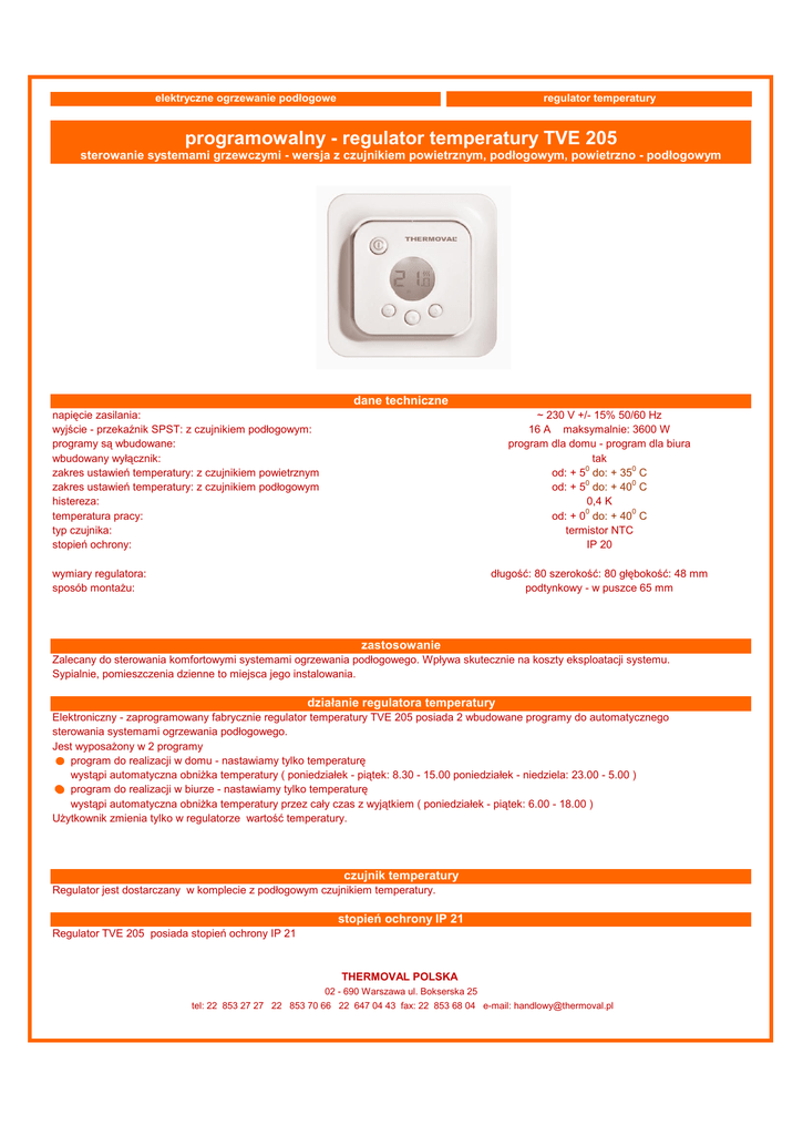 elektryczne ogrzewanie podłogowe regulator temperatury 1 programowalny - regulator temperatury TVE 205 sterowanie systemami grzewczymi - wersja z czujnikiem powietrznym, podłogowym, powietrzno - podłogowym dane techniczne napięcie zasilania: wyjście - przekaźnik SPST: z czujnikiem podłogowym: programy są wbudowane: wbudowany wyłącznik: zakres ustawień temperatury: z czujnikiem powietrznym zakres ustawień temperatury: z czujnikiem podłogowym histereza: temperatura pracy: typ czujnika: stopień ochrony: ~ 230 V +/- 15% 50/60 Hz 16 A maksymalnie: 3600 W program dla domu - program dla biura tak od: + 50 do: + 350 C od: + 50 do: + 400 C 0,4 K od: + 00 do: + 400 C termistor NTC IP 20 długość: 80 szerokość: 80 głębokość: 48 mm podtynkowy - w puszce 65 mm wymiary regulatora: sposób montażu: zastosowanie Zalecany do sterowania komfortowymi systemami ogrzewania podłogowego. Wpływa skutecznie na koszty eksploatacji systemu. Sypialnie, pomieszczenia dzienne to miejsca jego instalowania. działanie regulatora temperatury Elektroniczny - zaprogramowany fabrycznie regulator temperatury TVE 205 posiada 2 wbudowane programy do automatycznego sterowania systemami ogrzewania podłogowego. Jest wyposażony w 2 programy program do realizacji w domu - nastawiamy tylko temperaturę wystąpi automatyczna obniżka temperatury ( poniedziałek - piątek: 8.30 - 15.00 poniedziałek - niedziela: 23.00 - 5.00 ) program do realizacji w biurze - nastawiamy tylko temperaturę wystąpi automatyczna obniżka temperatury przez cały czas z wyjątkiem ( poniedziałek - piątek: 6.00 - 18.00 ) Użytkownik zmienia tylko w regulatorze wartość temperatury. czujnik temperatury Regulator jest dostarczany w komplecie z podłogowym czujnikiem temperatury. stopień ochrony IP 21 Regulator TVE 205 posiada stopień ochrony IP 21 THERMOVAL POLSKA 02 - 690 Warszawa ul. Bokserska 25 tel: 22 853 27 27 22 853 70 66 22 647 04 43 fax: 22 853 68 04 e-mail: [email protected]