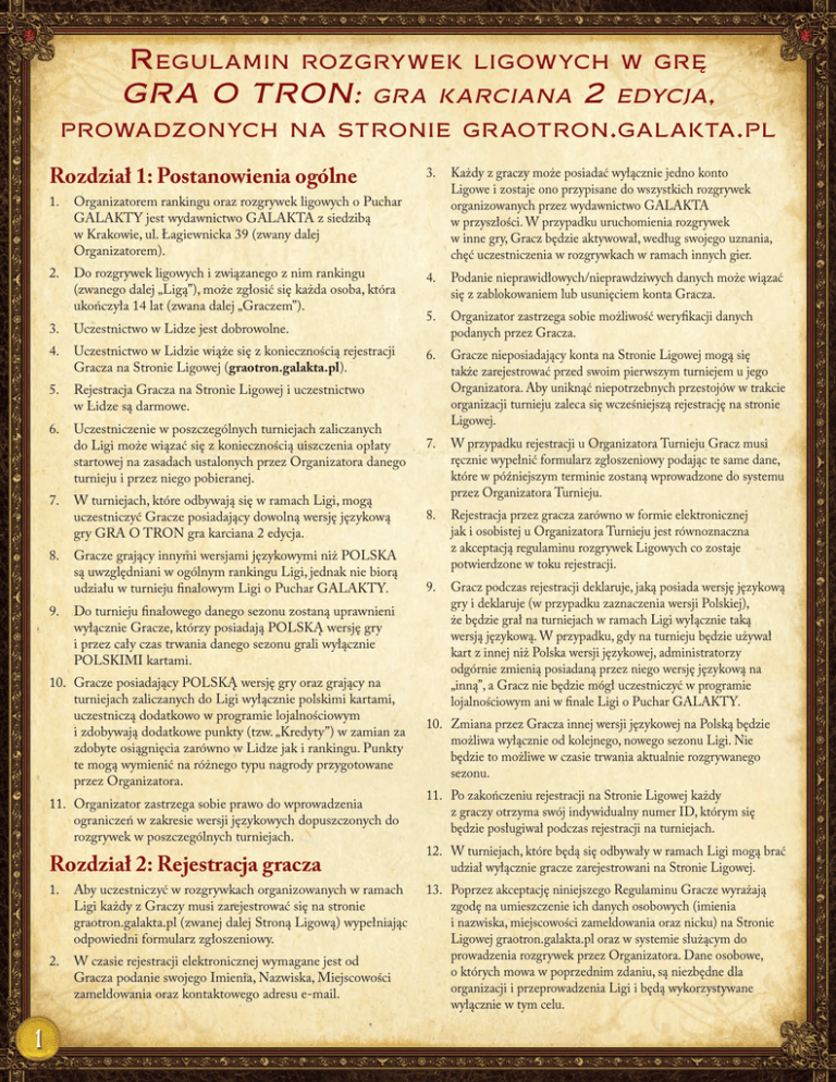 Regulamin rozgrywek ligowych w grę GRA O TRON: gra karciana 2 edycja, prowadzonych na stronie graotron.galakta .pl Rozdział 1: Postanowienia ogólne 1. Organizatorem rankingu oraz rozgrywek ligowych o Puchar GALAKTY jest wydawnictwo GALAKTA z siedzibą w Krakowie, ul. Łagiewnicka 39 (zwany dalej Organizatorem). 2. Do rozgrywek ligowych i związanego z nim rankingu (zwanego dalej „Ligą”), może zgłosić się każda osoba, która ukończyła 14 lat (zwana dalej „Graczem”). 3. Uczestnictwo w Lidze jest dobrowolne. 4. Uczestnictwo w Lidzie wiąże się z koniecznością rejestracji Gracza na Stronie Ligowej (graotron.galakta.pl). 5. Rejestracja Gracza na Stronie Ligowej i uczestnictwo w Lidze są darmowe. 6. Uczestniczenie w poszczególnych turniejach zaliczanych do Ligi może wiązać się z koniecznością uiszczenia opłaty startowej na zasadach ustalonych przez Organizatora danego turnieju i przez niego pobieranej. 7. W turniejach, które odbywają się w ramach Ligi, mogą uczestniczyć Gracze posiadający dowolną wersję językową gry GRA O TRON gra karciana 2 edycja. 8. Gracze grający innymi wersjami językowymi niż POLSKA są uwzględniani w ogólnym rankingu Ligi, jednak nie biorą udziału w turnieju finałowym Ligi o Puchar GALAKTY. 9. Do turnieju finałowego danego sezonu zostaną uprawnieni wyłącznie Gracze, którzy posiadają POLSKĄ wersję gry i przez cały czas trwania danego sezonu grali wyłącznie POLSKIMI kartami. 10. Gracze posiadający POLSKĄ wersję gry oraz grający na turniejach zaliczanych do Ligi wyłącznie polskimi kartami, uczestniczą dodatkowo w programie lojalnościowym i zdobywają dodatkowe punkty (tzw. „Kredyty”) w zamian za zdobyte osiągnięcia zarówno w Lidze jak i rankingu. Punkty te mogą wymienić na różnego typu nagrody przygotowane przez Organizatora. 11. Organizator zastrzega sobie prawo do wprowadzenia ograniczeń w zakresie wersji językowych dopuszczonych do rozgrywek w poszczególnych turniejach. Rozdział 2: Rejestracja gracza 1. Aby uczestniczyć w rozgrywkach organizowanych w ramach Ligi każdy z Graczy musi zarejestrować się na stronie graotron.galakta.pl (zwanej dalej Stroną Ligową) wypełniając odpowiedni formularz zgłoszeniowy. 2. W czasie rejestracji elektronicznej wymagane jest od Gracza podanie swojego Imienia, Nazwiska, Miejscowości zameldowania oraz kontaktowego adresu e-mail. 1 3. Każdy z graczy może posiadać wyłącznie jedno konto Ligowe i zostaje ono przypisane do wszystkich rozgrywek organizowanych przez wydawnictwo GALAKTA w przyszłości. W przypadku uruchomienia rozgrywek w inne gry, Gracz będzie aktywował, według swojego uznania, chęć uczestniczenia w rozgrywkach w ramach innych gier. 4. Podanie nieprawidłowych/nieprawdziwych danych może wiązać się z zablokowaniem lub usunięciem konta Gracza. 5. Organizator zastrzega sobie możliwość weryfikacji danych podanych przez Gracza. 6. Gracze nieposiadający konta na Stronie Ligowej mogą się także zarejestrować przed swoim pierwszym turniejem u jego Organizatora. Aby uniknąć niepotrzebnych przestojów w trakcie organizacji turnieju zaleca się wcześniejszą rejestrację na stronie Ligowej. 7. W przypadku rejestracji u Organizatora Turnieju Gracz musi ręcznie wypełnić formularz zgłoszeniowy podając te same dane, które w późniejszym terminie zostaną wprowadzone do systemu przez Organizatora Turnieju. 8. Rejestracja przez gracza zarówno w formie elektronicznej jak i osobistej u Organizatora Turnieju jest równoznaczna z akceptacją regulaminu rozgrywek Ligowych co zostaje potwierdzone w toku rejestracji. 9. Gracz podczas rejestracji deklaruje, jaką posiada wersję językową gry i deklaruje (w przypadku zaznaczenia wersji Polskiej), że będzie grał na turniejach w ramach Ligi wyłącznie taką wersją językową. W przypadku, gdy na turnieju będzie używał kart z innej niż Polska wersji językowej, administratorzy odgórnie zmienią posiadaną przez niego wersję językową na „inną”, a Gracz nie będzie mógł uczestniczyć w programie lojalnościowym ani w finale Ligi o Puchar GALAKTY. 10. Zmiana przez Gracza innej wersji językowej na Polską będzie możliwa wyłącznie od kolejnego, nowego sezonu Ligi. Nie będzie to możliwe w czasie trwania aktualnie rozgrywanego sezonu. 11. Po zakończeniu rejestracji na Stronie Ligowej każdy z graczy otrzyma swój indywidualny numer ID, którym się będzie posługiwał podczas rejestracji na turniejach. 12. W turniejach, które będą się odbywały w ramach Ligi mogą brać udział wyłącznie gracze zarejestrowani na Stronie Ligowej. 13. Poprzez akceptację niniejszego Regulaminu Gracze wyrażają zgodę na umieszczenie ich danych osobowych (imienia i nazwiska, miejscowości zameldowania oraz nicku) na Stronie Ligowej graotron.galakta.pl oraz w systemie służącym do prowadzenia rozgrywek przez Organizatora. Dane osobowe, o których mowa w poprzednim zdaniu, są niezbędne dla organizacji i przeprowadzenia Ligi i będą wykorzystywane wyłącznie w tym celu. 14. Zgoda na przetwarzanie danych osobowych o których mowa w punkcie 13 rozdział 2 Regulaminu obejmuje także sytuację, w których Gracz zrezygnuje z uczestnictwa w Lidze, bądź zostanie z niej wyłączony (zgodnie z punktem 16 w rozdziale 2). 15. Gracze biorący udział w rozgrywkach w ramach Ligi wyrażają zgodę na wykonywanie zdjęć oraz nagrywanie materiałów wideo z ich udziałem oraz zamieszczanie tych zdjęć i nagrań w Internecie przez Organizatora. Rozdział 4: Postanowienia końcowe 1. Wszelkie kwestie nie uregulowane zapisami niniejszego regulaminu rozstrzyga Organizator. 2. Organizator zastrzega sobie prawo do interpretacji regulaminu oraz jego dowolnej zmiany w czasie trwania rozgrywek. 3. Decyzje Organizatora są ostateczne. 16. W przypadku niewłaściwego zachowania, oszukiwania lub zachowania, które przeszkadza innym Graczom lub Organizatorom Turniejów w prowadzeniu rozgrywek w 