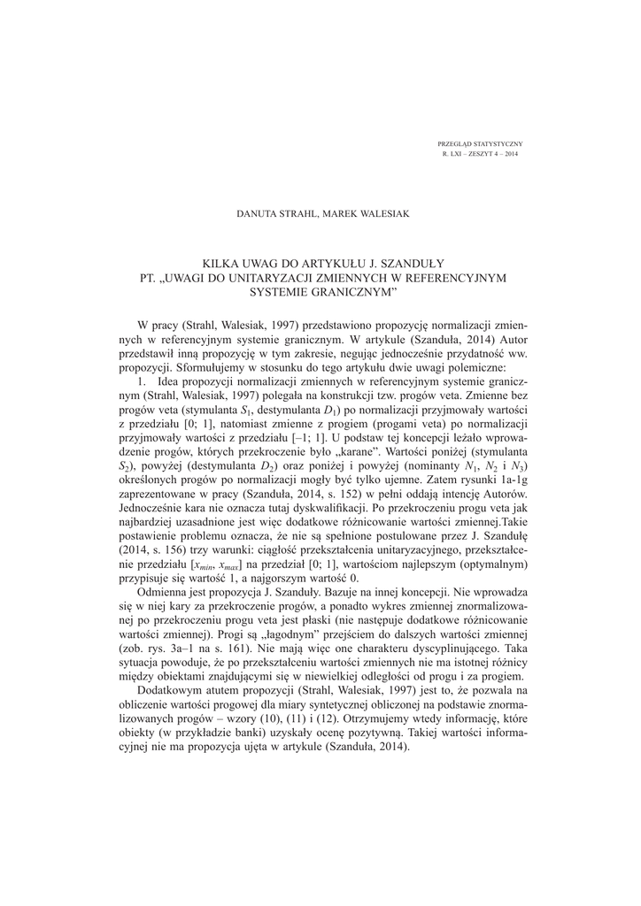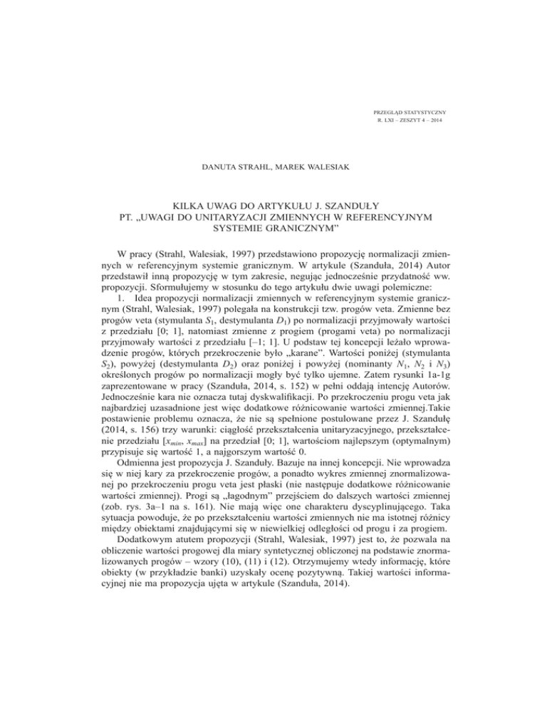 PRZEGLĄD STATYSTYCZNY R. LXI – ZESZYT 4 – 2014 DANUTA STRAHL, MAREK WALESIAK KILKA UWAG DO ARTYKUàU J. SZANDUàY PT. „UWAGI DO UNITARYZACJI ZMIENNYCH W REFERENCYJNYM SYSTEMIE GRANICZNYM” W pracy (Strahl, Walesiak, 1997) przedstawiono propozycjĊ normalizacji zmiennych w referencyjnym systemie granicznym. W artykule (Szanduáa, 2014) Autor przedstawiá inną propozycjĊ w tym zakresie, negując jednoczeĞnie przydatnoĞü ww. propozycji. Sformuáujemy w stosunku do tego artykuáu dwie uwagi polemiczne: 1. Idea propozycji normalizacji zmiennych w referencyjnym systemie granicznym (Strahl, Walesiak, 1997) polegaáa na konstrukcji tzw. progów veta. Zmienne bez progów veta (stymulanta S1, destymulanta D1) po normalizacji przyjmowaáy wartoĞci z przedziaáu [0; 1], natomiast zmienne z progiem (progami veta) po normalizacji przyjmowaáy wartoĞci z przedziaáu [–1; 1]. U podstaw tej koncepcji leĪaáo wprowadzenie progów, których przekroczenie byáo „karane”. WartoĞci poniĪej (stymulanta S2), powyĪej (destymulanta D2) oraz poniĪej i powyĪej (nominanty N1, N2 i N3) okreĞlonych progów po normalizacji mogáy byü tylko ujemne. Zatem rysunki 1a-1g zaprezentowane w pracy (Szanduáa, 2014, s. 152) w peáni oddają intencjĊ Autorów. JednoczeĞnie kara nie oznacza tutaj dyskwali¿kacji. Po przekroczeniu progu veta jak najbardziej uzasadnione jest wiĊc dodatkowe róĪnicowanie wartoĞci zmiennej.Takie postawienie problemu oznacza, Īe nie są speánione postulowane przez J. SzanduáĊ (2014, s. 156) trzy warunki: ciągáoĞü przeksztaácenia unitaryzacyjnego, przeksztaácenie przedziaáu [xmin, xmax] na przedziaá [0; 1], wartoĞciom najlepszym (optymalnym) przypisuje siĊ wartoĞü 1, a najgorszym wartoĞü 0. Odmienna jest propozycja J. Szanduáy. Bazuje na innej koncepcji. Nie wprowadza siĊ w niej kary za przekroczenie progów, a ponadto wykres zmiennej znormalizowanej po przekroczeniu progu veta jest páaski (nie nastĊpuje dodatkowe róĪnicowanie wartoĞci zmiennej). Progi są „áagodnym” przejĞciem do dalszych wartoĞci zmiennej (zob. rys. 3a–1 na s. 161). Nie mają wiĊc one charakteru dyscyplinującego. Taka sytuacja powoduje, Īe po przeksztaáceniu wartoĞci zmiennych nie ma istotnej róĪnicy miĊdzy obiektami znajdującymi siĊ w niewielkiej odlegáoĞci od progu i za progiem. Dodatkowym atutem propozycji (Strahl, Walesiak, 1997) jest to, Īe pozwala na obliczenie wartoĞci progowej dla miary syntetycznej obliczonej na podstawie znormalizowanych progów – wzory (10), (11) i (12). Otrzymujemy wtedy informacjĊ, które obiekty (w przykáadzie banki) uzyskaáy ocenĊ pozytywną. Takiej wartoĞci informacyjnej nie ma propozycja ujĊta w artykule (Szanduáa, 2014). 450 Danuta Strahl, Marek Walesiak Reasumując propozycja J. Szanduáy wzbogaca i uzupeánia zagadnienie przeksztaácania wartoĞci zmiennych w referencyjnym systemie granicznym nie negując jednoczeĞnie przydatnoĞci naszego rozwiązania. Są to dwie odmienne koncepcje. 2. Przedstawione w tab. 2 (Szanduáa, 2014, s. 163) porównanie prezentowanej w artykule propozycji z naszą z 1997 roku nie jest uprawnione. Wprawdzie wykorzystano tutaj te same dane statystyczne (tab. 1 ze s. 162), jednak inaczej okreĞlono progi dla niektórych zmiennych (zmienne X1 i X6). W tej sytuacji, celem stworzenia wáaĞciwej bazy porównawczej, powinno siĊ zastosowaü naszą normalizacjĊ z progami proponowanymi w artykule (Szanduáa, 2014) i dopiero wtedy naleĪaáo porównaü te dwie metody. Ponadto do artykuáu zgáaszamy inne uwagi, które bezpoĞrednio nie nawiązują do przedstawionej propozycji przeksztaácania wartoĞci zmiennych w referencyjnym systemie granicznym: 1. Sformuáowanie (Szanduáa, 2014, s. 148) „Proces normalizacji (...) pozwala (...) zrównaü ze sobą zakresy zmiennoĞci poszczególnych zmiennych” jest prawdziwe tylko dla wybranych formuá normalizacyjnych. Warunku tego nie speánia m.in. standaryzacja przedstawiona wzorem (2). RozstĊp dla wartoĞci zmiennych po standaryzacji jest równy rj/ sj (sj – odchylenie standardowe dla j-tej zmiennej, rj – rozstĊp dla j-tej zmiennej, j = 1,...,m – numer zmiennej). 2. Na s. 148 podano ogólny wzór na normalizacjĊ wartoĞci zmiennych zaproponowany w pracy (GrabiĔski, 1988): p § [ a · [ic ¨ k i ¸ , E ¹ © gdzie: [ic – i-ta znormalizowana wartoĞü zmiennej X, xi – i-ta wartoĞü zmiennej X, a, b, p, k, – parametry normalizacji. Wzór ten w cytowanej pozycji literatury (GrabiĔski, 1988) w odnoĞniku 14 na s. 245 oraz w pracy (GrabiĔski, 1992, s. 35–36) przyjmuje postaü: p § [i a · ¸ , © E ¹ [ic ¨ gdzie: xi, [ic – wyjĞciowa i znormalizowana wartoĞü i-tej realizacji zmiennej, a – parametr przesuniĊcia do umownego zera, b – czynnik skalujący, p – dodatnia liczba na ogóá równa 1/2, 1, 2, ... . Zatem we wzorze T. GrabiĔskiego nie ma parametru k. Kilka uwag do artykuáu J. Szanduáy pt. „Uwagi do unitaryzacji zmiennych w referencyjnym systemie... 451 3. Sformuáowanie (Szanduáa, 2014, s. 149) „Budowa zmiennej syntetycznej na podstawie zmiennych standaryzowanych wymaga, aby: 1. Wszystkie zmienne byáy stymulantami. W przypadku, gdy zmienne nie są stymulantami, naleĪy je przed standaryzacją przeksztaáciü na stymulanty ...” jest poprawne tylko dla syntetycznych mierników rozwoju (SMR) konstruowanych na podstawie bezwzorcowych formuá agregacji wartoĞci zmiennych. Zastosowanie formuá wzorcowych SMR, dla których oblicza siĊ odlegáoĞci poszczególnych obiektów od obiektu wzorcowego bĊdącego górnym biegunem rozwoju (por. np. miara rozwoju Hellwiga, 1968) nie wymaga zamiany destymulant i nominant na stymulanty. Uniwersytet Ekonomiczny we Wrocáawiu LITERATURA GrabiĔski T., (1988), Metody statystycznej analizy porównawczej, w: ZeliaĞ A., (red.), Metody statystyki miĊdzynarodowej, PWE, Warszawa, 235–260. GrabiĔski T., (1992), Metody taksonometrii, Wydawnictwo Akademii Ekonomicznej w Kr