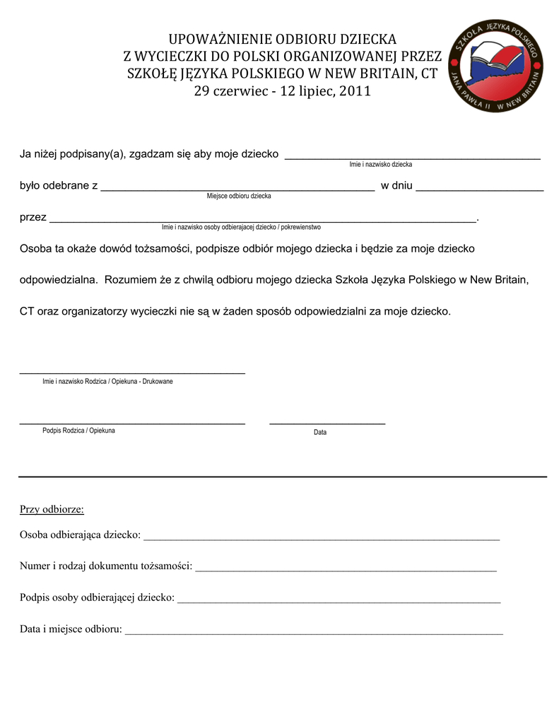 UPOWAŻNIENIE ODBIORU DZIECKA Z WYCIECZKI DO POLSKI ORGANIZOWANEJ PRZEZ SZKOŁĘ JĘZYKA POLSKIEGO W NEW BRITAIN, CT 29 czerwiec ‐ 12 lipiec, 2011 Ja niżej podpisany(a), zgadzam się aby moje dziecko __________________________________________ Imie i nazwisko dziecka było odebrane z _____________________________________________ w dniu _____________________ Miejsce odbioru dziecka przez ______________________________________________________________________. Imie i nazwisko osoby odbierajacej dziecko / pokrewienstwo Osoba ta okaże dowód tożsamości, podpisze odbiór mojego dziecka i będzie za moje dziecko odpowiedzialna. Rozumiem że z chwilą odbioru mojego dziecka Szkoła Języka Polskiego w New Britain, CT oraz organizatorzy wycieczki nie są w żaden sposób odpowiedzialni za moje dziecko. _____________________________________ Imie i nazwisko Rodzica / Opiekuna - Drukowane _____________________________________ Podpis Rodzica / Opiekuna ___________________ Data Przy odbiorze: Osoba odbierająca dziecko: _________________________________________________________________ Numer i rodzaj dokumentu tożsamości: _______________________________________________________ Podpis osoby odbierającej dziecko: ___________________________________________________________ Data i miejsce odbioru: _____________________________________________________________________
