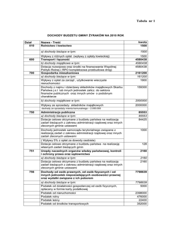 Tabela nr 1 DOCHODY BUDZETU GMINY śYRAKÓW NA 2010 ROK Dział 010 Nazwa - Treść Rolnictwo i łowiectwo a) dochody bieŜące w tym: 600 700 kwota 1500 1500 Wpływy z róŜnych opłat (wpływy z opłaty łowieckiej) Transport i łączność b) dochody majątkowe w tym: Dotacja rozwojowa oraz środki na finansowanie Wspólnej Polityki Rolnej ( RPO kompleksowa przebudowa dróg) Gospodarka mieszkaniowa a) dochody bieŜące w tym: Wpływy z opłat za zarząd , uŜytkowanie wieczyste nieruchomości Dochody z najmu i dzierŜawy składników majątkowych Skarbu Państwa j.s.t lub innych jednostek zalicz. do sektora finansów publicznych oraz innych umów o podobnym charakterze 1500 4580438 4580438 4580438 b) dochody majątkowe w tym: 2000000 Wpływy ze sprzedaŜy składników majątkowych 2000000 2161200 161200 1900 159300 dochody ze sprzedaŜy mienia komunalnego – 2.000.000 750 751 756 Administracja publiczna a) dochody bieŜące w tym: Dotacje celowe otrzymane z budŜetu państwa na realizację zadań bieŜących z zakresu administracji rządowej oraz innych zleconych gminie ustawami 85553 85553 84425 Dochody jednostek samorządu terytorialnego związane z realizacją zadań z zakresu administracji rządowej oraz innych zadań zleconych ustawami 1000 ( Wpływy 5% z opłat za dowody osobiste) Dotacje celowe otrzymane z budŜetu państwa na realizację własnych zadań bieŜących gmin Urzędy naczelnych organów władzy państwowej, kontroli i ochrony prawa oraz sądownictwa a) dochody bieŜące w tym: Dotacja celowa otrzymana z budŜetu państwa na realizację zadań bieŜących z zakresu administracji rządowej oraz innych zleconych gminie ustawami 128 2160 2160 2160 Dochody od osób prawnych, od osób fizycznych i od innych jednostek nieposiadających osobowości prawnej oraz wydatki związane z ich poborem 7798639 a) dochody bieŜące w tym: Podatek od działalności gospodarczej od osób fizycznych, opłacany w formie karty podatkowej Podatek od nieruchomości Podatek rolny Podatek leśny Podatek od środków transportowych 7798639 5000 2398000 476000 22400 352000 Podatek od czynności cywilnoprawnych Odsetki od nieterminowych wpłat Podatek od spadków i darowizn Wpływy z opłaty skarbowej Wpływy z opłaty eksploatacyjnej Wpływy z opłat za zezwolenia na sprzedaŜ alkoholu 758 801 852 900 Podatek dochodowy od osób fizycznych Podatek dochodowy od osób prawnych RóŜne rozliczenia a) dochody bieŜące w tym: Subwencja ogólna z budŜetu państwa Subwencja ogólna z budŜetu państwa Pozostałe odsetki ( odsetki od lokat terminowych) 320000 25000 5000 40000 20000 79000 4016239 40000 13815186 13815186 9788571 3996615 30000 Oświata i wychowanie a) dochody bieŜące w tym: Wpływy z róŜnych opłat (opłata stała za przedszkole) 344000 344000 86000 Wpływy z usług (wpłaty rodziców za Ŝywienie w przedszkolach i stołówkach szkolnych) Pomoc społeczna a) dochody bieŜące w tym: Dotacja celowa otrzymana z budŜetu państwa na realizację zadań bieŜących z zakresu administracji rządowej oraz innych zleconych gminie Wpływy z róŜnych dochodów (wpływy od dłuŜników alimentacyjnych) Wpływy ze zwrotów dotacji wykorzystanych niezgodnie z przeznaczeniem lub pobranych w nadmiernej wysokości 258000 4995880 4995880 4618850 10390 10000 Dotacje celowe otrzymane z budŜetu państwa na realizację własnych zadań bieŜących gmin Gospodarka komunalna i ochrona środowiska 356640 5457514 b) dochody majątkowe w tym: Otrzymane spadki, zapisy i darowizny w postaci pienięŜnej 5076014 2015000 (wpłaty ludności na poczet budowy kanalizacji w 5 miejscowościach) Dotacje rozwojowe oraz środki na finansowanie Wspólnej Polityki Rolnej ( z RPO na inwestycje budowa kanalizacji Zasów Mokre, Nagoszyn Cieszeciny, śyraków Przysiółek kolonia śyrakowska Środki na dofinansowanie własnych inwestycji gmin(związków gmin, powiatów), samorządów województw, pozyskane z innych źródeł (Środki z Funduszu Spójności na budowę 2127414 933600 kanalizacji w 5 miejscowościach ( Bobrowa, Bobrowa Wola, Góra Motyczna, Wiewiórka, Nagoszyn) – Program, poprawy czystości zlewni rzeki Wisłoka) a) dochody bieŜące w tym: Wpływy z róŜnych dochodów (zwrot podatku VAT za 2009 r. z tyt. realizacji inwestycji budowa kanalizacji w 5 miejscow.) Wpływy z opłaty produktowej Razem dochody 381500 380000 1500 39242070 w tym: dochody bieŜące dochody majątkowe 27585618 11656452