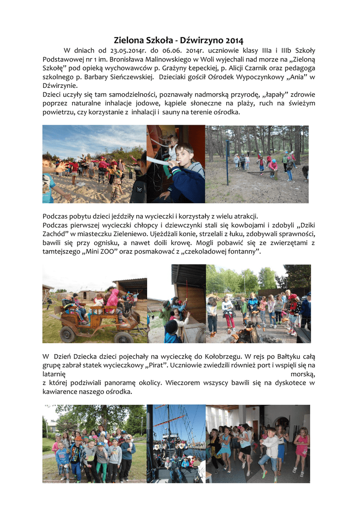 Zielona Szkoła - Dźwirzyno 2014 W dniach od 23.05.2014r. do 06.06. 2014r. uczniowie klasy IIIa i IIIb Szkoły Podstawowej nr 1 im. Bronisława Malinowskiego w Woli wyjechali nad morze na „Zieloną Szkołę” pod opieką wychowawców p. Grażyny Łepeckiej, p. Alicji Czarnik oraz pedagoga szkolnego p. Barbary Sieńczewskiej. Dzieciaki gościł Ośrodek Wypoczynkowy „Ania” w Dźwirzynie. Dzieci uczyły się tam samodzielności, poznawały nadmorską przyrodę, „łapały” zdrowie poprzez naturalne inhalacje jodowe, kąpiele słoneczne na plaży, ruch na świeżym powietrzu, czy korzystanie z inhalacji i sauny na terenie ośrodka. Podczas pobytu dzieci jeździły na wycieczki i korzystały z wielu atrakcji. Podczas pierwszej wycieczki chłopcy i dziewczynki stali się kowbojami i zdobyli „Dziki Zachód” w miasteczku Zieleniewo. Ujeżdżali konie, strzelali z łuku, zdobywali sprawności, bawili się przy ognisku, a nawet doili krowę. Mogli pobawić się ze zwierzętami z tamtejszego „Mini ZOO” oraz posmakować z „czekoladowej fontanny”. W Dzień Dziecka dzieci pojechały na wycieczkę do Kołobrzegu. W rejs po Bałtyku całą grupę zabrał statek wycieczkowy „Pirat”. Uczniowie zwiedzili również port i wspięli się na latarnię morską, z której podziwiali panoramę okolicy. Wieczorem wszyscy bawili się na dyskotece w kawiarence naszego ośrodka. Kolejna wycieczka to dopiero przygoda i to „Militarna przygoda”! Uczniowie pojechali do niedalekiego Trzebiatowa by zasmakować żołnierskiej musztry i wyszkolenia bojowego. Mieli okazję pobiegać po lesie w pełnym rynsztunku. Pokonywali naturalne przeszkody, kręcili się na żyroskopie, „zdobywali szczyty” na ściance wspinaczkowej, walczyli jak rycerze w średniowiecznej warowni, niektórzy musieli pokonać własne słabości. Każde z dzieci opuszczało „koszary” z prawdziwym wojskowym chlebakiem, a barwy wojenne na małych żołnierskich twarzach widniały jeszcze następnego dnia. Pobyt na „Zielonej Szkole” uatrakcyjniła przejażdżka kolejką po Dźwirzynie i nad jezioro Resko, zwiedzanie poru rybackiego, spotkanie z magikiem „Apolino” czy wyścigi na „gokartach”. Nie zabrakło konkursów z nagrodami – konkurs na „piaskową rzeźbę” czy pojedynków sportowych – mecze piłki nożnej i piłki rzucanej. Każde dziecko przeszło „chrzest morski” i otrzymało nowe „morskie imię”. Dzieci pokochały morza szum, ptaków śpiew… i zadowolone choć trochę stęsknione powróciły do rodzinnej Woli. Opiekunowie: Alicja Czarnik, Grażyna Łepecka, Barbara Sieńczewska