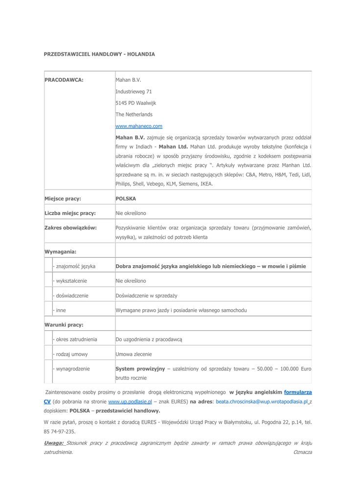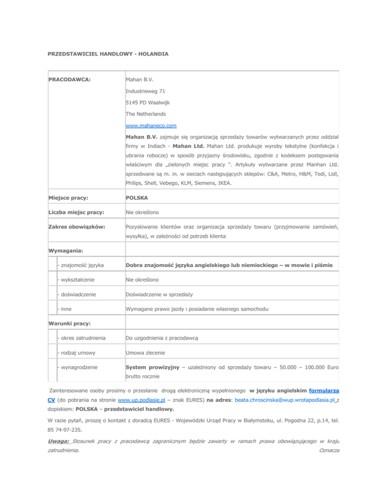PRZEDSTAWICIEL HANDLOWY - HOLANDIA PRACODAWCA: Mahan B.V. Industrieweg 71 5145 PD Waalwijk The Netherlands www.mahaneco.com Mahan B.V. zajmuje się organizacją sprzedaży towarów wytwarzanych przez oddział firmy w Indiach - Mahan Ltd. Mahan Ltd. produkuje wyroby tekstylne (konfekcja i ubrania robocze) w sposób przyjazny środowisku, zgodnie z kodeksem postępwania właściwym dla „zielonych miejsc pracy “. Artykuły wytwarzane przez Manhan Ltd. sprzedwane są m. in. w sieciach następujących sklepów: C&A, Metro, H&M, Tedi, Lidl, Philips, Shell, Vebego, KLM, Siemens, IKEA. Miejsce pracy: POLSKA Liczba miejsc pracy: Nie określono Zakres obowiązków: Pozyskiwanie klientów oraz organizacja sprzedaży towaru (przyjmowanie zamówień, wysyłka), w zależności od potrzeb klienta Wymagania: - znajomość języka Dobra znajomość języka angielskiego lub niemieckiego – w mowie i piśmie - wykształcenie Nie określono - doświadczenie Doświadczenie w sprzedaży - inne Wymagane prawo jazdy i posiadanie własnego samochodu Warunki pracy: - okres zatrudnienia Do uzgodnienia z pracodawcą - rodzaj umowy Umowa zlecenie - wynagrodzenie System prowizyjny – uzależniony od sprzedaży towaru – 50.000 – 100.000 Euro brutto rocznie Zainteresowane osoby prosimy o przesłanie drogą elektroniczną wypełnionego w języku angielskim formularza CV (do pobrania na stronie www.up.podlasie.pl – znak EURES) na adres: [email protected] z dopiskiem: POLSKA – przedstawiciel handlowy. W razie pytań, proszę o kontakt z doradcą EURES - Wojewódzki Urząd Pracy w Białymstoku, ul. Pogodna 22, p.14, tel. 85 74-97-235. Uwaga: Stosunek pracy z pracodawcą zagranicznym będzie zawarty w ramach prawa obowiązującego w kraju zatrudnienia. Oznacza to, że wszelkie roszczenie z tytułu nie wywiązywania się pracodawcy z warunków zawartych w umowie o pracę, dochodzić można wyłącznie w sądzie pracy w kraju zatrudnienia. W sytuacjach losowych pomoc polskich placówek konsularnych ogranicza się do ewentualnego udzielenia doraźnej pomocy ( np. kredytu na zakup biletu powrotnego do Polski ). Urząd Pracy nie ma możliwości pośredniczenia ani reprezentowania pracownika przed sądem kraju zatrudnienia, w przypadku wystąpienia sporu z pracodawcą. Urząd Pracy dokłada wszelkich starań, aby oferty pracy będące w zasobach urzędu były rzetelne i wiarygodne. Ponieważ wszystkie oferty pracy pochodzą od osób trzecich Urząd Pracy zastrzega, że odpowiedzialność za ewentualne rozbieżności pomiędzy warunkami pracy zaprezentowanymi w niniejszej ofercie a warunkami zaproponowanymi przez potencjalnego pracodawcę ponosi pracodawca. OFERTA WAŻNA DO ODWOŁANIA