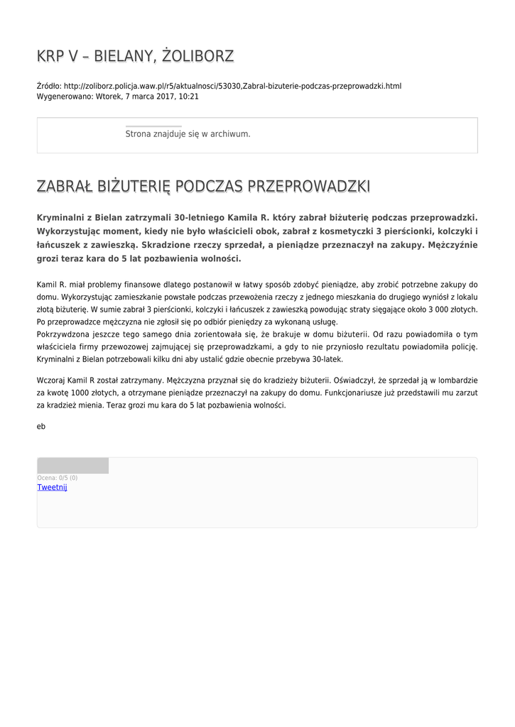 KRP V – BIELANY, ŻOLIBORZ Źródło: http://zoliborz.policja.waw.pl/r5/aktualnosci/53030,Zabral-bizuterie-podczas-przeprowadzki.html Wygenerowano: Wtorek, 7 marca 2017, 10:21 Strona znajduje się w archiwum. ZABRAŁ BIŻUTERIĘ PODCZAS PRZEPROWADZKI Kryminalni z Bielan zatrzymali 30-letniego Kamila R. który zabrał biżuterię podczas przeprowadzki. Wykorzystując moment, kiedy nie było właścicieli obok, zabrał z kosmetyczki 3 pierścionki, kolczyki i łańcuszek z zawieszką. Skradzione rzeczy sprzedał, a pieniądze przeznaczył na zakupy. Mężczyźnie grozi teraz kara do 5 lat pozbawienia wolności. Kamil R. miał problemy finansowe dlatego postanowił w łatwy sposób zdobyć pieniądze, aby zrobić potrzebne zakupy do domu. Wykorzystując zamieszkanie powstałe podczas przewożenia rzeczy z jednego mieszkania do drugiego wyniósł z lokalu złotą biżuterię. W sumie zabrał 3 pierścionki, kolczyki i łańcuszek z zawieszką powodując straty sięgające około 3 000 złotych. Po przeprowadzce mężczyzna nie zgłosił się po odbiór pieniędzy za wykonaną usługę. Pokrzywdzona jeszcze tego samego dnia zorientowała się, że brakuje w domu biżuterii. Od razu powiadomiła o tym właściciela firmy przewozowej zajmującej się przeprowadzkami, a gdy to nie przyniosło rezultatu powiadomiła policję. Kryminalni z Bielan potrzebowali kilku dni aby ustalić gdzie obecnie przebywa 30-latek. Wczoraj Kamil R został zatrzymany. Mężczyzna przyznał się do kradzieży biżuterii. Oświadczył, że sprzedał ją w lombardzie za kwotę 1000 złotych, a otrzymane pieniądze przeznaczył na zakupy do domu. Funkcjonariusze już przedstawili mu zarzut za kradzież mienia. Teraz grozi mu kara do 5 lat pozbawienia wolności. eb Ocena: 0/5 (0) Tweetnij