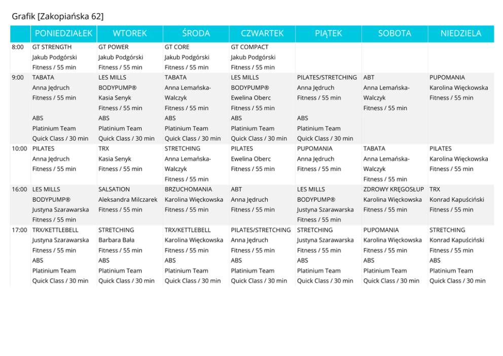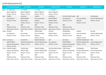 Grafik [Zakopiańska 62] PONIEDZIAŁEK 8:00 9:00 WTOREK ŚRODA CZWARTEK PIĄTEK SOBOTA NIEDZIELA GT STRENGTH GT POWER GT CORE GT COMPACT Jakub Podgórski Jakub Podgórski Jakub Podgórski Jakub Podgórski Fitness / 55 min Fitness / 55 min Fitness / 55 min Fitness / 55 min TABATA LES MILLS TABATA LES MILLS PILATES/STRETCHING ABT PUPOMANIA Anna Jędruch BODYPUMP® Anna Lemańska- BODYPUMP® Anna Jędruch Anna Lemańska- Karolina Więckowska Fitness / 55 min Kasia Senyk Walczyk Ewelina Oberc Fitness / 55 min Walczyk Fitness / 55 min Fitness / 55 min Fitness / 55 min Fitness / 55 min ABS ABS ABS ABS ABS Platinium Team Platinium Team Platinium Team Platinium Team Platinium Team Quick Class / 30 min Quick Class / 30 min Quick Class / 30 min Quick Class / 30 min Quick Class / 30 min TRX STRETCHING PILATES PUPOMANIA TABATA PILATES Anna Jędruch Kasia Senyk Anna Lemańska- Ewelina Oberc Anna Jędruch Anna Lemańska- Karolina Więckowska Fitness / 55 min Fitness / 55 min Walczyk Fitness / 55 min Fitness / 55 min Walczyk Fitness / 55 min 10:00 PILATES Fitness / 55 min Fitness / 55 min 16:00 LES MILLS Fitness / 55 min SALSATION BRZUCHOMANIA ABT LES MILLS ZDROWY KRĘGOSŁUP TRX BODYPUMP® Aleksandra Milczarek Karolina Więckowska Anna Jędruch BODYPUMP® Karolina Więckowska Konrad Kapuściński Justyna Szarawarska Fitness / 55 min Fitness / 55 min Fitness / 55 min Justyna Szarawarska Fitness / 55 min Fitness / 55 min Fitness / 55 min 17:00 TRX/KETTLEBELL Fitness / 55 min STRETCHING TRX/KETTLEBELL PILATES/STRETCHING STRETCHING PUPOMANIA STRETCHING Justyna Szarawarska Barbara Bała Karolina Więckowska Anna Jędruch Justyna Szarawarska Karolina Więckowska Konrad Kapuściński Fitness / 55 min Fitness / 55 min Fitness / 55 min Fitness / 55 min Fitness / 55 min Fitness / 55 min Fitness / 55 min ABS ABS ABS ABS ABS ABS ABS Platinium Team Platinium Team Platinium Team Platinium Team Platinium Team Platinium Team Platinium Team Quick Class / 30 min Quick Class / 30 min Quick Class / 30 min Quick Class / 30 min Quick Class / 30 min Quick Class / 30 min Quick Class / 30 min 18:00 ZUMBA® TBC+STEP STRETCHING TRX BODY SHAPE ZUMBA® Weronika Kosmowska Barbara Bała Barbara Bała Martyna Kapica Anna Lemańska- Weronika Kosmowska Fitness / 55 min Fitness / 55 min Fitness / 55 min Walczyk Fitness / 55 min Fitness / 55 min Fitness / 55 min 19:00 ABT TRX/KETTLEBELL ABT TBC+STEP PUPOMANIA TRENING TRENING Martyna Kapica Konrad Kapuściński Barbara Bała Martyna Kapica Anna Lemańska- OBWODOWY DLA OBWODOWY DLA Fitness / 55 min Fitness / 55 min Fitness / 55 min Fitness / 55 min Walczyk PAŃ PAŃ Fitness / 55 min Platinium Team Platinium Team Quick Class / 30 min Quick Class / 30 min TRENING TRENING TRENING TRENING TRENING OBWODOWY DLA OBWODOWY DLA OBWODOWY DLA OBWODOWY DLA OBWODOWY DLA PAŃ PAŃ PAŃ PAŃ PAŃ Platinium Team Platinium Team Platinium Team Platinium Team Platinium Team Quick Class / 30 min Quick Class / 30 min Quick Class / 30 min Quick Class / 30 min Quick Class / 30 min LES MILLS LES MILLS TABATA SALSATION Martyna Kapica BODYPUMP® BODYPUMP® Anna Lemańska- Aleksandra Milczarek Fitness / 55 min Konrad Kapuściński Kasia Senyk Walczyk Fitness / 55 min Fitness / 55 min Fitness / 55 min Fitness / 55 min ABS ABS ABS ABS ABS Platinium Team Platinium Team Platinium Team Platinium Team Platinium Team Quick Class / 30 min Quick Class / 30 min Quick Class / 30 min Quick Class / 30 min Quick Class / 30 min 20:00 BRZUCHOMANIA 21:00 STRETCHING ZDROWY KRĘGOSŁUP ZUMBA® STRETCHING Martyna Kapica Anna Jędruch Kasia Senyk Anna Jędruch Fitness / 55 min Fitness / 55 min Fitness / 55 min Fitness / 55 min