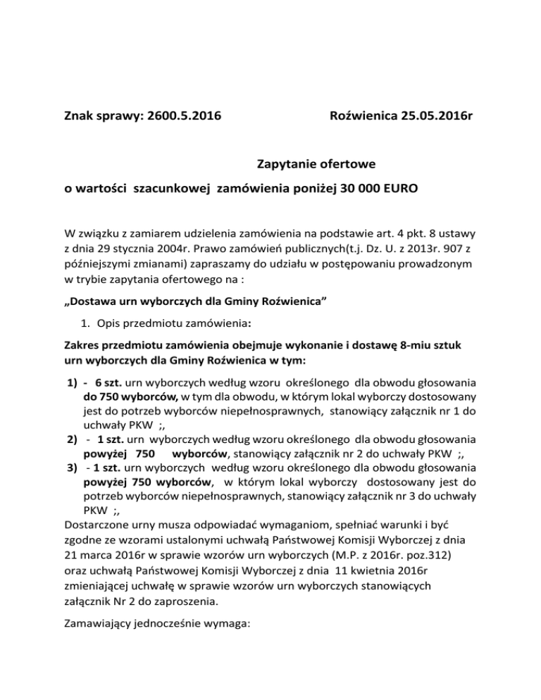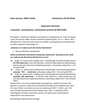Znak sprawy: 2600.5.2016 Roźwienica 25.05.2016r Zapytanie ofertowe o wartości szacunkowej zamówienia poniżej 30 000 EURO W związku z zamiarem udzielenia zamówienia na podstawie art. 4 pkt. 8 ustawy z dnia 29 stycznia 2004r. Prawo zamówień publicznych(t.j. Dz. U. z 2013r. 907 z późniejszymi zmianami) zapraszamy do udziału w postępowaniu prowadzonym w trybie zapytania ofertowego na : „Dostawa urn wyborczych dla Gminy Roźwienica” 1. Opis przedmiotu zamówienia: Zakres przedmiotu zamówienia obejmuje wykonanie i dostawę 8-miu sztuk urn wyborczych dla Gminy Roźwienica w tym: 1) - 6 szt. urn wyborczych według wzoru określonego dla obwodu głosowania do 750 wyborców, w tym dla obwodu, w którym lokal wyborczy dostosowany jest do potrzeb wyborców niepełnosprawnych, stanowiący załącznik nr 1 do uchwały PKW ;, 2) - 1 szt. urn wyborczych według wzoru określonego dla obwodu głosowania powyżej 750 wyborców, stanowiący załącznik nr 2 do uchwały PKW ;, 3) - 1 szt. urn wyborczych według wzoru określonego dla obwodu głosowania powyżej 750 wyborców, w którym lokal wyborczy dostosowany jest do potrzeb wyborców niepełnosprawnych, stanowiący załącznik nr 3 do uchwały PKW ;, Dostarczone urny musza odpowiadać wymaganiom, spełniać warunki i być zgodne ze wzorami ustalonymi uchwałą Państwowej Komisji Wyborczej z dnia 21 marca 2016r w sprawie wzorów urn wyborczych (M.P. z 2016r. poz.312) oraz uchwałą Państwowej Komisji Wyborczej z dnia 11 kwietnia 2016r zmieniającej uchwałę w sprawie wzorów urn wyborczych stanowiących załącznik Nr 2 do zaproszenia. Zamawiający jednocześnie wymaga: a. zastosowanie uchwytów urn o trzech punktach podparcia lub uchwytów, które całą powierzchnią przylegają do boków urn, b. zagięcie górnych krawędzi boków urn do ich wnętrza co usztywni konstrukcję urn. Zamawiający dopuszcza: a. wykonanie zagiętych do wnętrza urny krawędzi otworu wrzutowego (kołnierza), co usztywni konstrukcję wieka urny oraz ułatwi wyborcom wrzucanie kart do glosowania (po zwężeniu otwór wrzutowy nie może być węższy niż 1,5 cm), b. zastosowanie do zamknięcia i blokowania wieka urny: - mechanizmów odciąganych (bez możliwości ich całkowitego wyjęcia) zamiast zakręcanych , pod warunkiem umieszczenia w ścianach bocznych i wieku urny otworów umożliwiających założenie plomby plastikowej lub metalowej, - śrub wkręcanych (bez możliwości całkowitego wykręcenia) w nitonakrętki zamocowane w ścianach bocznych urny. Wykonawcy muszą wziąć pod uwagę, że liczba nitów służących do łączenia elementów urny wskazana we wzorach Państwowej Komisji Wyborczej jest przykładowa, urna może być połączona większą ilością nitów im musi być wykonana w taki sposób, aby była trwała. Wykonawca wraz z ofertą składa projekt urn wraz z opisem technicznym wykonania i oświadczeniem, że projekt jest zgodny z wytycznymi PKW. Zamawiający wymaga od Wykonawców udzielenia gwarancji na dostarczone urny wyborcze na minimum 36 miesięcy. 4) Termin realizacji zamówienia: Przedmiot zamówienia należy dostarczyć w terminie do 15 lipca 2016r. 5) Miejsce i termin złożenia oferty: Ofertę należy złożyć w siedzibie Zamawiającego tj. Urząd Gminy Roźwienica, 37-565 Roźwienica 1 w terminie 7.06.2016r do godz.12:00. Ofertę można złożyć osobiście w sekretariacie Urzędu Gminy Roźwienica, 37-565 Roźwienica 1(z dopiskiem na kopercie Oferta na: Dostawa urn wyborczych dla Gminy Roźwienica) lub pocztą, pocztą elektroniczną na adres: [email protected], faksem na numer 16 622 58 22 (dosyłając oryginał oferty pocztą). 6) Otwarcie ofert odbędzie się w dniu 7.06.2016r o godz. 12:15 7) Sposób oceny i dokonania i dokonania wyboru najkorzystniejszej oferty: Kryterium oceny ofert: cena-100% 8) Okres związania ofertą – 30 dni od ostatecznego terminu składania ofert. 9) W niniejszym postępowaniu wszelkie oświadczenia, wnioski zawiadomienia oraz informacje zamawiający i wykonawcy przekazują pisemnie na adres Zamawiającego lub drogą elektroniczną (e-mail)-na adres: [email protected]. 10) Ofertę należy sporządzić w formie pisemnej. Oferta oraz oświadczenia i dokumenty składne wraz z oferta powinny być podpisane przez osobę upoważnioną do występowania w imieniu wykonawcy albo przez osobę umocowana przez wykonawcę. 11) Cena za dostawę urn wyborczych musi zawierać wszystkie koszty związane z realizacja zamówienia opisanego w zapytaniu niezbędne do jego wykonania z uwzględnieniem wszystkich opłat i podatków. 12) Wykonawca ponosi wszelkie koszty związane z przygotowaniem i złożeniem oferty. 13) Inne istotne warunki zamówienia przyszłej umowy: podstawą wystawienia faktury będzie protokół zdawczo-odbiorczy podpisany przez Zamawiającego i Wykonawcę. 14) Szczegółowych informacji od poniedziałku do piątku w godzinach od 8:00 do 15:00 udziela pracownik Urzędu Gminy Roźwienica: tel.(0-16)6225822. Z-ca Wójta Franciszek Liszka Do pobrania: Formularz oferty Uchwały Państwowej Komisji Wyborczej ZBIÓR WYJAŚNIEŃ PKW FORMULARZ OFERTY 1. Nazwa i adres Wykonawcy Nazwa: …………………………………………………………………………………………………………….. Adres: ……………………………………………………………………………………………………………… NIP: ………………………………………………………………………………………………………………… REGON: ……………………………………………………………………………………………………………. Nr tel./faxu: …………………………………………………………………………………………………….. Adres e-mail: ……………………………………………………………………………………………………. 2. Oferuję wykonanie przedmiotu zamów