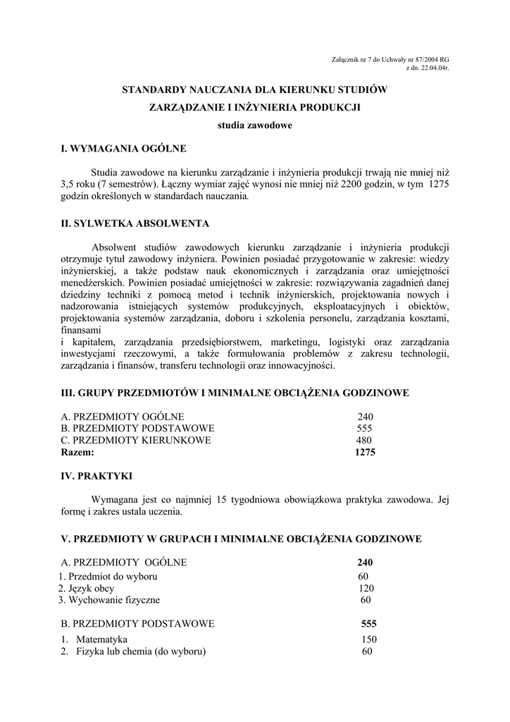Załącznik nr 7 do Uchwały nr 87/2004 RG z dn. 22.04.04r. STANDARDY NAUCZANIA DLA KIERUNKU STUDIÓW ZARZĄDZANIE I INŻYNIERIA PRODUKCJI studia zawodowe I. WYMAGANIA OGÓLNE Studia zawodowe na kierunku zarządzanie i inżynieria produkcji trwają nie mniej niż 3,5 roku (7 semestrów). Łączny wymiar zajęć wynosi nie mniej niż 2200 godzin, w tym 1275 godzin określonych w standardach nauczania. II. SYLWETKA ABSOLWENTA Absolwent studiów zawodowych kierunku zarządzanie i inżynieria produkcji otrzymuje tytuł zawodowy inżyniera. Powinien posiadać przygotowanie w zakresie: wiedzy inżynierskiej, a także podstaw nauk ekonomicznych i zarządzania oraz umiejętności menedżerskich. Powinien posiadać umiejętności w zakresie: rozwiązywania zagadnień danej dziedziny techniki z pomocą metod i technik inżynierskich, projektowania nowych i nadzorowania istniejących systemów produkcyjnych, eksploatacyjnych i obiektów, projektowania systemów zarządzania, doboru i szkolenia personelu, zarządzania kosztami, finansami i kapitałem, zarządzania przedsiębiorstwem, marketingu, logistyki oraz zarządzania inwestycjami rzeczowymi, a także formułowania problemów z zakresu technologii, zarządzania i finansów, transferu technologii oraz innowacyjności. III. GRUPY PRZEDMIOTÓW I MINIMALNE OBCIĄŻENIA GODZINOWE A. PRZEDMIOTY OGÓLNE B. PRZEDMIOTY PODSTAWOWE C. PRZEDMIOTY KIERUNKOWE Razem: 240 555 480 1275 IV. PRAKTYKI Wymagana jest co najmniej 15 tygodniowa obowiązkowa praktyka zawodowa. Jej formę i zakres ustala uczenia. V. PRZEDMIOTY W GRUPACH I MINIMALNE OBCIĄŻENIA GODZINOWE A. PRZEDMIOTY OGÓLNE 1. Przedmiot do wyboru 2. Język obcy 3. Wychowanie fizyczne 240 60 120 60 B. PRZEDMIOTY PODSTAWOWE 555 1. Matematyka 2. Fizyka lub chemia (do wyboru) 150 60 2 3. 4. 5. 6. 7. 8. Technologia informacyjna Geometria i grafika inżynierska Podstawy metrologii Mikro- i makroekonomia Podstawy prawa Podstawy zarządzania 90 45 30 90 45 45 C. PRZEDMIOTY KIERUNKOWE 480 1. Finanse i rachunkowość 2. Rachunek kosztów dla inżynierów 3. Zarządzanie produkcją i usługami 4. Zarządzanie strategiczne 5. Zarządzanie jakością (TQM) 6. Podstawy marketingu 7. Ekologia zasobów naturalnych i ochrona środowiska 8. Materiałoznawstwo 9. Podstawy projektowania inżynierskiego 10. Podstawy automatyzacji 11. Logistyka w przedsiębiorstwie 12. Procesy i techniki produkcyjne 60 30 45 30 30 30 30 45 60 30 30 60 VI. TREŚCI PROGRAMOWE PRZEDMIOTÓW A.PRZEDMIOTY OGÓLNE 1. Przedmiot do wyboru Etyka, psychologia, filozofia, socjologia, komunikacja społeczna, ochrona własności intelektualnej, inny. B. PRZEDMIOTY PODSTAWOWE 1. Matematyka Liczby zespolone. Elementy rachunku macierzowego i wektorowego. Funkcje – liniowe oraz ciągłe jednej i wielu zmiennych. Rachunek różniczkowy i całkowy jednej i wielu zmiennych. Szeregi liczbowe. Proste równania różniczkowe zwyczajne. Analiza dynamiki zjawisk. Programowanie liniowe i zagadnienia transportowe. Optymalizacja. Metody opisu statystycznego. Elementy rachunku prawdopodobieństwa. Dane i podstawowe normy statystyczne. Zmienna losowa, podstawowe rozkłady zmiennych losowych. Rozkład z prób. Przedziały ufności. Testowanie hipotez statystycznych. Statystyczna miara współzależności zjawisk. Techniki losowania prób. Projektowanie eksperymentów statystycznych. Elementy teorii kolejek i systemu masowej obsługi. 2. Fizyka lub chemia (do wyboru) Fizyka Kinematyka. Dynamika punktu materialnego. Mechanika ciała sztywnego. Ruch drgający. Mechanika relatywistyczna. Grawitacja. Termodynamika. Równowaga faz, przejście fazowe. Elektryczność i magnetyzm. Optyka liniowa i falowa. Oddziaływania fundamentalne, elementarne składniki materii. Budowa atomu i jądra, kwanty. Podstawowe pojęcia makro- i mikroświata – opis klasyczny i kwantowo-mechaniczny. 3 Chemia Budowa materii i klasyfikacja pierwiastków. Podstawowe pojęcia i prawa chemii. Mechanizmy powstawania wiązań chemicznych. Podstawy chemii nieorganicznej, organicznej, fizycznej i anlitycznej. Podstawy technologii chemicznej. 3. Technologia informacyjna Podstawowe pojęcia informatyki. Sprzęt komputerowy. Standardowe konfiguracje komputera. Oprogramowanie. Systemy operacyjne (obiektowe, ponadobiektowe). Edytory tekstów. Arkusze kalkulacyjne. Bazy danych i ich wykorzystanie. Złożone systemy informatyczne (lokalne i rozległe sieci komputerowe): UNIX, NOVELL, e-mail, internet. 4. Geometria i grafika inżynierska Geometryczne podstawy rysunku technicznego: rzutowanie równoległe i prostokątne. Aksonometria jako podstawowa forma tworzenia rysunków poglądowych (szkicowanie odręczne). Główne formy zapisu graficznego zalecane przez normy: rzutowanie, przekroje rysunkowe, wymiarowanie. Techniki komputerowe (CAD) jako narzędzie wspomagające opracowanie graficzne dokumentacji technicznej i ofertowej. 5. Podstawy metrologii Pomiary wielkości mechanicznych, zamienność części, tolerancje i pasowania. Teoria błędu w ujęciu granicznym. Źródła i typy błędów. Zapis, wyniki pomiaru. Narzędzia pomiarowe: analogowe, cyfrowe. Przetworniki, komparatory, wzorce. Przetworniki A/C i C/A. Wspomaganie mikrokomputerowe. Oddziaływania: obiekt pomiaru-przyrządobserwator. Model, wzór definicyjny, sumowanie błędów. Statystyczna teoria błędów. Metody i techniki pomiaru różnych wielkości fizycznych, obiektów i procesów. 6. Mikro- i makroekonomia Rynek i gospodarka rynkowa. Teoria zachowania się konsumenta. Teoria produkcji. Modele konkurencji rynkowej: konkurencja doskonała, monopol, oligopol. Równowaga mikroekonomiczna. Alternatywna teoria przedsiębiorstwa. Rynki czynników produkcji. Równowaga konkurencyjna i elementy teorii dobrobytu. Gospodarka narodowa. Równowaga makroekonomiczna. Produkt społeczny, dochód narodowy. Budżet państwa, deficyt i dług publiczny. Pieniądz i system bankowy. Rynek pieniądza. Makroekonomia keynesowska i makroekonomia klasyczna. Cykl koniun