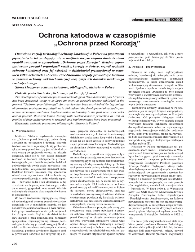 WOJCIECH SOKÓLSKI SPZP CORRPOL Gdańsk Ochrona katodowa w czasopiśmie „Ochrona przed Korozją” Omówiono rozwój technologii ochrony katodowej w Polsce na przestrzeni pięćdziesięciu lat, posługując się w możliwie dużym stopniu doniesieniami opublikowanymi w czasopiśmie „Ochrona przed Korozją”. Kolejno zaprezentowano początki organizacji walki z korozją w Polsce, rozwój techniki ochrony katodowej oraz jej wdrożeń w działalności przemysłowej w ostatnich kilku dekadach i obecnie. Przedstawiono zespoły prowadzące badania w zakresie ochrony elektrochemicznej oraz zarys ich dorobku naukowego i wdrożeniowego. Słowa kluczowe: ochrona katodowa, bibliografia, historia w Polsce Cathodic protection in the „Ochrona przed Korozją” journal The development of cathodic protection technology in Poland over the past 50 years has been discussed, using to as large an extent as possible reports published in the journal ”Ochrona przed Korozją”. An overview has been provided of the beginnings of corrosion protection organisations in Poland and the development of cathodic protection techniques and their implementation in industry in the past several decades and at present. Research teams dealing with electrochemical protection as well as profiles of their achievements in research and implementation have been presented. Keywords: cathodic protection, bibliography, history in Poland 1. Wprowadzenie Jubileusz 50-lecia wydawania czasopisma „Ochrona przed Korozją”, prócz dumy z trwania na posterunku i dobrego służenia środowisku ludzi zajmujących się problematyką ochrony przed korozją, jest także doskonałą okazją do spojrzenia wstecz na historię przemian, jakie się w tym czasie dokonały zarówno w technice zabezpieczeń przeciwkorozyjnych, jak i losach zespołów ludzkich poświęcających swoje życie zawodowe tym zagadnieniom. Wielokrotnie namawiał mnie Redaktor Edward Śmieszek, aby spróbować zebrać materiały na temat elektrochemicznej ochrony przed korozją w takim właśnie aspekcie – powiązać ludzi i ich dokonania w tej dziedzinie na tle postępu technicznego, wkładu w rozwój gospodarki oraz nauki. Właśnie nadarzyła się dogodna okazja spełnić w końcu to oczekiwanie. W Polsce środowiska zajmujące się różnymi technologiami ochrony przeciwkorozyjnej przenikają się w niewielkim stopniu, co jest konsekwencją kształtowania się tych niewielkich grup zawodowych w różnych miejscach i w różnym czasie. Stąd też nie dziwi istniejący dystans i brak porozumienia pomiędzy specjalistami zajmującymi się różnymi technologiami ochrony przeciwkorozyjnej. Środowisko osób zawodowo związanych z ochroną katodową, pomimo czynionych licznych prób w przeszłości i obecnie, nie integruje się z in- 300 nymi grupami, chociażby na konferencjach naukowo-technicznych, i nie utożsamia swojej działalności z taką samą ideą walki z korozją, z jaką na co dzień czynią to osoby zajmujące się np. powłokami ochronnymi. Może dlatego, że chronione obiekty zazwyczaj w ogóle nie są widoczne? Dodatkowym czynnikiem mającym wpływ na omawianą sytuację jest to, że w środowisku osób zajmujących się ochroną elektrochemiczną znaczącą liczbę stanowią elektrycy, dla których przełamanie bariery wiedzy chemicznej, nie mówiąc już o elektrochemicznej, jest trudne do pokonania. Znacznie łatwiej chemikowi opanować zawiłości związane z rozpływem prądu elektrycznego, np. w ziemi czy w wymienniku ciepła. Elektrochemiczna ochrona przed korozją zakwalifikowana jest w Polsce do kategorii metod elektrycznych, stąd też w zakładach przemysłowych właśnie służbom elektrycznym powierza się instalacje ochrony katodowej. Tak dzieje się w większości państw europejskich, inaczej niż za oceanem. Odzwierciedleniem powyższych uwag jest stosunkowo mała liczba publikacji z zakresu ochrony elektrochemicznej w „Ochronie przed Korozją” w okresie półwiecza (mniej niż 10% wszystkich artykułów). Chcąc więc opisać dzieje rozwoju technologii ochrony elektrochemicznej w Polsce zmuszony byłem sięgać także do innych źródeł oraz własnej pamięci. W krótkim artykule nie sposób napisać o wszystkim i o wszystkich, tak więc z góry przepraszam, jeśli dokonując skrótów pominąłem niektóre fakty. 2. Początki – prądy błądzące Pierwsze w dużej skali wykorzystanie ochrony katodowej do zabezpieczenia przeciwkorozyjnego metalowych konstrukcji podziemnych, a także opracowanie zasad technicznych jej stosowania, nastąpiło w Stanach Zjednoczonych w latach trzydziestych ubiegłego stulecia. Związane to było przede wszystkim z gwałtownym rozwojem przemysłu wydobywczego ropy naftowej i gazu oraz masowego zastosowania rurociągów stalowych do ich transportu. Technologia ochrony katodowej w Polsce, podobnie jak w innych krajach europejskich, rozwinęła się znacząco dopiero po II wojnie światowej. Od początku ubiegłego wieku w Europie dominowały w tym zakresie przede wszystkim działania techniczne zmierzające do wyeliminowania wówczas największego zagrożenia korozyjnego obiektów podziemnych, jakim były i są prądy błądzące. Przyczyną było zastosowanie trakcji elektrycznych do transportu miejskiego i kolejowego zasilanych prądem stałym [1]. Również w Polsce problematyce tej poświęcano sporo uwagi – zbudowana w Warszawie sieć tramwajowa (jak na tamte czasy) była bardzo gęsta, gdyż tramwaje stanowiły jedyny środek transportu publicznego. Stowarzyszenie Elektryków Polskich powołało Komisję Prądów Błądzących, której zadaniem było opracowanie krajowych przepisów zmierzających do ograniczenia zagrożeń korozyjnych powodowanych przez prądy upływające z obwodów powrotnych zelektryfikowanych linii tramwajowych, na wzór przepisów angielskich, niemieckich, szwajcarskich i francuskich. W lipcu 1930 r. w Warszawie odbył się XXII Kongres Międzynarodowego Związku Tram