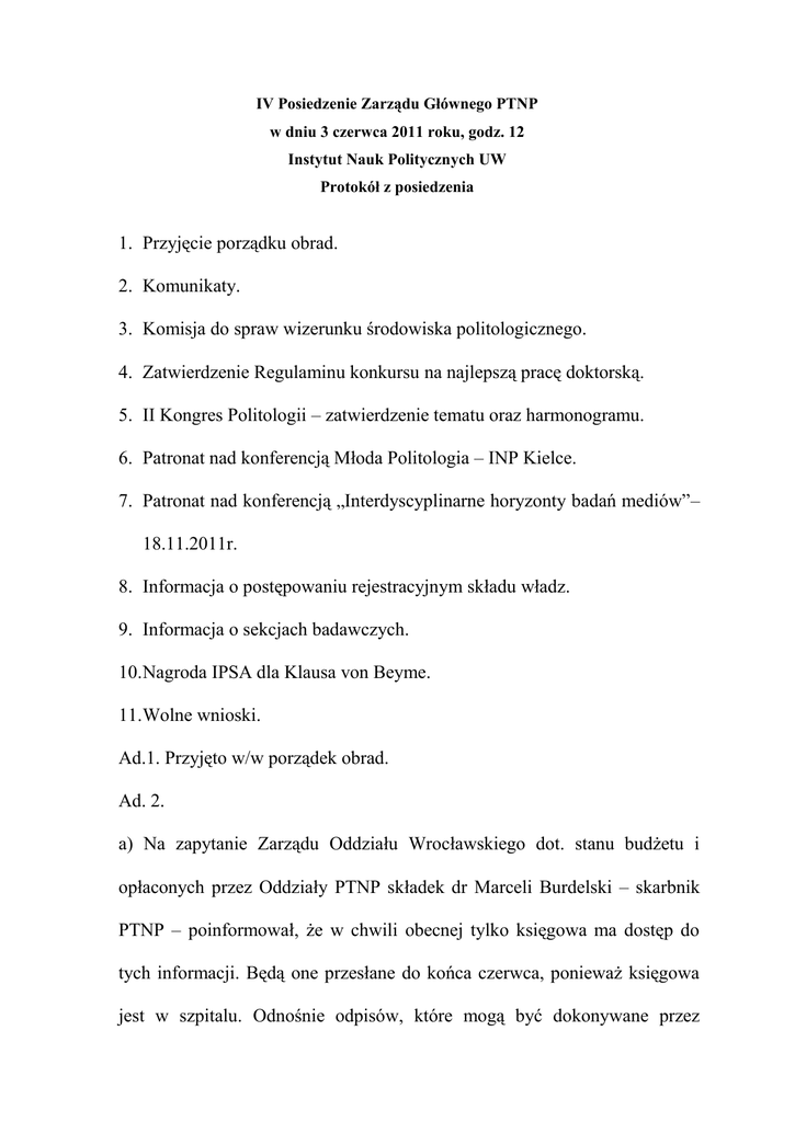 IV Posiedzenie Zarządu Głównego PTNP w dniu 3 czerwca 2011 roku, godz. 12 Instytut Nauk Politycznych UW Protokół z posiedzenia 1. Przyjęcie porządku obrad. 2. Komunikaty. 3. Komisja do spraw wizerunku środowiska politologicznego. 4. Zatwierdzenie Regulaminu konkursu na najlepszą pracę doktorską. 5. II Kongres Politologii – zatwierdzenie tematu oraz harmonogramu. 6. Patronat nad konferencją Młoda Politologia – INP Kielce. 7. Patronat nad konferencją „Interdyscyplinarne horyzonty badań mediów”– 18.11.2011r. 8. Informacja o postępowaniu rejestracyjnym składu władz. 9. Informacja o sekcjach badawczych. 10.Nagroda IPSA dla Klausa von Beyme. 11.Wolne wnioski. Ad.1. Przyjęto w/w porządek obrad. Ad. 2. a) Na zapytanie Zarządu Oddziału Wrocławskiego dot. stanu budżetu i opłaconych przez Oddziały PTNP składek dr Marceli Burdelski – skarbnik PTNP – poinformował, że w chwili obecnej tylko księgowa ma dostęp do tych informacji. Będą one przesłane do końca czerwca, ponieważ księgowa jest w szpitalu. Odnośnie odpisów, które mogą być dokonywane przez Oddziały, przypomniano, że Oddziały mogą skorzystać z odpisu 20 % opłaconych składek w skali roku. Faktury do 20% są pokrywane automatycznie. Kwoty powyżej 20% mogą zostać zwrócone po zgodzie Prezesa Prof. R. Bäckera i wice Prezes Prof. T. Sasińskiej – Klas. Wydatki powyżej 20% muszą być uzgodnione z Zarządem Głównym PTNP. b) Pozytywnie oceniono prowadzenie strony internetowej ZG PTNP. c) Prezes PTNP Prof. R. Bäcker zaproponował, by zastanowić się nad polami współpracy z innymi towarzystwami, np. z PTH, które zgłosiło ekspertów do opiniowania podręczników z „Wiedzy o społeczeństwie”. c) Prof. T. Sasińska-Klas poinformowała, że na stronie są szczegółowe informacje nt. zgłoszenia w dn. 08-12.07.2012 r. do Madrytu, a w dn. 2325.06.11 w Krakowie jest posiedzenie komitetu badawczego 2129. d) Prof. S. Sulowski poinformował, że przygotowane jest pismo do Instytutów Politologii dot. strony internetowej Ośrodka Analiz Politologicznych. Teksty o charakterze analitycznym mogą przesyłać osoby z Oddziałów PTNP. Podpisano umowę o współpracy z Ośrodkiem Studiów Analitycznych przy Prezydencie Kirgistanu. Z podobną inicjatywa zwrócił się ośrodek przy Prezydencie Azerbejdżanu. OAP może świadczyć usługi dot. pisania konstytucji, tworzenia społeczeństwa obywatelskiego itp. e) 07.11 odbędzie się konferencja mająca uczcić dorobek Prof. Baszkiewicza. f) Dr M. Burdelski poinformował, że w związku z konferencją w Madrycie (od 1994 r. jest to pierwszy Kongres w Europie) jest szansa na dużą reprezentację z Polski. LOT może zaproponować specjalny bilet dla grupy pow. 20 osób. Jest szansa na tańsze noclegi w madryckim klasztorze Jezuitów. g) Prof. R. Bäcker poinformował, że „Athenaeum” przekształciło się w kwartalnik. W roku 2011 ukażą się dwa numery angielskojęzyczne i cztery w języku polskim. h) Dr W. Wojtasik poinformował, że doktorat Aleksandry Zięby przetłumaczono na j. niemiecki i wydano. i) Dr A. Filipowicz poinformował, że w Madrycie jest szansa na tanie noclegi, ale muszą być wcześniejsze zgłoszenia. Ustalono, że (oprócz organizatorów) prof. T. Sasińska-Klas, dr A. Filipowicz i dr M. Burdelski będą przyjmować zgłoszenia. Ad. 3. Zespół zaproponował dwa rodzaje działalności: w sieci i tradycyjne. Zgodnie z propozycją należy stworzyć wspólną platformę zawierającą informację o PTNP oraz o aktualnych wydarzeniach i ofercie edukacyjnej politologii w Polsce. Należy uruchomić dodatkowe linki ze strony PTNP, stworzyć newsletter PTNP, zaistnieć na portalach społecznościowych i vortalach. Jednocześnie w ramach działań tradycyjnych wskazane jest zwiększenie środków na reklamę wielkoformatową, coroczne konferencje politologiczne oraz zorganizować grupę na wzór „sztabu kryzysowego". ZG PTNP jednogłośnie podjął uchwałę, by Zespół kontynuował pracę Skład Zespołu: dr Agnieszka Kasińska-Metryka, prof. dr hab. Robert Wiszniewski, dr Wojciech Peszyński. Ad. 4. ZG PTNP jednogłośnie przyjął „Regulamin konkursu na najlepszą pracę doktorską”. Ad. 5. Sprawy związane z przygotowaniami do II Kongresu Politologii referował Prof. T. Wallas. Dyskutowany był temat Kongresu, który zdaniem organizatorów musi połączyć zainteresowania badawcze wszystkich polskich politologów. Organizatorami Politycznych PAN, Wydział Kongresu Nauk są: PTNP, Politycznych Komitet i Nauk Dziennikarstwa Uniwersytetu im. Adama Mickiewicza w Poznaniu. Miejsce i termin: Poznań 19-21.09.2012. 19 września obywać się będą obrady plenarne; 20 września panele (organizatorzy planują ok. 30 paneli prowadzonych m.in. przez profesorów UAM – lista paneli nieograniczona) i obrady plenarne. Odnośnie Rady Programowej Kongresu postanowiono, że do zgłoszonej propozycji przez organizatorów dołączy się Dyrektorów Instytutów Politologii. Odnośnie kosztów (z noclegiem 19/20 i 20/21.09 – 500,-; z noclegiem 18/19, 19/20 i 20/21.09 – 560,-; bez noclegu 380,-) przyjęto, że to są opłaty maksymalne. Ostateczna wysokość będzie uzależniona od dotacji, grantów itp. wpływów. Odnośnie tematu przewodniego Kongresu, w wyniku głosowania sondażowego przyjęto dwa: „Polska w Unii Europejskiej wobec wyzwań współczesnego świata” i „Polska i Europa wobec wyzwań współczesnego świata”. Co najmniej jeden panel (20.09) będzie w j. angielskim. Prof. R. Bäcker zaproponował, by zrobić stronę internetową w j. angielskim. Przyjęto harmonogram obrad i cele Kongresu. Punkt 10 dot. patronatu honorowego może ulec rozszerzeniu tylko za zgodą ZG PTNP. ZG PTNP podjął uchwałę zezwalającą Wydziałowi Dziennikarstwa UAM o wystąpienie w sprawie patronatów honorowych. Uchwała przyjęta jednogłośnie. Ad. 6. ZG PTNP jednogłośnie przyjął uchwałę w sprawie objęcia patronat