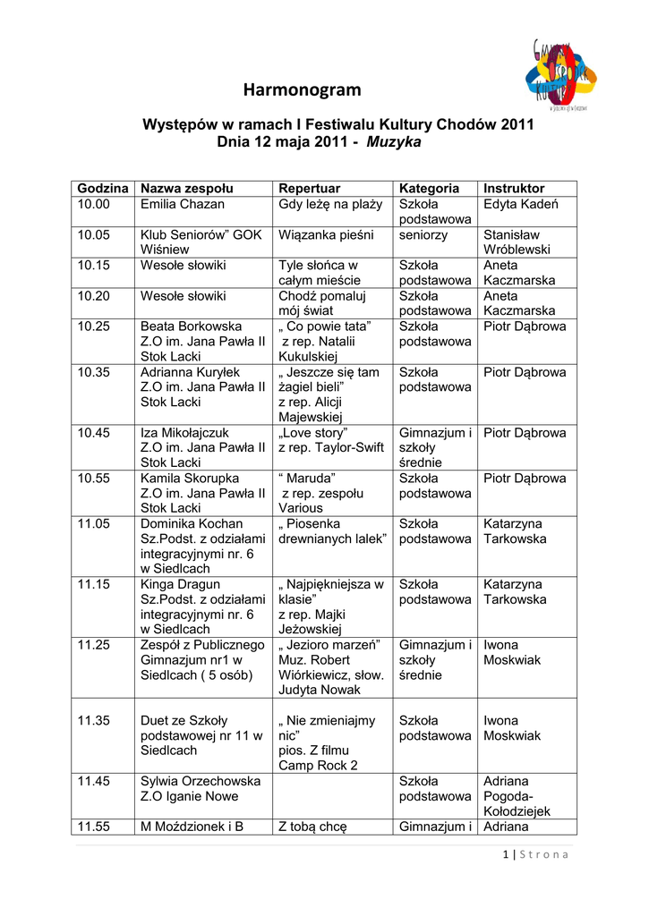 Harmonogram Występów w ramach I Festiwalu Kultury Chodów 2011 Dnia 12 maja 2011 - Muzyka Godzina Nazwa zespołu 10.00 Emilia Chazan 10.15 Klub Seniorów” GOK Wiśniew Wesołe słowiki 10.20 Wesołe słowiki 10.25 Beata Borkowska Z.O im. Jana Pawła II Stok Lacki Adrianna Kuryłek Z.O im. Jana Pawła II Stok Lacki 10.05 10.35 10.45 10.55 11.05 11.15 11.25 Iza Mikołajczuk Z.O im. Jana Pawła II Stok Lacki Kamila Skorupka Z.O im. Jana Pawła II Stok Lacki Dominika Kochan Sz.Podst. z odziałami integracyjnymi nr. 6 w Siedlcach Kinga Dragun Sz.Podst. z odziałami integracyjnymi nr. 6 w Siedlcach Zespół z Publicznego Gimnazjum nr1 w Siedlcach ( 5 osób) 11.35 Duet ze Szkoły podstawowej nr 11 w Siedlcach 11.45 Sylwia Orzechowska Z.O Iganie Nowe 11.55 M Moździonek i B Repertuar Gdy leżę na plaży Wiązanka pieśni Tyle słońca w całym mieście Chodź pomaluj mój świat „ Co powie tata” z rep. Natalii Kukulskiej „ Jeszcze się tam żagiel bieli” z rep. Alicji Majewskiej „Love story” z rep. Taylor-Swift Kategoria Instruktor Szkoła Edyta Kadeń podstawowa seniorzy Stanisław Wróblewski Szkoła Aneta podstawowa Kaczmarska Szkoła Aneta podstawowa Kaczmarska Szkoła Piotr Dąbrowa podstawowa Szkoła Piotr Dąbrowa podstawowa Gimnazjum i Piotr Dąbrowa szkoły średnie Szkoła Piotr Dąbrowa podstawowa “ Maruda” z rep. zespołu Various „ Piosenka Szkoła Katarzyna drewnianych lalek” podstawowa Tarkowska „ Najpiękniejsza w klasie” z rep. Majki Jeżowskiej „ Jezioro marzeń” Muz. Robert Wiórkiewicz, słow. Judyta Nowak Szkoła Katarzyna podstawowa Tarkowska „ Nie zmieniajmy nic” pios. Z filmu Camp Rock 2 Szkoła Iwona podstawowa Moskwiak Z tobą chcę Gimnazjum i Iwona szkoły Moskwiak średnie Szkoła Adriana podstawowa PogodaKołodziejek Gimnazjum i Adriana 1|Strona Jaruszewski Z.O Iganie Nowe Karolina Jastrzębska Z.O Iganie Nowe oglądać świat 12.15 M Tryczyńska i K Krystosiak Szczęśliwej drogi już czas 12.25 Paulina Radzikowska ( Grubale 13) Aleja Gwiazd 12.35 Klaudia Fleks GOK Sarnaki „ A w parkach jesień” 12.45 Zespół Śpiewaczy „AURA” GOK Sarnaki 12.55 Zespół wokalnoinstrumentalny GOK Sarnaki „ Tak bardzo się starałem” z rep. Seweryna Krajewskiego „ Cyganeria” 12.05 Laleczka z saskiej porcelany szkoły średnie Szkoła podstawowa PogodaKołodziejek Adriana PogodaKołodziejek Gimnazjum i Adriana szkoły Pogodaśrednie Kołodziejek Gimnazjum i szkoły średnie Gimnazjum i Tadeusz Goś szkoły średnie Seniorzy Tadeusz Goś Seniorzy Teresa Jakubińska 2|Strona