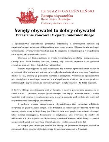 Święty obywatel to dobry obywatel Przesłanie końcowe IX Zjazdu Gnieźnieńskiego 1. Społeczeństwo obywatelskie potrzebuje chrześcijan, a chrześcijanie powinni się angażować w jego budowanie. Odkrywaliśmy to na nowo podczas IX Zjazdu Gnieźnieńskiego. Chrześcijanie i wyznawcy innych religii mają do odegrania niebagatelną rolę w wypełnianiu europejskiej idei obywatelską treścią. Wiara nie jest dla nas ucieczką od świata, lecz motywacją do służby i zaangażowania. Czyniąc nasz świat bardziej ludzkim, chcemy, aby bardziej odpowiadał on godności człowieka, godności dzieci Bożych, którymi jesteśmy. Wbrew pojawiającym się dziś tendencjom, nie możemy ograniczać naszej wiary do prywatności. Dla nas bowiem jest ona sprawą głęboko osobistą, ale nie prywatną. Pragniemy dzielić się nią, chcemy ją publicznie wyrażać i przeżywać. Współczesne społeczeństwa potrzebują ludzi o wrażliwym sumieniu, potrafiących wybierać dobro i odróżniać je od zła. Jesteśmy głęboko przekonani, że człowiek wierzący – święty obywatel – to dobry obywatel. 2. Kryzys, którego doświadczamy dziś w Europie, w naszym przekonaniu zaczyna się w sferze ducha. U podstaw kryzysu gospodarczego tkwi kryzys poczucia sensu i kryzys wartości, brak etyki w życiu ekonomicznym. Motorem rozwoju społeczeństw nie może być niepohamowana konsumpcja, i to na kredyt. U podstaw kryzysu zaangażowania obywatelskiego tkwi natomiast osłabienie motywacji do pracy na rzecz innych. Dla odrodzenia tej motywacji nieodzowne wydaje się nam ożywienie wiary w Boga, który jest Miłością i dał nam przykazanie miłości bliźniego, także miłości nieprzyjaciół. Rozumiemy to przykazanie jako wezwanie do służby, do wolontariatu, do pracy społecznej. Nie możemy pozostawać obojętni wobec biedy, krzywdy i niesprawiedliwości, które dotykają bliźnich. Aby żyć – siebie samego trzeba dać. W Europie głos chrześcijan słabnie. Nie dlatego, że przesłanie Ewangelii straciło na aktualności, lecz z powodu niedostatecznego świadectwa wyznawców Chrystusa. 3. Niepokoimy się o przyszłość Europy. Proces integracji europejskiej niebezpiecznie odrywa się od obywateli, których dobru ma służyć. Obywatele natomiast coraz słabiej utożsamiają się z biurokratycznymi strukturami swoich państw i Unii Europejskiej. Martwią nas narastające tendencje do czynienia nieładu moralnego normą współczesnego społeczeństwa. Niepokój budzi rosnące u wielu Europejczyków poczucie marginalizacji. Apelujemy do przywódców politycznych, aby zwłaszcza w czasach kryzysu wsłuchiwali się w potrzeby i głosy obywateli. Oczekujemy, że ci, którzy kierują narodami, staną na wysokości zadania oraz że sami będą dla obywateli przykładem cnót, które chcieliby propagować. Europa pogrążona w kryzysie potrzebuje dziś prawdziwych mężów stanu, potrafiących wznieść się ponad perspektywę zbliżającej się kolejnej kampanii wyborczej. Zachęcamy do odrzucenia eksperymentów w sferze wartości i do większej troski o najbardziej potrzebujących. 4. Zgromadziliśmy się w Gnieźnie u grobu św. Wojciecha – patrona Kościoła jeszcze niepodzielonego – jako chrześcijanie różnych wyznań. Połączyły nas wspólne modlitwy i dyskusje. Do naszych debat zaprosiliśmy także przedstawicieli innych religii i światopoglądów. W ten sposób potwierdzamy, że pragniemy Europy bardziej chrześcijańskiej – co oczywiście nie znaczy: Europy tylko dla chrześcijan. W pluralistycznym społeczeństwie chcemy współdziałać dla wspólnego dobra ze wszystkimi ludźmi dobrej woli, a zwłaszcza z wyznawcami innych religii monoteistycznych – judaizmu i islamu – dając świadectwo wiary w to, że Bóg chce pokoju między wszystkimi swymi dziećmi. Naszym wspólnym zadaniem jest obrona wartości etycznych, bez których cywilizowany świat nie będzie istnieć. Do wszystkich chrześcijan apelujemy o większe zaangażowanie na rzecz budowy otaczającego nas świata w duchu wartości, jakie wyznajemy. Chrześcijańskie zaangażowanie realizuje się nie tyle w murach świątyni, ile w przepajaniu życiu publicznego, polityki nie wyłączając, zasadami płynącymi z Ewangelii. W europejskiej debacie publicznej nie może zabraknąć wspólnego głosu chrześcijan. Będziemy dążyć do pogłębienia takiej współpracy w skali naszego kontynentu. 5. Jak uczył nas Chrystus, chrześcijanie mają być solą ziemi. Podczas IX Zjazdu Gnieźnieńskiego szukaliśmy odpowiedzi na pytanie, co to znaczy w praktyce. Chcemy pamiętać, że każdy człowiek jest ważny, że każdy człowiek jest potrzebny, że każdemu trzeba pomagać i od każdego trzeba wymagać – a najwięcej od samych siebie.