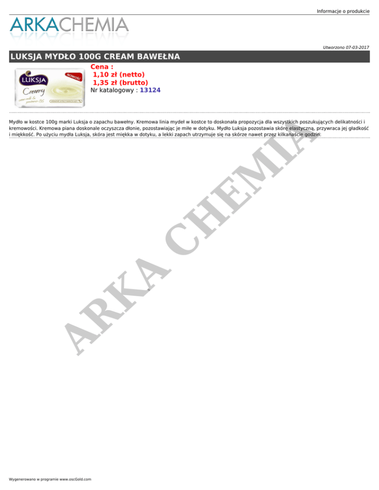 Informacje o produkcie Utworzono 07-03-2017 LUKSJA MYDŁO 100G CREAM BAWEŁNA Cena : 1,10 zł (netto) 1,35 zł (brutto) Nr katalogowy : 13124 AR K A C H EM IA Mydło w kostce 100g marki Luksja o zapachu bawełny. Kremowa linia mydeł w kostce to doskonała propozycja dla wszystkich poszukujących delikatności i kremowości. Kremowa piana doskonale oczyszcza dłonie, pozostawiając je miłe w dotyku. Mydło Luksja pozostawia skórę elastyczną, przywraca jej gładkość i miękkość. Po użyciu mydła Luksja, skóra jest miękka w dotyku, a lekki zapach utrzymuje się na skórze nawet przez kilkanaście godzin. Wygenerowano w programie www.oscGold.com