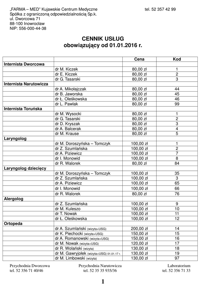 „FARMA – MED” Kujawskie Centrum Medyczne Spółka z ograniczoną odpowiedzialnością Sp.k. ul. Dworcowa 71 88-100 Inowrocław NIP: 556-000-44-38 tel. 52 357 42 99 CENNIK USŁUG obowiązujący od 01.01.2016 r. Cena Kod dr M. Kiczek dr E. Kiczek dr G. Tasarski 80,00 zł 80,00 zł 80,00 zł 1 2 3 dr A. Mikołajczak dr B. Jaworska dr Ł. Oleśkowska dr L. Pawlak 80,00 zł 80,00 zł 80,00 zł 80,00 zł 44 45 46 99 dr M. Wysocki dr G. Tasarski dr D. Kryszak dr A. Balcerak dr M. Krause 80,00 zł 80,00 zł 80,00 zł 80,00 zł 80,00 zł 1 2 3 4 5 dr M. Doroszyńska – Tomczyk dr Z. Szumlańska dr A. Piziewicz dr I. Monowid dr R. Walorek 100,00 zł 100,00 zł 100,00 zł 100,00 zł 80,00 zł 1 2 7 8 84 dr M. Doroszyńska – Tomczyk dr Z. Szumlańska dr A. Piziewicz dr I. Monowid dr R. Walorek 100,00 zł 100,00 zł 100,00 zł 100,00 zł 80,00 zł 35 3 65 66 76 dr Z. Szumlańska dr M. Kuleszo dr T. Nowak dr Ł. Oleśkowska 100,00 zł 100,00 zł 100,00 zł 100,00 zł 9 10 11 12 dr A. Szumlański (wizyta+USG) dr K. Piechocki (wizyta+USG) dr A. Romanowski (wizyta+USG) dr M. Nowak (wizyta+USG) dr R. Wolański (wizyta) dr M. Gawryjołek (wizyta+USG) 01.01.17 r. dr M. Limbowski (wizyta) 200,00 zł 150,00 zł 150,00 zł 120,00 zł 130,00 zł 130,00 zł 130,00 zł 14 15 16 17 18 19 97 Internista Dworcowa Internista Narutowicza Internista Toruńska Laryngolog Laryngolog dziecięcy Alergolog Ortopeda Przychodnia Dworcowa tel. 52 356 71 40/46 Przychodnia Narutowicza tel. 52 35 35 935/36 1 Laboratorium tel. 52 356 71 33 „FARMA – MED” Kujawskie Centrum Medyczne Spółka z ograniczoną odpowiedzialnością Sp.k. ul. Dworcowa 71 88-100 Inowrocław NIP: 556-000-44-38 tel. 52 357 42 99 CENNIK USŁUG obowiązujący od 01.01.2016 r. dr Ł. Jaworski (wizyta+USG) dr R. Żurawski (wizyta+USG) dr J. Zabrzyński (wizyta+USG) 100,00 zł 150,00 zł 100,00 zł 21 22 111 dr W. Skiwski 100,00 zł 37 dr N. Mbamu dr N. Mbamu (wizyta + cytologia + USG) dr N. Mbamu (dopłata za cytologie lub USG) dr J. Wójcik dr J. Wójcik (wizyta + cytologia + USG) dr J. Wójcik (dopłata za cytologie lub USG) dr R. Rzyp dr R. Rzyp (wizyta + cytologia + USG) dr R. Rzyp (dopłata za cytologie lub USG) dr M. Szymański dr M. Szymański (wizyta + cytologia + USG) dr M. Szymański (dopłata za cytologie lub USG) 100,00 zł 150,00 zł 50,00 zł 100,00 zł 150,00 zł 50,00 zł 100,00 zł 150,00 zł 50,00 zł 100,00 zł 150,00 zł 50,00 zł 23 24 25 26 27 28 29 30 31 100 101 102 dr A. Rogoziewicz dr T. Adamus dr A. Pawłowski dr E. Kozak 120,00 zł 100,00 zł 100,00 zł 100,00 zł 32 33 34 36 dr M. Froehlich /wizyta/ dr M. Froehlich /wizyta+USG/ dr M. Zaremba /wizyta/ dr M. Zaremba /wizyta+USG/ dr D. Krzemień /wizyta/ dr D. Krzemień /wizyta+USG/ dr M. Kwiatkowski /wizyta/ dr M. Kwiatkowski /wizyta+USG/ 100,00 zł 150,00 zł 100,00 zł 150,00 zł 100,00 zł 150,00 zł 100,00 zł 150,00 zł 38 39 40 41 106 107 109 110 dr A. Mikołajczak dr B. Jaworska dr L. Pawlak 80,00 zł 80,00 zł 80,00 zł 42 43 98 dr D. Ciszewska - Gruchot dr G. Adamska - Bartoszewska dr P. Krause dr A. Niezgoda dr U. Adamska Przychodnia Narutowicza tel. 52 35 35 935/36 100,00 zł 100,00 zł 100,00 zł 100,00 zł 100,00 zł 47 48 49 104 105 Laboratorium tel. 52 356 71 33 Neurolog dziecięcy Ginekolog Neurolog Urolog Pediatra Dermatolog Przychodnia Dworcowa tel. 52 356 71 40/46 2 „FARMA – MED” Kujawskie Centrum Medyczne Spółka z ograniczoną odpowiedzialnością Sp.k. ul. Dworcowa 71 88-100 Inowrocław NIP: 556-000-44-38 tel. 52 357 42 99 CENNIK USŁUG obowiązujący od 01.01.2016 r. Okulista dr W. Stężała dr B. Włodarczyk dr M. Gawrońska dr L.Świerczyńska-Żuromska dr M. Prusak - Grabkowska dr G. Jędrzejczak 100,00 zł 100,00 zł 120,00 zł 120,00 zł 100,00 zł 100,00 zł 50 51 52 53 54 55 dr A. Shawkat /wizyta/ dr A. Shawkat /wizyta+USG/ dr A. Szotkiewicz /wizyta/ dr A. Szotkiewicz /wizyta+USG/ 100,00 zł 150,00 zł 100,00 zł 150,00 zł 56 57 58 59 Prof. W. Beuth 150,00 zł 60 dr M. Krause dr A. Zboiński 100,00 zł 150,00 zł 200,00 zł 100,00 zł 90,00 zł 100,00 zł 150,00 zł 200,00 zł 100,00 zł 150,00 zł 200,00 zł 100,00 zł 150,00 zł 200,00 zł 100,00 zł 100,00 zł 61 62 63 64 85 86 87 65 88 89 90 91 92 93 103 112 dr D. Cyganiak dr M. Sieńska dr A. Cybulski 100,00 zł 120,00 zł 120,00 zł 5 71 108 dr D. Kuleszo dr P. Niezgoda dr K. Bartkowiak 100,00 zł 100,00 zł 120,00 zł 72 109 6 dr M. Borucki 120,00 zł 73 Chirurg chorób naczyń Neurochirurg USG dr A. Malec dr M. Gajdzińska dr K. Błaszczuk dr R. Skwarek dr O. Bartoszewicz Psychiatra Kardiolog Chirurg - gastrolog Przychodnia Dworcowa tel. 52 356 71 40/46 Przychodnia Narutowicza tel. 52 35 35 935/36 3 Laboratorium tel. 52 356 71 33 „FARMA – MED” Kujawskie Centrum Medyczne Spółka z ograniczoną odpowiedzialnością Sp.k. ul. Dworcowa 71 88-100 Inowrocław NIP: 556-000-44-38 tel. 52 357 42 99 CENNIK USŁUG obowiązujący od 01.01.2016 r. Psycholog mgr R. Buczyńska 80,00 zł 160,00 zł 7 8 dr M. Kuleszo dr B. Janowska 80,00 zł 100,00 zł 74 75 dr B. Ogórkiewicz dr D. Wolańska 100,00 zł 100,00 zł 77 83 dr P. Lewicki /wizyta/ dr P. Lewicki /wizyta+USG/ 100,00 zł 150,00 zł 78 79 Mgr M. Szydłowska-Baranowska 40,00 zł 10 100,00 zł I, 80,00 zł II 11 12 60,00 zł 81 18,00 zł 18,00 zł 18,00 zł 18,00 zł 18,00 zł 4 5 6 13 20 E. Kowalska 50,00 zł 13 94 Narutowicza dr M. Lewandwska dr J. Domagała-Kocoń 100,00 zł 100,00 zł 14 15 dr T. Gertig dr G. Górny od 01.12.2016 r. 130,00 zł 140,00 zł 70 dr G. Bała 150,00 zł 95 Badanie psychologiczne osób ubiegających się o pozwolenie na broń Pulmunolog Reumatolog Chirurg ogólny Logopeda Diabetolog dr M. Nadrajkowska Lekarz sportowy dr A. Szumlański (cena nie obejmuje badań laboratoryjnych i innych badań wymaganych w określonej dyscyplinie sportowej) Laryngolog Medycyna sportowa dr M. Doroszyńska – Tomczyk dr Z. Szumlańska dr A. Piziewicz dr I. Monowid dr R. Walorek Dietetyk Rehabilitacja Endokrynolog Gastrolo