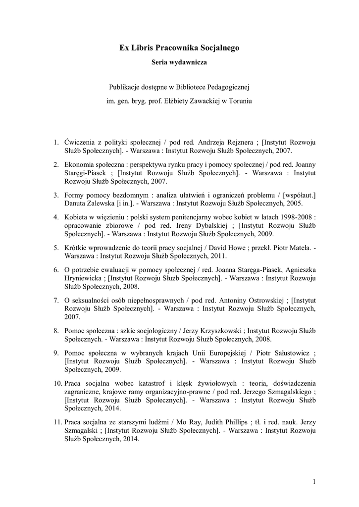 Ex Libris Pracownika Socjalnego Seria wydawnicza Publikacje dostępne w Bibliotece Pedagogicznej im. gen. bryg. prof. Elżbiety Zawackiej w Toruniu 1. Ćwiczenia z polityki społecznej / pod red. Andrzeja Rejznera ; [Instytut Rozwoju Służb Społecznych]. - Warszawa : Instytut Rozwoju Służb Społecznych, 2007. 2. Ekonomia społeczna : perspektywa rynku pracy i pomocy społecznej / pod red. Joanny Staręgi-Piasek ; [Instytut Rozwoju Służb Społecznych]. - Warszawa : Instytut Rozwoju Służb Społecznych, 2007. 3. Formy pomocy bezdomnym : analiza ułatwień i ograniczeń problemu / [współaut.] Danuta Zalewska [i in.]. - Warszawa : Instytut Rozwoju Służb Społecznych, 2005. 4. Kobieta w więzieniu : polski system penitencjarny wobec kobiet w latach 1998-2008 : opracowanie zbiorowe / pod red. Ireny Dybalskiej ; [Instytut Rozwoju Służb Społecznych]. - Warszawa : Instytut Rozwoju Służb Społecznych, 2009. 5. Krótkie wprowadzenie do teorii pracy socjalnej / David Howe ; przekł. Piotr Matela. Warszawa : Instytut Rozwoju Służb Społecznych, 2011. 6. O potrzebie ewaluacji w pomocy społecznej / red. Joanna Staręga-Piasek, Agnieszka Hryniewicka ; [Instytut Rozwoju Służb Społecznych]. - Warszawa : Instytut Rozwoju Służb Społecznych, 2008. 7. O seksualności osób niepełnosprawnych / pod red. Antoniny Ostrowskiej ; [Instytut Rozwoju Służb Społecznych]. - Warszawa : Instytut Rozwoju Służb Społecznych, 2007. 8. Pomoc społeczna : szkic socjologiczny / Jerzy Krzyszkowski ; Instytut Rozwoju Służb Społecznych. - Warszawa : Instytut Rozwoju Służb Społecznych, 2008. 9. Pomoc społeczna w wybranych krajach Unii Europejskiej / Piotr Sałustowicz ; [Instytut Rozwoju Służb Społecznych]. - Warszawa : Instytut Rozwoju Służb Społecznych, 2009. 10. Praca socjalna wobec katastrof i klęsk żywiołowych : teoria, doświadczenia zagraniczne, krajowe ramy organizacyjno-prawne / pod red. Jerzego Szmagalskiego ; [Instytut Rozwoju Służb Społecznych]. - Warszawa : Instytut Rozwoju Służb Społecznych, 2014. 11. Praca socjalna ze starszymi ludźmi / Mo Ray, Judith Phillips ; tł. i red. nauk. Jerzy Szmagalski ; [Instytut Rozwoju Służb Społecznych]. - Warszawa : Instytut Rozwoju Służb Społecznych, 2014. 1 12. Seksualność, niepełnosprawność, rzeczywistość : współczesne konteksty badawcze w problematyce seksualności człowieka z niepełnosprawnością / red. nauk. Remigiusz Janusz Kijak ; Instytut Rozwoju Służb Społecznych. - Warszawa : Instytut Rozwoju Służb Społecznych, 2013. 13. Stres i wypalenie zawodowe pracowników socjalnych / Jerzy Szmagalski. - Warszawa : Instytut Rozwoju Służb Społecznych, 2004. 14. Superwizja pracy socjalnej : zastosowania i dylematy / pod red. Jerzego Szmagalskiego ; [Instytut Rozwoju Służb Społecznych]. - Wyd. 2. - Warszawa : Instytut Rozwoju Służb Społecznych, 2009. 15. Superwizja pracy socjalnej : zastosowania i dylematy / pod red. Jerzego Szmagalskiego. - Warszawa : Instytut Rozwoju Służb Społecznych, 2005. ul. Dąbrowskiego 4 87-100 Toruń http://www.bptorun.edu.pl 2