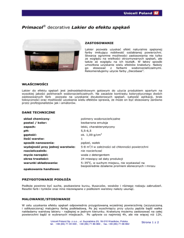 Primacol® decorative Lakier do efektu spękań ZASTOSOWANIE Lakier pozwala uzyskać efekt naturalnie spękanej farby imitujący nobliwość ozdabianej powierzchni. Stwarza ogromne możliwości zastosowania nie tylko ze względu na wielkości otrzymywanych spękań, ale także ze względu na ich kształt. W łatwy sposób umożliwia uzyskanie wielu efektów krakelury. Należy go stosować z farbami wodorozcieńczalnymi. Rekomendujemy użycie farby „Decobase”. WŁAŚCIWOŚCI Lakier do efektu spękań jest jednoskładnikowym gotowym do użycia produktem opartym na wysokiej jakości polimerach wodorozcieńczalnych. Na zasadzie kontrastu kolorystycznego dwóch zastosowanych farb pozwala na uzyskanie dwukolorowych spękań. Łatwość aplikacji, brak toksyczności oraz możliwość uzyskania wielu efektów sprawia, że może on być stosowany zarówno przez profesjonalistów jak i amatorów. DANE TECHNICZNE skład chemiczny: polimery wodorozcieńczalne postać / kolor: bezbarwna emulsja zapach: lekki, charakterystyczny pH: 5,5-6,5 gęstość: ok. 1,00 g/cm3 ilość warstw: 1 sposób nanoszenia: pędzel, wałek wydajność przy jednej warstwie: 5-8 m2/l w zależności od chłonności powierzchni rozcieńczalnik: nie rozcieńczać mycie narzędzi: woda z detergentem okres trwałości: 24 miesięcy od daty produkcji warunki składowania: 5–35oC, w suchym miejscu, nie wystawiać na bezpośrednie działanie promieni słonecznych i mrozu opakowania handlowe: PRZYGOTOWANIE PODŁOŻA Podłoże powinno być suche, pozbawione kurzu, tłuszczów, wosków i różnego rodzaju zabrudzeń. Resztki farb i tynków oraz inne niezwiązane z podłożem warstwy należy usunąć. MALOWANIE/STOSOWANIE W celu uzyskania efektu spękań odpowiednio przygotowaną wcześniej powierzchnię (oczyszczoną i odtłuszczoną) malujemy farbą podkładową. Po jej wyschnięciu przy użyciu pędzla bądź wałka nakładamy warstwę lakieru - najlepiej w jednym kierunku. Krakelurę możemy zastosować na całej powierzchni bądź w wybranych miejscach. Po upływie co najmniej 4h, ale nie więcej niż 12h, Unicell Poland Sp. z o.o. , ul. Supraślska 25, 16-010 Wasilków, Polska tel. +48 (85) 71 04 000 , +48 (85) 71 86 860 , fax. +48 (85) 71 86 862 Strona 1 z 2 pokrywamy całą powierzchnię farbą w innym odcieniu niż farba podkładowa (kontrastującą z warstwą podkładową). Zazwyczaj natychmiast po nałożeniu farby zewnętrznej możemy obserwować jej pękanie. Spękania mają kolor farby zastosowanej jako pierwszej. Jako farbę podkładową i nawierzchniową polecamy farbę dekoracyjną „Decobase” odpowiednio zabarwioną np.: Collorix’em. Na wielkość spękań wpływa grubość nałożonego lakieru oraz farby wierzchniej. By uzyskać spękania drobne, należy nałożyć cienką warstwę lakieru, analogicznie – farby wierzchniej. W przypadku odwrotnym należy zastosować grubsze warstwy wymienionych produktów. Kształt i wielkość spękań zależy również od rodzaju użytego narzędzia (wałek, pędzel, gąbka). Aby spękania były widoczne, kolory zastosowanych w obydwu warstwach farb muszą ze sobą kontrastować. I tak, do jasnych spękań używamy jasnej farby podkładowej i dużo ciemniejszej wierzchniej. Do efektu ciemnych spękań, robimy na odwrót. Uwaga! Efekt finalny zależy od wielu czynników m.in. grubości warstw, techniki nakładania, rodzaju farby. Konieczne jest przeprowadzenie próby na małej powierzchni, aby upewnić się co do uzyskanego ostatecznie wyglądu powierzchni. BEZPIECZEŃSTWO STOSOWANIA Produkt niepalny. Nie klasyfikowany jako niebezpieczny. W trakcie prac malarskich i po ich zakończeniu pomieszczenie wietrzyć do zaniku zapachu. Produkt przechowywać w miejscu niedostępnym dla dzieci. Szczegółowe informacje zawarte w karcie charakterystyki produktu. NORMY/ATESTY/CERTYFIKATY Atest PZH INFORMACJE PRAWNE Wszystkie informacje i dane zawarte tutaj są podane w dobrej wierze i w zgodzie z posiadaną przez nasze laboratoria wiedzą. Muszą jednak być przyjęte jako oznaczenia bez gwarancji, jeżeli produkt znajduje się poza naszą kontrolą. Informacja techniczna nie jest świadectwem jakości produktu ani też ofertą. Producent nie odpowiada za niewłaściwe użycie informacji zawartych na tej karcie, ani też za konsekwencje z tego wynikające. W przypadku wątpliwości zawsze należy przeprowadzić próbę. Producent zastrzega sobie prawo do zmiany powyższych danych bez powiadamiania klienta. Zapraszamy na www.primacol.pl. nasze strony internetowe: www.unicell.pl, www.dekorujemydom.pl, Wydanie Autor: Monika Ostapkiewicz Data: 19.12.2008r Aktualizacja Autor: Kamila Jurowczyk Data: 31-10-2012 Unicell Poland Sp. z o.o. , ul. Supraślska 25, 16-010 Wasilków, Polska tel. +48 (85) 71 04 000 , +48 (85) 71 86 860 , fax. +48 (85) 71 86 862 Strona 2 z 2