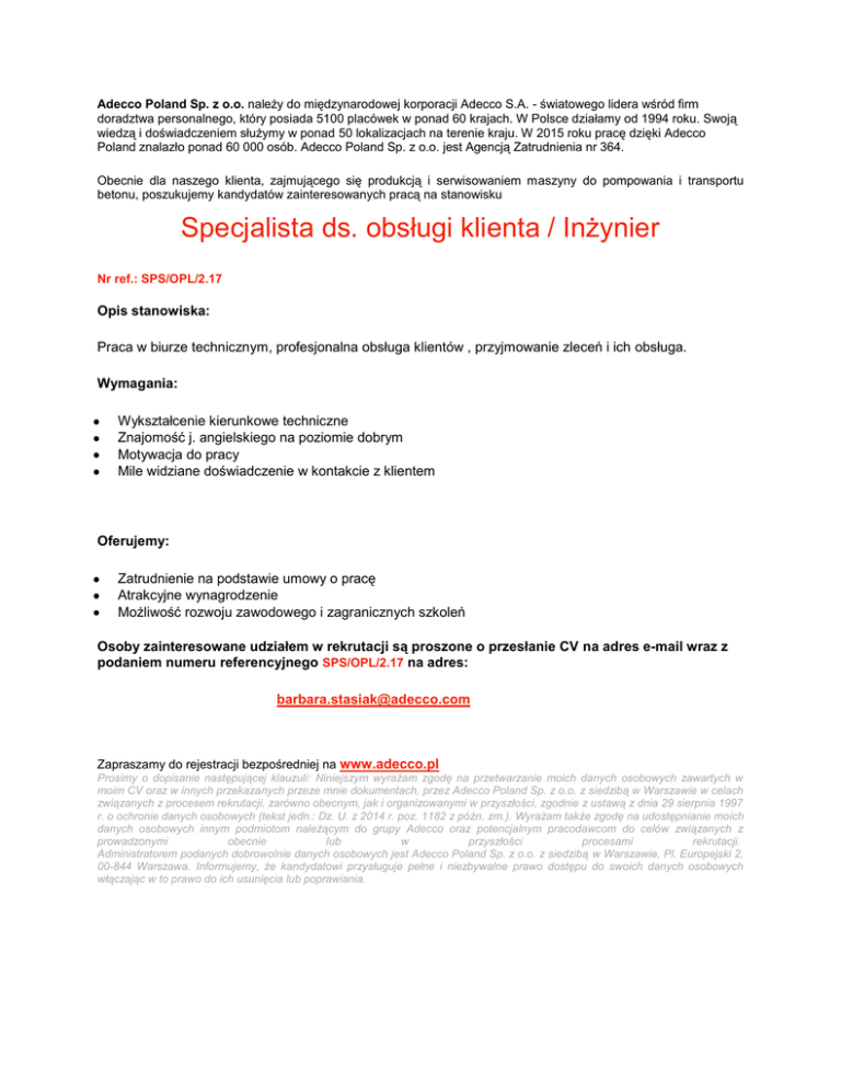 Adecco Poland Sp. z o.o. należy do międzynarodowej korporacji Adecco S.A. - światowego lidera wśród firm doradztwa personalnego, który posiada 5100 placówek w ponad 60 krajach. W Polsce działamy od 1994 roku. Swoją wiedzą i doświadczeniem służymy w ponad 50 lokalizacjach na terenie kraju. W 2015 roku pracę dzięki Adecco Poland znalazło ponad 60 000 osób. Adecco Poland Sp. z o.o. jest Agencją Zatrudnienia nr 364. Obecnie dla naszego klienta, zajmującego się produkcją i serwisowaniem maszyny do pompowania i transportu betonu, poszukujemy kandydatów zainteresowanych pracą na stanowisku Specjalista ds. obsługi klienta / Inżynier Nr ref.: SPS/OPL/2.17 Opis stanowiska: Praca w biurze technicznym, profesjonalna obsługa klientów , przyjmowanie zleceń i ich obsługa. Wymagania: Wykształcenie kierunkowe techniczne Znajomość j. angielskiego na poziomie dobrym Motywacja do pracy Mile widziane doświadczenie w kontakcie z klientem Oferujemy: Zatrudnienie na podstawie umowy o pracę Atrakcyjne wynagrodzenie Możliwość rozwoju zawodowego i zagranicznych szkoleń Osoby zainteresowane udziałem w rekrutacji są proszone o przesłanie CV na adres e-mail wraz z podaniem numeru referencyjnego SPS/OPL/2.17 na adres: [email protected] Zapraszamy do rejestracji bezpośredniej na www.adecco.pl Prosimy o dopisanie następującej klauzuli: Niniejszym wyrażam zgodę na przetwarzanie moich danych osobowych zawartych w moim CV oraz w innych przekazanych przeze mnie dokumentach, przez Adecco Poland Sp. z o.o. z siedzibą w Warszawie w celach związanych z procesem rekrutacji, zarówno obecnym, jak i organizowanymi w przyszłości, zgodnie z ustawą z dnia 29 sierpnia 1997 r. o ochronie danych osobowych (tekst jedn.: Dz. U. z 2014 r. poz. 1182 z późn. zm.). Wyrażam także zgodę na udostępnianie moich danych osobowych innym podmiotom należącym do grupy Adecco oraz potencjalnym pracodawcom do celów związanych z prowadzonymi obecnie lub w przyszłości procesami rekrutacji. Administratorem podanych dobrowolnie danych osobowych jest Adecco Poland Sp. z o.o. z siedzibą w Warszawie, Pl. Europejski 2, 00-844 Warszawa. Informujemy, że kandydatowi przysługuje pełne i niezbywalne prawo dostępu do swoich danych osobowych włączając w to prawo do ich usunięcia lub poprawiania.