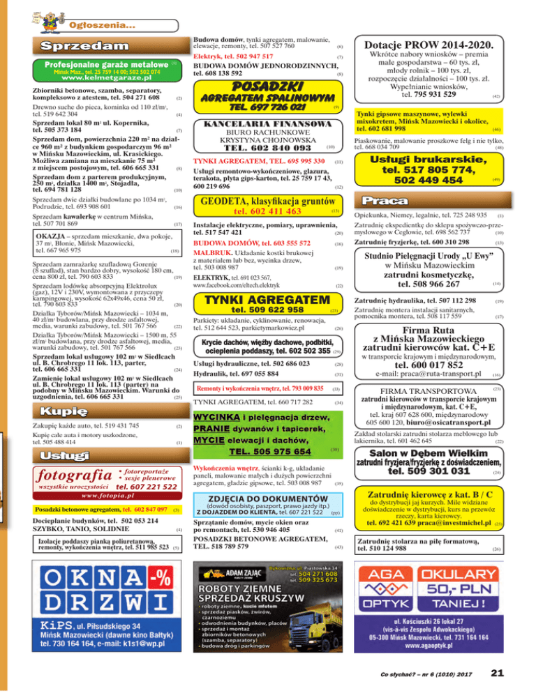 Ogłoszenia... Sprzedam Profesjonalne garaże metalowe (1) Mińsk Maz., tel. 25 759 14 00; 502 502 074 www.kelmetgaraze.pl (2) Drewno suche do pieca, kominka od 110 zł/m3, tel. 519 642 304 (4) Sprzedam lokal 80 m2 ul. Kopernika, tel. 505 373 184 (7) Sprzedam dom, powierzchnia 220 m² na działce 960 m² z budynkiem gospodarczym 96 m² w Mińsku Mazowieckim, ul. Krasickiego. Możliwa zamiana na mieszkanie 75 m² (8) z miejscem postojowym, tel. 606 665 331 Sprzedam dom z parterem produkcyjnym, 250 m2, działka 1400 m2, Stojadła, tel. 694 781 128 (10) Sprzedam dwie działki budowlane po 1034 m2, Podrudzie, tel. 693 908 601 (16) Sprzedam kawalerkę w centrum Mińska, tel. 507 701 869 (17) OKAZJA – sprzedam mieszkanie, dwa pokoje, 37 m2, Błonie, Mińsk Mazowiecki, (18) tel. 667 965 975 Sprzedam zamrażarkę szufladową Gorenje (8 szuflad), stan bardzo dobry, wysokość 180 cm, cena 800 zł, tel. 790 603 833 (19) Działka Tyborów/Mińsk Mazowiecki – 1034 m, 40 zł/m2 budowlana, przy drodze asfaltowej, media, warunki zabudowy, tel. 501 767 566 (6) Elektryk, tel. 502 947 517 (7) BUDOWA DOMÓW JEDNORODZINNYCH, tel. 608 138 592 (8) Posadzki Zbiorniki betonowe, szamba, separatory, kompleksowo z atestem, tel. 504 271 608 Sprzedam lodówkę absorpcyjną Elektrolux (gaz), 12V i 230V, wymontowana z przyczepy kampingowej, wysokość 62x49x46, cena 50 zł, tel. 790 603 833 Budowa domów, tynki agregatem, malowanie, elewacje, remonty, tel. 507 527 760 (20) (22) Działka Tyborów/Mińsk Mazowiecki – 1500 m, 55 zł/m2 budowlana, przy drodze asfaltowej, media, warunki zabudowy, tel. 501 767 566 (23) Sprzedam lokal usługowy 102 m2 w Siedlcach ul. B. Chrobrego 11 lok. 113, parter, tel. 606 665 331 (24) Zamienię lokal usługowy 102 m2 w Siedlcach ul. B. Chrobrego 11 lok. 113 (parter) na podobny w Mińsku Mazowieckim. Warunki do uzgodnienia, tel. 606 665 331 (25) Kupię Zakupię każde auto, tel. 519 431 745 (2) Kupię całe auta i motory uszkodzone, tel. 505 488 414 (1) agregatem spalinowym tel. 697 726 021 TEL. 602 840 093 TYNKI AGREGATEM, TEL. 695 995 330 (11) Usługi remontowo-wykończeniowe, glazura, terakota, płyta gips-karton, tel. 25 759 17 43, 600 219 696 (12) wszystkie uroczystości tel. 607 221 522 www.fotopia.pl Posadzki betonowe agregatem, tel. 602 847 097 tel. 602 411 463 (13) Docieplanie budynków, tel. 502 053 214 SZYBKO, TANIO, SOLIDNIE Izolacje poddaszy pianką poliuretanową, remonty, wykończenia wnętrz, tel. 511 985 523 (4) (5) (46) Usługi brukarskie, tel. 517 805 774, 502 449 454 (49) Opiekunka, Niemcy, legalnie, tel. 725 248 935 (1) Instalacje elektryczne, pomiary, uprawnienia, tel. 517 547 421 (20) Zatrudnię ekspedientkę do sklepu spożywczo-prze(10) mysłowego w Cegłowie, tel. 698 562 737 BUDOWA DOMÓW, tel. 603 555 572 (16) Zatrudnię fryzjerkę, tel. 600 310 298 MALBRUK. Układanie kostki brukowej z materiałem lub bez, wycinka drzew, tel. 503 008 987 (19) ELEKTRYK, tel. 691 023 567, www.facebook.com/eltech.elektryk (22) TYNKI AGREGATEM tel. 509 622 958 (23) Parkiety: układanie, cyklinowanie, renowacja, tel. 512 644 523, parkietymarkowicz.pl (26) Krycie dachów, więźby dachowe, podbitki, ocieplenia poddaszy, tel. 602 502 355 (29) Usługi hydrauliczne, tel. 502 686 023 (28) Hydraulik, tel. 697 055 884 (31) Remonty i wykończenia wnętrz, tel. 793 009 835 (33) TYNKI AGREGATEM, tel. 660 717 282 (34) (13) Studnio Pielęgnacji Urody „U Ewy” w Mińsku Mazowieckim zatrudni kosmetyczkę, (14) tel. 508 966 267 Zatrudnię hydraulika, tel. 507 112 298 (19) Zatrudnię montera instalacji sanitarnych, pomocnika montera, tel. 508 117 559 (17) Firma Ruta z Mińska Mazowieckiego zatrudni kierowców kat. C+E w transporcie krajowym i międzynarodowym, tel. 600 017 852 e-mail: [email protected] (16) (23) FIRMA TRANSPORTOWA zatrudni kierowców w transporcie krajowym i międzynarodowym, kat. C+E, tel. kraj 607 628 600, międzynarodowy 605 600 120, [email protected] Zakład stolarski zatrudni stolarza meblowego lub (22) lakiernika, tel. 601 462 645 Wykończenia wnętrz, ścianki k-g, układanie paneli, malowanie małych i dużych powierzchni agregatem, gładzie gipsowe, tel. 503 008 987 Salon w Dębem Wielkim zatrudni fryzjera/fryzjerkę z doświadczeniem, (24) tel. 509 301 031 (35) Zatrudnię kierowcę z kat. B / C ZDJĘCIA DO DOKUMENTÓW (3) Tynki gipsowe maszynowe, wylewki mixokretem, Mińsk Mazowiecki i okolice, tel. 602 681 998 Praca GEODETA, klasyfikacja gruntów (30) • fotoreportaże • sesje plenerowe (42) Piaskowanie, malowanie proszkowe felg i nie tylko, tel. 668 034 709 (48) (10) Usługi fotografia Wkrótce nabory wniosków – premia małe gospodarstwa – 60 tys. zł, młody rolnik – 100 tys. zł, rozpoczęcie działalności – 100 tys. zł. Wypełnianie wniosków, tel. 795 931 529 (9) KANCELARIA FINANSOWA BIURO RACHUNKOWE KRYSTYNA CHOJNOWSKA Dotacje PROW 2014-2020. (dowód osobisty, paszport, prawo jazdy itp.) Z DOJAZDEM DO KLIENTA, tel. 607 221 522 (pp) Sprzątanie domów, mycie okien oraz po remontach, tel. 530 946 405 (41) POSADZKI BETONOWE AGREGATEM, TEL. 518 789 579 (43) do dystrybucji jaj kurzych. Mile widziane doświadczenie w dystrybucji, kurs na przewóz rzeczy, karta kierowcy. tel. 692 421 639 [email protected] (25) Zatrudnię stolarza na piłę formatową, tel. 510 124 988 Co słychać? – nr 6 (1010) 2017 (26) 21