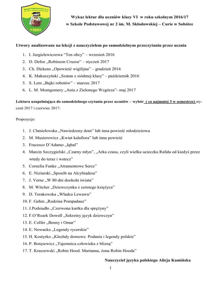 Wykaz lektur dla uczniów klasy VI w roku szkolnym 2016/17 w Szkole Podstawowej nr 2 im. M. Skłodowskiej – Curie w Sobótce Utwory analizowane na lekcji z nauczycielem po samodzielnym przeczytaniu przez ucznia 1. I. Jurgielewiczowa “Ten obcy” – wrzesień 2016 2. D. Defoe „Robinson Cruzoe” – styczeń 2017 3. Ch. Dickens „Opowieść wigilijna” – grudzień 2016 4. K. Makuszyński „Szatan z siódmej klasy” – październik 2016 5. S. Lem „Bajki robotów” – marzec 2017 6. L. M. Montgomery „Ania z Zielonego Wzgórza”- maj 2017 Lektura uzupełniająca do samodzielnego czytania przez uczniów – wybór ( co najmniej 3 w semestrze) styczeń 2017 i czerwiec 2017: Propozycje: 1. J. Chmielewska „Nawiedzony dom” lub inna powieść młodzieżowa 2. M. Musierowicz „Kwiat kalafiora” lub inna powieść 3. Fracesco D’Adamo „Iqbal” 4. Marcin Szczygielski „Czarny młyn”, „Arka czasu, czyli wielka ucieczka Rafała od kiedyś przez wtedy do teraz i wstecz” 5. Cornelia Funke „Atramentowe Serce” 6. E. Niziurski „Sposób na Alcybiadesa” 7. J. Verne „W 80 dni dookoła świata” 8. M. Witcher „Dziewczynka z szóstego księżyca” 9. D. Terakowska „Władca Lewawu” 10. F. Gehm „Rodzina Pompadauz” 11. J.Podsiadło „Czerwona kartka dla sprężyny” 12. F.O’Roark Dowell „Sekretny język dziewczyn” 13. E. Colfer „Benny i Omar” 14. E. Nowacka „Legendy rycerskie” 15. H. Kostyrko „Klechdy domowe. Podania i legendy polskie” 16. P. Boręsewicz „Tajemnica człowieka z blizną” 17. T. Kraszewski „Robin Hood. Marianna, żona Robin Hooda” Nauczyciel języka polskiego Alicja Kamińska 1