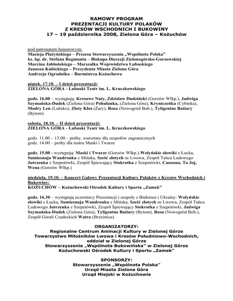 RAMOWY PROGRAM PREZENTACJI KULTURY POLAKÓW Z KRESÓW WSCHODNICH I BUKOWINY 17 – 19 października 2008, Zielona Góra – Kożuchów pod patronatem honorowym: Macieja Płażyńskiego – Prezesa Stowarzyszenia „Wspólnota Polska” ks. bp. dr. Stefana Regmunta – Biskupa Diecezji Zielonogórsko-Gorzowskiej Marcina Jabłońskiego – Marszałka Województwa Lubuskiego Janusza Kubickiego – Prezydenta Miasta Zielona Góra Andrzeja Ogrodnika – Burmistrza Kożuchowa piątek, 17.10. – I dzień prezentacji: ZIELONA GÓRA - Lubuski Teatr im. L. Kruczkowskiego godz. 16.00 – występują: Kresowe Nuty, Zdzisław Dudziński (Gorzów Wlkp.), Jadwiga Szymańska-Dudek (Zielona Góra) Pohulanka, (Zielona Góra), Kryniczeńka (Cybinka), Modry Len (Lubsko), Złoty Kłos (Żary), Rosa (Nowogród Bob.), Tyligentne Batiary (Bytom) sobota, 18.10. – II dzień prezentacji: ZIELONA GÓRA - Lubuski Teatr im. L. Kruczkowskiego godz. 11.00 – 13.00 – próby, warsztaty dla zespołów zagranicznych godz. 14.00 – próby dla teatru Maski i Twarze godz. 15.00 - występują: Maski i Twarze (Gorzów Wlkp.),Wołyńskie słowiki z Łucka, Sumiesnaja Wandrouka z Mińska, Sześć złotych ze Lwowa, Zespół Tańca Ludowego Jutrzenka z Szepetówki, Zespół Śpiewający Stokrotka z Szepetówki, Canzona, Ta Joj, Wena (Gorzów Wlkp.) niedziela, 19.10. – Koncert Galowy Prezentacji Kultury Polaków z Kresów Wschodnich i Bukowiny: KOŻUCHÓW – Kożuchowski Ośrodek Kultury i Sportu „Zamek” godz. 16.30 – występują uczestnicy Prezentacji i zespoły z Białorusi i Ukrainy: Wołyńskie słowiki z Łucka, Sumiesnaja Wandrouka z Mińska, Sześć złotych ze Lwowa, Zespół Tańca Ludowego Jutrzenka z Szepetówki, Zespół Śpiewający Stokrotka z Szepetówki, Jadwiga Szymańska-Dudek (Zielona Góra), Tyligentne Batiary (Bytom), Rosa (Nowogród Bob.), Zespół Górali Czadeckich Watra (Brzeźnica) ORGANIZATORZY: Regionalne Centrum Animacji Kultury w Zielonej Górze Towarzystwo Miłośników Lwowa i Kresów Południowo-Wschodnich, oddział w Zielonej Górze Stowarzyszenie „Wspólnota Bukowińska” w Zielonej Górze Kożuchowski Ośrodek Kultury i Sportu „Zamek” SPONSORZY: Stowarzyszenie „Wspólnota Polska” Urząd Miasta Zielona Góra Urząd Miejski w Kożuchowie Prezentacje Kultury Polaków z Kresów Wschodnich i Bukowiny 2008 odbywać się będą w ramach DNI KULTURY KRESOWEJ Zielona Góra, październik 2008 6.10. (poniedziałek) godz. 13.00 Otwarcie wystawy „Kresy Wschodnie Rzeczypospolitej małą ojczyzną wielu narodów” Tadeusz Marcinkowski (fotografia), Wacław Nycz (przedmioty użytkowe) Występ chóru „Pohulanka” Wojewódzka i Miejska Biblioteka Publiczna im. C. Norwida, al. Wojska Polskiego 9 7.10. (wtorek) godz. 18.00 Referat o tematyce polskich Kresów • dr Mariusz Jerzy Olbromski – dyrektor Muzeum Narodowego Ziemi Przemyskiej w Przemyślu Muzeum Ziemi Lubuskiej, al. Niepodległości 15 14.10. (wtorek) godz. 18.30 Kabaret „Monte Verde” UTW w Zielonej Górze w programie „Tęsknota wróci jak co noc we wspomnieniach i w śnie” Wojewódzka i Miejska Biblioteka Publiczna im. C. Norwida, al. Wojska Polskiego 9 16.10. (czwartek) godz. 9.00 Msza św. i poświęcenie sztandaru zielonogórskiego oddziału Towarzystwa Miłośników Lwowa i Kresów Południowo-Wschodnich Kościół pw. Najświętszego Zbawiciela, ul. Ułańska godz. 9.45 Przejazd na miejską nekropolię Uroczystości przy pomnikach kresowych – złożenie wieńców i zapalenie zniczy Cmentarz Komunalny przy ul. Wrocławskiej godz. 11.00 Główne uroczystości oddziału Towarzystwa Miłośników Lwowa i Kresów PołudniowoWschodnich w Zielonej Górze Sala Kolumnowa Urzędu Marszałkowskiego, ul. Podgórna 7 godz. 13.00 Występ zespołów śpiewaczych „Kresowe nuty” i „Pohulanka” z Zielonej Góry oraz grupy „Tyligentne Batiary” z Gliwic Sala Kolumnowa Urzędu Marszałkowskiego, ul. Podgórna 7 18.10. (sobota) godz. 19.00 Zabawa Kresowa Zakład Wodociągów i Kanalizacji, al. Zjednoczenia 116 22.10. (wtorek) godz. 18.00 Referat o tematyce polskich Kresów • prof. dr hab. Stanisław Sławomir Nicieja – rektor Uniwersytetu Opolskiego Muzeum Ziemi Lubuskiej, al. Niepodległości 15 23.10. (czwartek) godz. 18.00 Promocja książki „Nareszcie w Polsce” Izabeli Januszkiewicz Wojewódzka i Miejska Biblioteka Publiczna im. C. Norwida - sala “Pro Libris” LISTA ZESPOŁÓW ZAPROSZONYCH DO PREZENTACJI KULTURY POLAKÓW Z KRESÓW WSCHODNICH I BUKOWINY 17 – 19 października, Zielona Góra – Kożuchów 2008 NAZWA PODMIOTU MIASTO Wołyńskie słowiki Łuck, obw. wołyński Sumiesnaja Wandrouka Jutrzenka Mińsk Stokrotka Sześć złotych Szepetówka obw. chmielnicki Lwów Tyligentne Batiary Canzona Maski i Twarze Zdzisław Dudziński Wena Bytom Gorzów Wlkp. Gorzów Wlkp. Gorzów Wlkp. Gorzów Wlkp. Ta Joj Kryniczeńka Gorzów Wlkp. Białków, gm. Cybinka Drągowina/ Nowogród Bobrz. Górzyn, gm. Lubsko Żary Rosa Modry Len Złoty Kłos Szepetówka obw. chmielnicki Jadwiga Szymańska-Dudek Kresowe Nuty Zielona Góra Pohulanka Zielona Góra Zielona Góra rodzaj podmiotu KRAJ Licz. uczest ników 40 Zespół dziecięcy wokalnotaneczny duet UKRAINA BIAŁORUŚ 2 Zespół tańca ludowego Zespół wokalny Zespół wok.-instr. kabaret tercet teatr solista Zespół wok.-instr. Chór Zespół śpiewaczy Zespół śpiewaczy Zespół wok.-instr. Zespół śpiewaczy solistka UKRAINA 26 UKRAINA 11 UKRAINA 7 Zespół wok.-instr. Zespół śpiewaczy POLSKA POLSKA POLSKA POLSKA POLSKA 3 4 10 2 3 POLSKA POLSKA 19 20 POLSKA 9 POLSKA 16 POLSKA 14 POLSKA 1 POLSKA 10 POLSKA 25