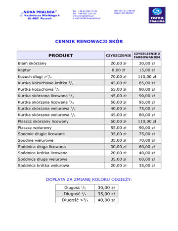 „NOVA PRALNIA” Tel. +48 61 853 41 51 Tel. +48 602 134 131 www.novapralnia.pl e-mail [email protected] ul. Kazimierza Wielkiego 4 61-863 Poznań NIP 781-111-88-68 Regon 631252032 CENNIK RENOWACJI SKÓR CZYSZCZENIE CZYSZCZENIE Z FARBOWANIEM 20,00 zł 30,00 zł 8,00 zł 15,00 zł Kożuch długi >3/4 70,00 zł 110,00 zł Kurtka kożuchowa krótka 1/2 45,00 zł 85,00 zł Kurtka kożuchowa 3/4 55,00 zł 90,00 zł Kurtka skórzana licowana 1/2 45,00 zł 90,00 zł Kurtka skórzana licowana 3/4 50,00 zł 95,00 zł Kurtka skórzana welurowa 1/2 40,00 zł 75,00 zł Kurtka skórzana welurowa 3/4 45,00 zł 80,00 zł Płaszcz skórzany licowany 60,00 zł 110,00 zł Płaszcz welurowy 55,00 zł 90,00 zł Spodnie długie licowane 35,00 zł 75,00 zł Spodnie welurowe 35,00 zł 70,00 zł Spódnica długa licowana 30,00 zł 60,00 zł Spódnica krótka licowana 20,00 zł 40,00 zł Spódnica długa welurowa 35,00 zł 60,00 zł Spódnica krótka welurowa 20,00 zł 35,00 zł PRODUKT Błam skórzany Kaptur DOPŁATA ZA ZMIANĘ KOLORU ODZIEŻY: Długość 1/2 30,00 zł Długość 3/4 35,00 zł Długość >3/4 40,00 zł