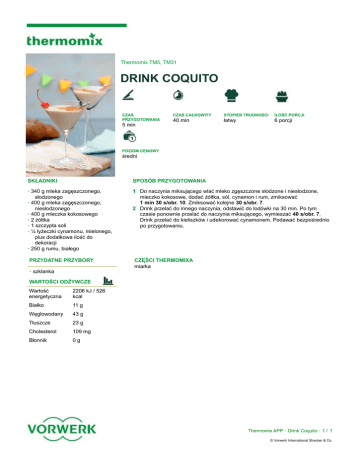 Thermomix TM5, TM31 DRINK COQUITO CZAS PRZYGOTOWANIA 5 min CZAS CAŁKOWITY STOPIEŃ TRUDNOŚCI ILOŚĆ PORCJI 40 min łatwy 6 porcji POZIOM CENOWY średni SKŁADNIKI SPOSÓB PRZYGOTOWANIA · 340 g mleka zagęszczonego, słodzonego · 400 g mleka zagęszczonego, niesłodzonego · 400 g mleczka kokosowego · 2 żółtka · 1 szczypta soli · ¼ łyżeczki cynamonu, mielonego, plus dodatkowa ilość do dekoracji · 250 g rumu, białego 1 Do naczynia miksującego wlać mleko zgęszczone słodzone i niesłodzone, mleczko kokosowe, dodać żółtka, sól, cynamon i rum, zmiksować 1 min 30 s/obr. 10. Zmiksować kolejne 30 s/obr. 7. 2 Drink przelać do innego naczynia, odstawić do lodówki na 30 min. Po tym czasie ponownie przelać do naczynia miksującego, wymieszać 40 s/obr. 7. Drink przelać do kieliszków i udekorować cynamonem. Podawać bezpośrednio po przygotowaniu. PRZYDATNE PRZYBORY · szklanka CZĘŚCI THERMOMIXA miarka WARTOŚCI ODŻYWCZE Wartość energetyczna 2206 kJ / 526 kcal Białko 11 g Węglowodany 43 g Tłuszcze 23 g Cholesterol 109 mg Błonnik 0g Thermomix APP · Drink Coquito · 1 / 1 © Vorwerk International Strecker & Co.