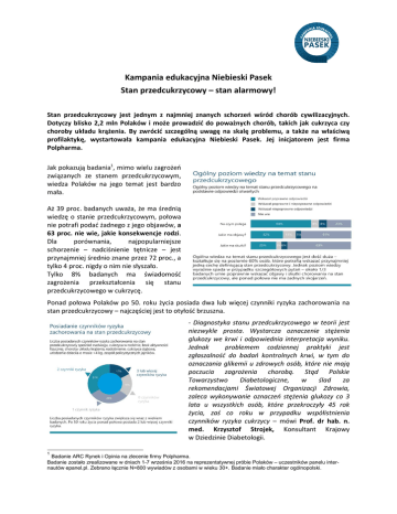 Kampania edukacyjna Niebieski Pasek Stan przedcukrzycowy – stan alarmowy! Stan przedcukrzycowy jest jednym z najmniej znanych schorzeń wśród chorób cywilizacyjnych. Dotyczy blisko 2,2 mln Polaków i może prowadzić do poważnych chorób, takich jak cukrzyca czy choroby układu krążenia. By zwrócić szczególną uwagę na skalę problemu, a także na właściwą profilaktykę, wystartowała kampania edukacyjna Niebieski Pasek. Jej inicjatorem jest firma Polpharma. Jak pokazują badania1, mimo wielu zagrożeń związanych ze stanem przedcukrzycowym, wiedza Polaków na jego temat jest bardzo mała. Aż 39 proc. badanych uważa, że ma średnią wiedzę o stanie przedcukrzycowym, połowa nie potrafi podać żadnego z jego objawów, a 63 proc. nie wie, jakie konsekwencje rodzi. Dla porównania, najpopularniejsze schorzenie – nadciśnienie tętnicze – jest przynajmniej średnio znane przez 72 proc., a tylko 4 proc. nigdy o nim nie słyszało. Tylko 8% badanych ma świadomość zagrożenia przekształcenia się stanu przedcukrzycowego w cukrzycę. Ponad połowa Polaków po 50. roku życia posiada dwa lub więcej czynniki ryzyka zachorowania na stan przedcukrzycowy – najczęściej jest to otyłość brzuszna. - Diagnostyka stanu przedcukrzycowego w teorii jest niezwykle prosta. Wystarcza oznaczenie stężenia glukozy we krwi i odpowiednia interpretacja wyniku. Jednak problemem codziennej praktyki jest zgłaszalność do badań kontrolnych krwi, w tym do oznaczania glikemii u zdrowych osób, które nie mają poczucia zagrożenia chorobą. Stąd Polskie Towarzystwo Diabetologiczne, w ślad za rekomendacjami Światowej Organizacji Zdrowia, zaleca wykonywanie oznaczeń stężenia glukozy co 3 lata u wszystkich osób, które przekroczyły 45 rok życia, zaś co roku w przypadku współistnienia czynników ryzyka cukrzycy – mówi Prof. dr hab. n. med. Krzysztof Strojek, Konsultant Krajowy w Dziedzinie Diabetologii. 1 Badanie ARC Rynek i Opinia na zlecenie firmy Polpharma. Badanie zostało zrealizowane w dniach 1-7 września 2016 na reprezentatywnej próbie Polaków – uczestników panelu internautów epanel.pl. Zebrano łącznie N=800 wywiadów z osobami w wieku 30+. Badanie miało charakter ogólnopolski. Stan przedcukrzycowy to sygnał zagrożenia wystąpieniem cukrzycy typu 2, czy chorób układu krążenia. Corocznie u 10 proc. osób ze stanem przedcukrzycowym rozwija się cukrzyca. Kampania edukacyjna Niebieski Pasek Kampania edukacyjna Niebieski Pasek ma na celu zwrócenie uwagi na problem braku wiedzy i świadomości na temat stanu przedcukrzycowego. - Jednym z czynników ryzyka, zarówno u kobiet, jaki i mężczyzn jest otyłość brzuszna. Poprzez akcję chcemy zaznaczyć, że stan przedcukrzycowy to ostatni moment, w którym możemy przeciwdziałać wystąpieniu cukrzycy typu 2 oraz związanych z nią groźnych powikłań. Dlatego symbolem naszej kampanii jest niebieski pasek – mówi Marta Gawrylik, koordynator kampanii edukacyjnej. - Kampania ma nie tylko zbudować świadomość odnośnie stanu przedcukrzycowego, ale także zwrócić szczególną uwagę na diagnostykę oraz nawyki żywieniowe i styl życia Polaków - dodaje. Ważnym elementem kampanii jest także pierwszy w Polsce raport społeczny „Polska w stanie przedcukrzycowym”. Raport powstał we współpracy z ekspertami: Prof. dr hab. n. med. Krzysztof Strojek – Konsultant Krajowy w Dziedzinie Diabetologii, specjalista w zakresie chorób wewnętrznych, diabetologii i hipertensjologii. Beata Stepanow – specjalista w dziedzinie pielęgniarstwa diabetologicznego, prezes Stowarzyszenia Edukacji Diabetologicznej. Agnieszka Ślusarska-Staniszewska – dietetyk, specjalista ds. żywienia. Sprawdź, czy jesteś w grupie ryzyka! W ramach kampanii uruchomiona została strona www.niebieskipasek.pl, która stanowi kompendium wiedzy na temat stanu przedcukrzycowego. To także zbiór porad odnośnie właściwego odżywiania się i zdrowego trybu życia. Ponadto na stronie www kampanii można samodzielnie wykonać test stanu przedcukrzycowego, który został opracowany na podstawie zaleceń Polskiego Towarzystwa Diabetologicznego. Organizatorem kampanii edukacyjnej Niebieski Pasek jest firma Polpharma. Partnerem merytorycznym kampanii jest Koalicja na Rzecz Walki z Cukrzycą oraz Stowarzyszenie Edukacji Diabetologicznej. Patronat honorowy nad kampanią sprawuje Polskie Towarzystwo Diabetologiczne.