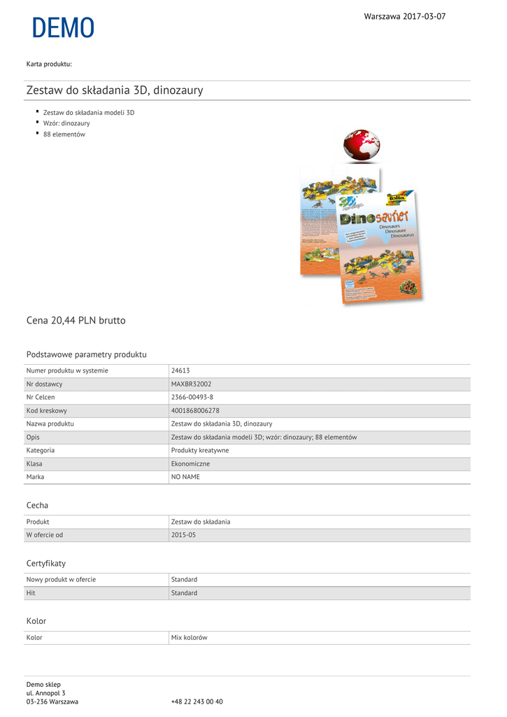 Warszawa 2017-03-07 Karta produktu: Zestaw do składania 3D, dinozaury Zestaw do składania modeli 3D Wzór: dinozaury 88 elementów Cena 20,44 PLN brutto Podstawowe parametry produktu Numer produktu w systemie 24613 Nr dostawcy MAXBR32002 Nr Celcen 2366-00493-8 Kod kreskowy 4001868006278 Nazwa produktu Zestaw do składania 3D, dinozaury Opis Zestaw do składania modeli 3D; wzór: dinozaury; 88 elementów Kategoria Produkty kreatywne Klasa Ekonomiczne Marka NO NAME Cecha Produkt Zestaw do składania W ofercie od 2015-05 Certyfikaty Nowy produkt w ofercie Standard Hit Standard Kolor Kolor Mix kolorów Demo sklep ul. Annopol 3 03-236 Warszawa +48 22 243 00 40 Warszawa 2017-03-07 Serdecznie zapraszamy do współpracy Demo sklep zespół. Demo sklep ul. Annopol 3 03-236 Warszawa +48 22 243 00 40