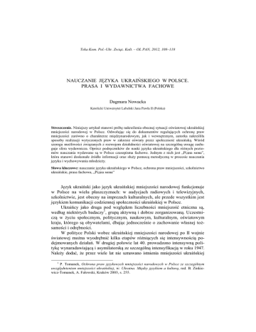 Teka Kom. Pol.-8NU=ZLą].XOW± OL PAN, 2012, 108±118 NAUCZANIE -ĉ=<.$ 8.5$,ē6.,(*2 W POLSCE. PRASA I WYDAWNICTWA FACHOWE Dagmara Nowacka .DWROLFNL8QLZHUV\WHW/XEHOVNL-DQD3DZáD,, (Polska) Streszczenie. 1LQLHMV]\DUW\NXáVWDQRZLSUyEĊQDNUHĞOHQLDREHFQHMV\WXDFMLRĞZLDWRZHMXNUDLĔVNLHM mniejszRĞFL QDURGRZHM Z 3ROVFH 2GZRáXMąF VLĊ GR GoNXPHQWyZ UHJXOXMąF\FK RFKURQĊ SUDZ PQLHMV]RĞFL ]DUyZQR R FKDUDNWHU]H PLĊG]\QDURGRZ\P MDN L ZHZQĊWU]Q\P DXWRUND QDNUHĞOLáD sposoby realizacji wytyF]RQ\FK SUDZ Z ]DNUHVLH RĞZLDW\ SU]H] VSRáHF]QRĞü XNUDLĔVNą :ĞUyd V]HUHJXPRĪOLZRĞFL]ZLą]DQ\FK]UR]ZRMHPG]LDáDOQRĞFLRĞZLDWRZHMQDV]F]HJyOQąXZDJĊ]DVáuJXMH VIHUD Z\GDZQLF]D 2SUyF] SRGUĊF]QLNyZ GR QDXNL MĊ]\ND XNUDLĔVNLHJR GOD UyĪQ\FK SR]LoPyZ QDXF]DQLD Z\GDZDQH Vą Z 3ROVFH F]DVRSLVPD IDFKRZH -HGQ\P ] QLFK MHVW ÄɊɿɞɧɚ ɦɨɜɚ´ NWyUD VWDQRZL GRVNRQDáH ĨUyGáR LnIRUPDFML RUD] VáXĪ\ SRPRFą PHWRG\F]Qą ZSURFHVLHQDXF]DQLD MĊ]\NDLZ\FKoZ\ZDQLDPáRG]LHĪ\ 6áRZDNOXF]RZHQDXF]DQLHMĊ]\NDXNUDLĔVNLHJRZ3ROVFHRFKURQDSUDZPQLHjV]RĞFLV]NROQLFWZR XNUDLĔVNLHSUDVDIDFKRZDÄɊɿɞɧɚɦɨɜɚ´ -Ċ]\NXNUDLĔVNLMDNRMĊ]\NXNUDLĔVNLHMPQLHMV]RĞFLQDURGRZHMIXQNFMRQXMH Z 3ROVFH QD ZLHOX SáDV]F]\]QDFK Z DXG\FMDFK UDGLRZ\FK L WHOHZL]\MQ\FK szkolnictwie, jest obecny na imprezach kulturalnych, ale przede wszystkim jest MĊ]ykiem komuQLNDFMLFRG]LHQQHMVSRáHF]QRĞFLXNUDLĔVNLHMZ3ROVFH 8NUDLĔF\ MDNR GUXJD SRG Z]JOĊGHP OLF]HEQRĞFL PQLHMV]RĞü HWQLF]QD Vą ZHGáXJQLHNWyU\FKEDGDF]\1JUXSąDNW\ZQąLGREU]H]RUJDQL]RZDQą8F]HVWQiF]ą Z Ī\FLX VSRáHF]Q\P SROLW\F]Q\P QDXNRZ\P NXOWXUDOQ\P RĞZLDWRZ\P NUDMXNWyUHJRVąRE\ZDWHODPLGEDMąFMHGQRF]HĞQLHR]DFKRZDQLHZáDVQHMWRĪ VDPRĞFLLRGUĊEQRĞFL : SROLW\FH 3ROVNL ZREHF XNUDLĔVNLHM PQLHMV]RĞFL QDURGRZHM SR ,, ZRMQLH ĞZLDWRZHM PRĪQD Z\RGUĊEQLü NLOND HWDSyZ UyĪQLąF\FK VLĊ LQWHQV\ZQRĞFLą SodejmRZDQ\FKG]LDáDĔ:GUXJLHMSRáRZLHODWSURZDG]RQRLQWHQV\ZQąSROiW\NĊZ\QDUDGDZLDMąFąLDV\PLODWRUVNą]HV]F]HJyOQąLQWHQV\ILNDFMąZURNX1947. 1DOHĪ\ GRGDü ĪH SU]H] ZLHOH ODW QLH X]QDZDQR LVWQLHQLD PQLHMV]RĞFL XNUaLĔVNLHM 1 P. Tomanek, 2FKURQD SUDZ MĊ]\NRZ\FK PQLHMV]RĞFL QDURGRZ\FK Z 3ROVFH ]H V]F]HJyOQ\P XZ]JOĊGQLHQLHP PQLHMV]RĞFL XNUDLĔVNLHM, w: 8NUDLQD 0LĊG]\ MĊ]\NLHP D NXOWXUą, red. B. Zinkiewicz-7RPDQHN$)DáRZVNL.UDNyw 2003, s. 255. 1$8&=$1,(-ĉ=<.$8.5$,ē6.,(*2:32/6CE... 109 RUD] MHM RGUĊEQRĞFL L Z\QLNDMąF\FK ] WHJR IDNWX SRWU]HE L RF]HNLZDĔ 'RSLHUR w ODWDFKSRĞPLHUFL6WDOLQDGRVWU]HĪRQRPQLHjV]RĞüXNUDLĔVNąL zezwolono QD XWZRU]HQLH 8NUDLĔVNLHJR 7RZDU]\VWZD 6SRáHF]QR-Kulturalnego (1956 r.)2, MHGQDNĪH QDOHĪ\ SU]\]QDü ĪH MHJR G]LDáDOQRĞü E\áD FDákowicie kontrolowana SU]H] ZáDG]H SDĔVWZRZH 3HáQRSUDZQą RFKURQĊ XNUDLĔVND PQLHMV]RĞü QDURGRZD X]\VNDáDGRSLHURSRXSDGNXUHĪLPXNRPXQLVW\F]QHJRZODWDFKNLHG\SDĔstwo SROVNLH]GDáRVRELHVSUDZĊ]NRQLHF]QRĞFLWUDNWDWRZ\FKXUHJuORZDĔWHMNZHVWLL ObecQHSRáRĪHQLHPQLHMV]RĞFLXNUDLĔVNLHMXZDUXQNRZDQHMHVWDNWDPLSUaZD]DUyZQRPLĊG]\QDURGRZHJRMDNLZHZQĊWU]QHJR0LĊG]\QDURGRZDRFKURQD PQLHMV]RĞFL RSLHUD VLĊ QD NLONX V\VWHPDFK 3RGVWDZĊ 6\VWHPX RFKURQ\ SUDZ F]áRZLHNDZUDPDFK21=VWDQRZLąPLĊG]\LQQ\PLÄ'HNODUDFMDSUDZRVyEQDOeĪąF\FK GR PQLHMV]RĞFL QDURGRZ\FK OXE HWQLF]Q\FK UHOLJLMQ\FK L MĊ]\NRZ\FK´ 6\VWHPRFKURQ\ZUDPDFK5DG\(XURS\RSLHUDMąF\VLĊPLQQDÄ(XUoSHMVNLHMNDUFLHMĊ]\NyZUHJLRQDOQ\FKLPQLHMV]RĞFLRZ\FK´LÄ.RQZHQFML ramoZHM R RFKURQLH SUDZ PQLHMV]RĞFL QDURGRZ\FK´ ]RERZLą]XMH w niniejszych dokumentach kraje-V\JQDWDULXV]\GRRFKURQ\MĊ]\NyZPQLHMV]oĞFL HWQLF]Q\FK Z GDQ\P NUDMX RUD] GR LFK SURPRFML Z Ī\FLX SU\ZDWQ\P L Sublicznym3. Podstawowe znaczenie w Systemie ochrony w ramach Organizacji %H]SLHF]HĔVWZDL:VSyáSUDF\Z(XURSLHSRVLDGDMąPLQÄ'RNXPHQWNRSHQKaVNL´LÄ'RNXPHQWKHOVLĔVNL´2SUyF]V]HUHJXSUDZDNW\WHRNUeĞODMąRGSRZLHGQLHVWDQGDUG\RFKURQ\SUDZPQLHMV]RĞci, m.in. prawo do zachowania i ro]ZRMXWRĪVDPRĞFLHWQLF]QHMLMĊ]\NRZHMVZRERGQHJRXĪ\ZDQLDMĊ]yka naroGRZHJRWZRU]HQLDZáDVQ\FKLQVW\WXFMLSDĔVWZRZ\FK4. 5HJXODFMDRFKURQ\SUDZPQLHMV]RĞFLXNUDLĔVNLHMZ3ROVFH]RVWDáDSRGMĊWD UyZQLHĪ Z ELODWHUDOQ\P Ä7UDNWDFLH R GREU\P VąVLHG]WZLH SU]\Maznych stosunNDFK L ZVSyáSUDF\´ ]DZDUW\P PLĊG]\ 3ROVNą D 8NUDLQą Z U5 W owym WUDNWDFLHSU]HGPLRWRZ\]DNUHVRFKURQ\REHMPXMHSUDZRGRVZRERGQHJRSRVáuJLZDQLD VLĊ MĊ]\NLHP RMF]\VW\P SUDZR GR ]DNáDGDQLD ZáDVQ\FK LQVW\WXFML RĞZLDWRZ\FKNXOWXUDOQ\FKLUHOLJLMQ\FKSUDZRGRNRQWDNWyZ]F]áRQNDPLZáasnej grupy etnicznej poprzez granice, prawR GR XĪ\ZDQLD LPLRQ L QD]ZLVN w EU]PLHQLXMĊ]\NDRMF]\VWHJR6. 2FKURQD Z UDPDFK SUDZD ZHZQĊWU]QHJR RSLHUD VLĊ SU]HGH ZV]\VWNLP QD SUDZDFKZ\QLNDMąF\FK].RQVW\WXFML2ERZLą]XMąFD.RQVW\WXFMD5]HF]\SRVSolitej Polskiej z dnia 2 kwietnia 1997 r. gwarantuje wszystkim obywatelom, w W\PLF]áRQNRPPQLHMV]RĞFLQDURGRZ\FKUyZQRĞüZREHFSUDZDL]DND]G\sNU\PLQDFMLDUWZROQRĞü]U]HV]DQLDVLĊDUWUyZQRXSUDZQLHQLH.RĞcioW. Serczyk, Historia Ukrainy:URFáDZ± Warszawa ± .UDNyZV http://www.msw.gov.pl/portal/pl/584/7523/Europejska_karta_jezykow_regionalnych_lub_mniejszosciowych.html; http://www.lex.pl/-du-akt/-/akt/dz-u-02-22-209GRVWĊS 4 +&KDáXSF]DN7%URZDUHN0QLHMV]RĞFLQDURGRZHZ3ROVFH918±1995, Lublin 2000, s. 40±41. 5 B. Surmacz, :VSyáF]HVQHVWRVXQNLSROVNR-XNUDLĔVNLH. Politologiczna analiza traktatu o doEU\PVąVLHG]WZLH, Lublin 2002, s. 7. 6 Ibidem, s. 165. 2 3 110 Dagmara Nowacka áyZ L ]ZLą]NyZ Z\]QDQLRZ\FK 3RQDGWR SDĔVWZR ]DSHZQLD RE\ZDWHORP SRlVNLP QDOHĪąF\P GR PQLHMV]RĞFL QDURGRZ\FK L HWQLFznycK ZROQRĞü]DFKRZDQLD i UR]ZRMXZáDVQHJRMĊ]\ND]DFKRZDQLDRE\F]DMyZLWUDG\FMLRUD]UR]ZRMXZáaVQHMNXOWXU\DUWXVWĊSDWDNĪHGDMHSUDZRGRWZRU]HQLDZáDVQ\FKLQVWyWXFML HGXNDF\MQ\FK NXOWXUDOQ\FK L LQVW\WXFML VáXĪąF\FK RFKURQLH WRĪVDPRĞFL UHOLJLMQHMRUD]GRXF]HVWQLFWZDZUR]VWU]\JDQLXVSUDZGRW\F]ąF\FKLFKWRĪVDPoĞFLQDUoGRZHMDUWXVWĊS7. :V]\VWNR FR ]RVWDáR ]DZDUWH Z QRUPDFK SUDZQ\FK ]DUyZQR PLĊG]\QDURGoZ\FK MDN L R FKDUDNWHU]H ZHZQĊWU]Q\P SRZLQQR PLHü RG]ZLHUFLHGOHQLH Z SUDkW\F]QHMUHDOL]DFMLSUDZF]áRQNyZPQLHMV]RĞFLQDURGRZ\FK0DWRMHGQDN F]ĊĞFLHM ZHGáXJEDGDF]\]QDF]HQLHEDUG]LHMSROLW\F]QHLPRUDO