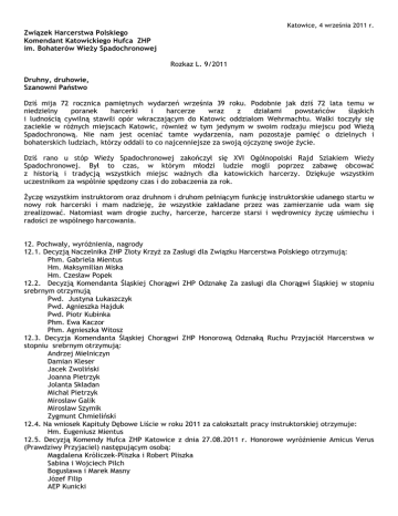 Katowice, 4 września 2011 r. Związek Harcerstwa Polskiego Komendant Katowickiego Hufca ZHP im. Bohaterów Wieży Spadochronowej Rozkaz L. 9/2011 Druhny, druhowie, Szanowni Państwo Dziś mija 72 rocznica pamiętnych wydarzeń września 39 roku. Podobnie jak dziś 72 lata temu w niedzielny poranek harcerki i harcerze wraz z działami powstańców śląskich i ludnością cywilną stawili opór wkraczającym do Katowic oddziałom Wehrmachtu. Walki toczyły się zaciekle w różnych miejscach Katowic, również w tym jedynym w swoim rodzaju miejscu pod Wieżą Spadochronową. Nie nam jest oceniać tamte wydarzenia, nam pozostaje pamięć o dzielnych i bohaterskich ludziach, którzy oddali to co najcenniejsze za swoją ojczyznę swoje życie. Dziś rano u stóp Wieży Spadochronowej zakończył się XVI Ogólnopolski Rajd Szlakiem Wieży Spadochronowej. Był to czas, w którym młodzi ludzie mogli poprzez zabawę obcować z historią i tradycją wszystkich miejsc ważnych dla katowickich harcerzy. Dziękuje wszystkim uczestnikom za wspólnie spędzony czas i do zobaczenia za rok. Życzę wszystkim instruktorom oraz druhnom i druhom pełniącym funkcję instruktorskie udanego startu w nowy rok harcerski i mam nadzieję, że wszystkie zakładane przez was zamierzanie uda wam się zrealizować. Natomiast wam drogie zuchy, harcerze, harcerze starsi i wędrownicy życzę uśmiechu i radości ze wspólnego harcowania. 12. Pochwały, wyróżnienia, nagrody 12.1. Decyzją Naczelnika ZHP Złoty Krzyż za Zasługi dla Związku Harcerstwa Polskiego otrzymują: Phm. Gabriela Mientus Hm. Maksymilian Miska Hm. Czesław Popek 12.2. Decyzją Komendanta Śląskiej Chorągwi ZHP Odznakę Za zasługi dla Chorągwi Śląskiej w stopniu srebrnym otrzymują Pwd. Justyna Łukaszczyk Pwd. Agnieszka Hajduk Pwd. Piotr Kubinka Phm. Ewa Kaczor Phm. Agnieszka Witosz 12.3. Decyzja Komendanta Śląskiej Chorągwi ZHP Honorową Odznaką Ruchu Przyjaciół Harcerstwa w stopniu srebrnym otrzymują: Andrzej Mielniczyn Damian Kleser Jacek Zwoliński Joanna Pietrzyk Jolanta Składan Michał Pietrzyk Mirosław Galik Mirosław Szymik Zygmunt Chmieliński 12.4. Na wniosek Kapituły Dębowe Liście w roku 2011 za całokształt pracy instruktorskiej otrzymuje: Hm. Eugeniusz Mientus 12.5. Decyzją Komendy Hufca ZHP Katowice z dnia 27.08.2011 r. Honorowe wyróżnienie Amicus Verus (Prawdziwy Przyjaciel) następującym osobą: Magdalena Króliczek-Pliszka i Robert Pliszka Sabina i Wojciech Pilch Bogusława i Marek Masny Józef Filip AEP Kunicki Marek Wazowski 12.6. Decyzją Komendy Hufca ZHP Katowice z dnia 27.08.2011 r. przyznaję Wyróżnienie Instruktorskie Bene Meritus (Dobrze zasłużony) następującym druhnom i druhom: Pwd. Ewa Krakowiak Pwd. Franciszka Retig Phm. Joachim Przebierała Anna i Zbigniew Holewik Jerzy i Maria Plewnia Phm. Andrzej Dutkiewicz 12.7. Decyzją Komendy Hufca ZHP Katowice z dnia 27.08.2011 r. przyznaję Złoty Medal za Zasługi dla Hufca ZHP Katowice druhowi: Hm. Adamowi Bałazemu 12.8. Decyzją Komendy Hufca ZHP Katowice z dnia 27.08.2011 r. przyznaję Srebrny Medal za Zasługi dla Hufca ZHP Katowice następującym druhnom i druhom: Phm. Patryk Stawowy Hm. Elżbieta Kustra Pwd. Patrycja Retig Pwd. Anita Dzik Krystyna Zając Jan Wolny Phm. Ewa Wawrzyniak Pwd. Magdalena Zielosko Pwd. Karolina Chrobok 12.9. Decyzją Komendy Hufca ZHP Katowice z dnia 27.08.2011 r. przyznaję Brązowy Medal za Zasługi dla Hufca ZHP Katowice następującym druhnom i druhom: H.O. Marcin Zieliński Phm. Dariusz Łyczko Phm. Arek Bitman Hm. Urszula Sodzawiczny-Kupczyk Pwd. Monika Ryszczyk Pwd. Karolina Walicka Piotr Dyszkowski Waldemar Bojarun Pwd. Alicja Pochmara Pwd. Zuzanna Rucka Pwd. Annamaria Burdak Marian Zając – wręczona Urszula Rospondek 12.10. Decyzją Komendy Hufca ZHP Katowice z dnia 27.08.2011 r. przyznaję Honorową Odznakę Hufca ZHP Katowice następującym druhnom i druhom: Michał Cielniak Dawid Matejko Adrian Korszeń Jan Kowalcze Oliwia Masny Jan Sochan Barbara Lubina Dariusz Jureczko Agnieszka Macura Maciej Chrobok Maja Salik Bogdan Ślęczka Pwd. Marta Stąsiek Małgorzata Dudek Pwd. Michał Szymann Monika Kołton pwd. Karolina Nowak hm. Lesław Gajd Wiktoria Granek Pwd. Anita Dzik (wręczona zostaje dziś zaległa z 2010) 12.11 Decyzją Komendy Hufca ZHP Katowice z dnia 27.08.2011 r. wyróżniam Listem Gratulacyjnym Komendanta Hufca ZHP Katowice następujące druhny i druchów: Roksana Pisula Ewa Rozkosz Dorota Czypionka Anna Fularska Patrycja Pinkawa Zuzanna Latocha Maria Goli Aleksandra Pilch Małgorzata Zygmunt Pwd. Jan Wegehaupt Magdalena Dziedzic Katarzyna Kościńska Patrycja Spranzel Damian Kupiec hm. Patryk Chrobak pwd. Małgorzat Ukleja Marta Kuter Pwd. Michał Cieśla Phm. Leon Suski 12.12 Dziękuj następującym druhom i druhnom za ich zaangażowanie i pomoc jaką udzielają wciągu śródrocznej pracy hufca. Dziękuje wam za to, że zawsze można was poprosić o pomoc i ją otrzymać. Serdecznie dziękuje: Janusz Gawlik Jakub Szewczyk Grzegorz Wąs Kamil Śladkowski Krzysztof Szymański Jagoda Zionkowska Joanna Wojtyło Agata Murat Michał Murat Martyna Filip Artur Parzonka Michał Smak Maria Łabno 12.13 Serdecznie dziękuje wszystkim, których zaangażowanie pomogło w zorganizowaniu tegorocznego Święta Katowickiego Hufca ZHP Katowice. Czuwaj! phm. Paweł Cebula Komendant Hufca