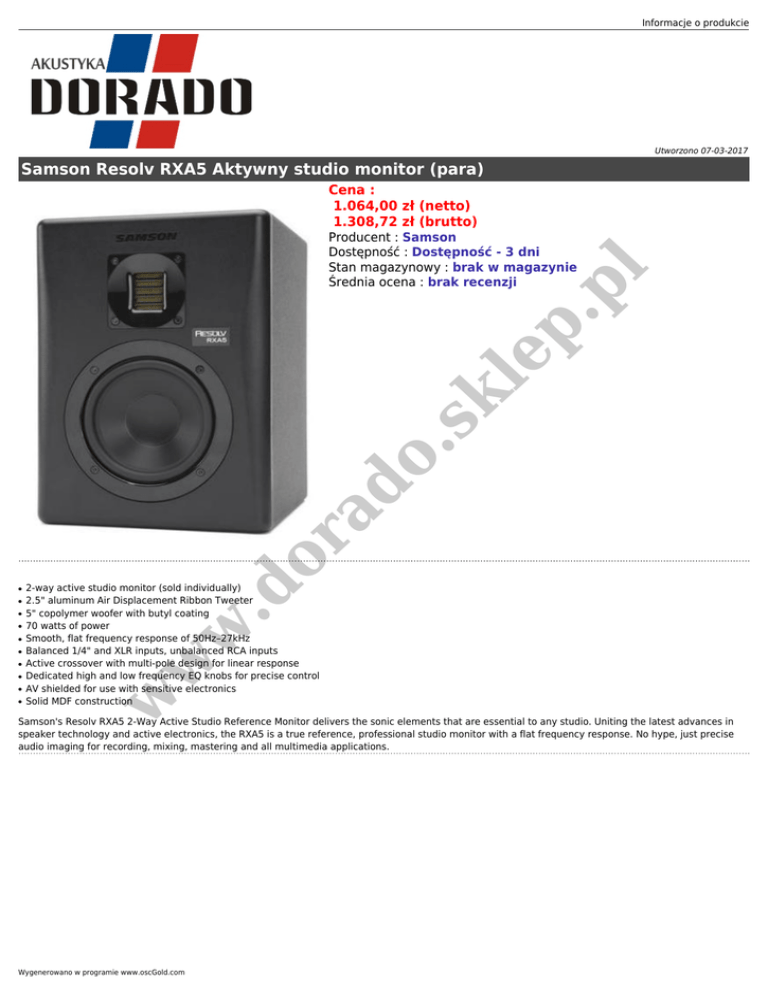 Informacje o produkcie Utworzono 07-03-2017 Samson Resolv RXA5 Aktywny studio monitor (para) Cena : 1.064,00 zł (netto) 1.308,72 zł (brutto) ● ● ● ● ● ● ● w ● 2-way active studio monitor (sold individually) 2.5" aluminum Air Displacement Ribbon Tweeter 5" copolymer woofer with butyl coating 70 watts of power Smooth, flat frequency response of 50Hz–27kHz Balanced 1/4" and XLR inputs, unbalanced RCA inputs Active crossover with multi-pole design for linear response Dedicated high and low frequency EQ knobs for precise control AV shielded for use with sensitive electronics Solid MDF construction w ● w ● .d or ad o. sk le p. p l Producent : Samson Dostępność : Dostępność - 3 dni Stan magazynowy : brak w magazynie Średnia ocena : brak recenzji Samson's Resolv RXA5 2-Way Active Studio Reference Monitor delivers the sonic elements that are essential to any studio. Uniting the latest advances in speaker technology and active electronics, the RXA5 is a true reference, professional studio monitor with a flat frequency response. No hype, just precise audio imaging for recording, mixing, mastering and all multimedia applications. Wygenerowano w programie www.oscGold.com