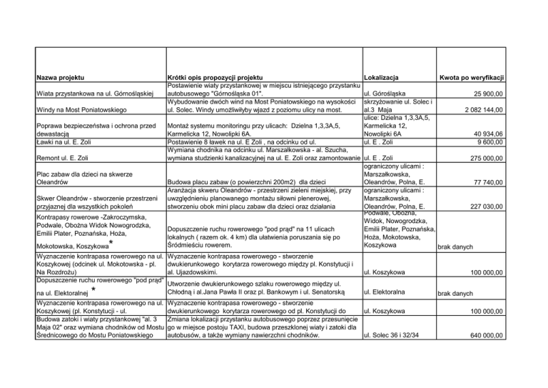 Nazwa projektu Wiata przystankowa na ul. Górnośląskiej Windy na Most Poniatowskiego Poprawa bezpieczeństwa i ochrona przed dewastacją Ławki na ul. E. Zoli Krótki opis propozycji projektu Postawienie wiaty przystankowej w miejscu istniejącego przystanku autobusowego "Górnośląska 01". Wybudowanie dwóch wind na Most Poniatowskiego na wysokości ul. Solec. Windy umożliwiłyby wjazd z poziomu ulicy na most. Lokalizacja ul. Górośląska skrzyżowanie ul. Solec i al.3 Maja ulice: Dzielna 1,3,3A,5, Karmelicka 12, Nowolipki 6A ul. E . Zoli Kwota po weryfikacji 25 900,00 2 082 144,00 Montaż systemu monitoringu przy ulicach: Dzielna 1,3,3A,5, Karmelicka 12, Nowolipki 6A. 40 934,06 Postawienie 8 ławek na ul. E Zoli , na odcinku od ul. 9 600,00 Wymiana chodnika na odcinku ul. Marszałkowska - al. Szucha, Remont ul. E. Zoli wymiana studzienki kanalizacyjnej na ul. E. Zoli oraz zamontowanie ul. E . Zoli 275 000,00 ograniczony ulicami : Plac zabaw dla dzieci na skwerze Marszałkowska, Oleandrów Budowa placu zabaw (o powierzchni 200m2) dla dzieci Oleandrów, Polna, E. 77 740,00 Aranżacja skweru Oleandrów - przestrzeni zieleni miejskiej, przy ograniczony ulicami : Skwer Oleandrów - stworzenie przestrzeni uwzględnieniu planowanego montażu siłowni plenerowej, Marszałkowska, ulice: Zakroczymska, przyjaznej dla wszystkich pokoleń stworzeniu obok mini placu zabaw dla dzieci oraz działania Oleandrów, Polna, E. 227 030,00 Podwale, Oboźna, Kontrapasy rowerowe -Zakroczymska, Widok, Nowogrodzka, Podwale, Obożna Widok Nowogrodzka, Dopuszczenie ruchu rowerowego "pod prąd" na 11 ulicach Emilii Plater, Poznańska, Emilii Plater, Poznańska, Hoża, lokalnych ( razem ok. 4 km) dla ułatwienia poruszania się po Hoża, Mokotowska, Śródmieściu rowerem. Koszykowa Mokotowska, Koszykowa brak danych Wyznaczenie kontrapasa rowerowego na ul. Wyznaczenie kontrapasa rowerowego - stworzenie Koszykowej (odcinek ul. Mokotowska - pl. dwukierunkowego korytarza rowerowego między pl. Konstytucji i Na Rozdrożu) al. Ujazdowskimi. ul. Koszykowa 100 000,00 Dopuszczenie ruchu rowerowego "pod prąd" Utworzenie dwukierunkowego szlaku rowerowego między ul. Chłodną i al.Jana Pawła II oraz pl. Bankowym i ul. Senatorską ul. Elektoralna na ul. Elektoralnej brak danych Wyznaczenie kontrapasa rowerowego na ul. Wyznaczenie kontrapasa rowerowego - stworzenie Koszykowej (pl. Konstytucji - ul. dwukierunkowego korytarza rowerowego od pl. Konstytucji do ul. Koszykowa 100 000,00 Budowa zatoki i wiaty przystankowej "al. 3 Zmiana lokalizacji przystanku autobusowego poprzez przesunięcie Maja 02" oraz wymiana chodników od Mostu go w miejsce postoju TAXI, budowa przeszklonej wiaty i zatoki dla Średnicowego do Mostu Poniatowskiego autobusów, a także wymiany nawierzchni chodników. ul. Solec 36 i 32/34 640 000,00 * * Internet bezprzewodowy w bibliotekach Wrzuty całodobowe w bibliotekach Książki dla bibliotek w Śródmieściu Filmy, audiobooki, płyty muzyczne dla bibliotek w Śródmieściu Zapach kawy w bibliotece winda w bibliotece przy ul. Anielewicza 2 Stoliki miejskie Gra historyczna o żołnierzach wyklętych w Parku Kazimierzowskim Latarnie z czujnikami ruchu na Polach Mokotowskich ulice: Anielewicza 2, Marszałkowska 9/15, Zainstalowanie internetu bezprzewodowego w wybranych Przechodnia 2, bibliotekach publicznych (Anielewicza 2, Marszałkowska 9/15, Czerniakowska 178a, Przechodnia 2, Czerniakowska 178a, Górnośląska 1, Świętojańska Górnośląska 1, 5, Dzika 4.) Świętojańska 5, Dzika 4 Wrzuty całodobowe (trezory) umozliwią czytelnikom oddawanie ulice: Czerniakowska zbiorów (ksiązki, czasopisma, filmy, płyty, książki audio i inne) w 178a, Marszałkowska dogodnych porach oraz w dni wolne.Wrzuty będą zlokalizowane w 9/15, Anielewicza 2, dużych bibliotekach publicznych (Czerniakowska 178a, Mokotowska 26 W bibliotekach brak nowości książkowych. Projekt ma zwiększyć ofertę nowości wydawniczych. Dotyczy wszystkich bibliotek Śródmieście ulice: Czerniakowska 178a, Marszałkowka 9/15, Marszałkowska 83, Uzupełnienie zbiorów wybranych bibliotek w Sródmieściu Nowy Świat 47a, Dzika (Czerniakowska 178a, Marszałkowka 9/15, Marszałkowska 83, 4, Górnośląska 1, Nowy Świat 47a, Dzika 4, Górnośląska 1, Anielewicza 2) Anielewicza 2 Zakup automatów do napoi w wybranych bibliotekach Śródmieścia ulice: Anielewicza 2, (Anielewicza 2, Czerniakowska 178a). Czerniakowska 178a Winda w bibliotece przy ul. Anielewicza 2 ułatwiłaby dostęp osobom chorym, starszym, niepełnosprawnym oraz matkom z małymi dziećmi do wypożyczalni, które znajdują się na wysokim I i II ul. Anielewicza 2 Stoliki ustawione na skwerkach i traktach przejściowych - przed PKiN. Mają zachęcać do odpoczynku, kontaktów towarzyskich, nie teren przy PKiN Montaż na płytach chodnikowych gry historycznej o żołnierzach wyklętych. Gra wzorowana na istniejącej w tym parku grze o Park Kaziemierzowski Zamontowanie 30 latarni na terenie parku Pola Mokotowskie Poprawa warunków panujących w sali gimnastycznej XXVII LO, poprzez modernizację systemu wentylacji. Sala wykorzystywana Oddech dla kultury jest również podczas wydarzeń kulturalnych takich jak Festiwal Stworzenie reprezantycyjnego miejsca w centrum stolicy. Miejsca, Rewitalizacja terenów zielonych przy PKiN które będzie europejską wizytówką nowoczesnego miasta (dot. Zagospodarowanie terenu przy ul. Inflanckiej Wybudowanie placu zabaw oraz rekultywacja zieleni (wraz z na plac zabaw i teren wypoczynku wybudowniem scieżek oraz elementów małej architektury) 6 000,00 274 340,00 185 000,00 35 000,00 16 000,00 221 394,00 20 000,00 0,00 Pola Mokotowskie 280 000,00 ul. Polna 5 teren przy PKiN ( wzdłuż al. Jerozolimskich) 139 000,00 ul. Inflancka 638 370,00 630 000,00 Zorganizowanie zajęć z jogi, które odbędą się na Polach Mokotowskich od połowy maja do połowy sierpnia 2015 r. Zajęcia Joga w parku. skierowane przede wszystkim do osób starszych, ale