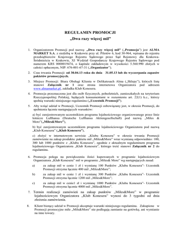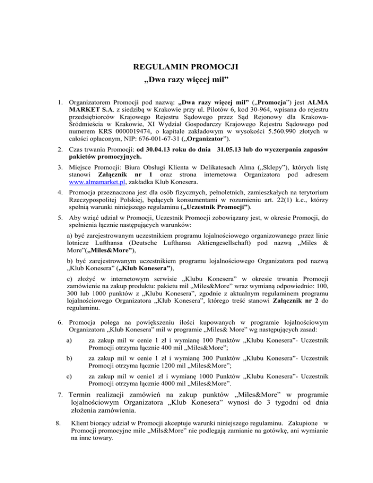 REGULAMIN PROMOCJI „Dwa razy więcej mil” 1. Organizatorem Promocji pod nazwą: „Dwa razy więcej mil” („Promocja”) jest ALMA MARKET S.A. z siedzibą w Krakowie przy ul. Pilotów 6, kod 30-964, wpisana do rejestru przedsiębiorców Krajowego Rejestru Sądowego przez Sąd Rejonowy dla KrakowaŚródmieścia w Krakowie, XI Wydział Gospodarczy Krajowego Rejestru Sądowego pod numerem KRS 0000019474, o kapitale zakładowym w wysokości 5.560.990 złotych w całości opłaconym, NIP: 676-001-67-31 („Organizator”). 2. Czas trwania Promocji: od 30.04.13 roku do dnia 31.05.13 lub do wyczerpania zapasów pakietów promocyjnych. 3. Miejsce Promocji: Biura Obsługi Klienta w Delikatesach Alma („Sklepy”), których listę stanowi Załącznik nr 1 oraz strona internetowa Organizatora pod adresem www.almamarket.pl, zakładka Klub Konesera. 4. Promocja przeznaczona jest dla osób fizycznych, pełnoletnich, zamieszkałych na terytorium Rzeczypospolitej Polskiej, będących konsumentami w rozumieniu art. 22(1) k.c., którzy spełnią warunki niniejszego regulaminu („Uczestnik Promocji”). 5. Aby wziąć udział w Promocji, Uczestnik Promocji zobowiązany jest, w okresie Promocji, do spełnienia łącznie następujących warunków: a) być zarejestrowanym uczestnikiem programu lojalnościowego organizowanego przez linie lotnicze Lufthansa (Deutsche Lufthansa Aktiengesellschaft) pod nazwą „Miles & More”(„Miles&More”), b) być zarejestrowanym uczestnikiem programu lojalnościowego Organizatora pod nazwą „Klub Konesera” („Klub Konesera”), c) złożyć w internetowym serwisie „Klubu Konesera” w okresie trwania Promocji zamówienie na zakup produktu: pakietu mil „Miles&More” wraz wymianą odpowiednio: 100, 300 lub 1000 punktów z „Klubu Konesera”, zgodnie z aktualnym regulaminem programu lojalnościowego Organizatora „Klub Konesera”, którego treść stanowi Załącznik nr 2 do regulaminu. 6. Promocja polega na powiększeniu ilości kupowanych w programie lojalnościowym Organizatora „Klub Konesera” mil w programie „Miles& More” wg następujących zasad: a) za zakup mil w cenie 1 zł i wymianę 100 Punktów „Klubu Konesera”- Uczestnik Promocji otrzyma łącznie 400 mil „Miles&More”; b) za zakup mil w cenie 1 zł i wymianę 300 Punktów „Klubu Konesera”- Uczestnik Promocji otrzyma łącznie 1200 mil „Miles&More”; c) za zakup mil w cenie1 zł i wymianę 1000 Punktów „Klubu Konesera”- Uczestnik Promocji otrzyma łącznie 4000 mil „Miles&More”. 7. Termin realizacji zamówień na zakup punktów „Miles&More” w programie lojalnościowym Organizatora „Klub Konesera” wynosi do 3 tygodni od dnia złożenia zamówienia. 8. Klient biorący udział w Promocji akceptuje warunki niniejszego regulaminu. Zakupione w Promocji promocyjne mile „Mils&More” nie podlegają zamianie na gotówkę, ani wymianie na inne towary. 9. Reklamacje dot. Promocji można zgłaszać do Organizatora w formie pisemnej w terminie do dnia14.06.2013 roku, na adres siedziby Organizatora z dopiskiem: „Dwa razy więcej mil”. Postępowanie reklamacyjne trwa 14 dni. O wyniku postępowania reklamacyjnego Organizator powiadomi pisemnie Uczestnika Promocji. Każda z reklamacji jest rozpatrywana indywidualnie przez Organizatora. 10. Wszystkie treści dot. Promocji zawarte w materiałach informacyjno-promocyjnych mają jedynie charakter informacyjny. Moc prawną mają jedynie postanowienia niniejszego regulaminu. 11. W kwestiach nieuregulowanych w niniejszym regulaminie mają zastosowanie przepisy kodeksu cywilnego. 12. Treść regulaminu dostępna jest w Biurze Obsługi Klienta placówek handlowych Organizatora funkcjonujących pod szyldem „Delikatesy Alma”, których lista stanowi Załącznik nr 1 do regulaminu, w siedzibie Organizatora oraz na stronie internetowej www.almamarket.pl Załącznik nr 1. Lista sklepów Delikatesów Alma 1. 2. 3. 4. 5. 6. 7. 8. 9. 10. 11. 12. 13. 14. 15. 16. 17. 18. 19. 20. 21. 22. 23. 24. 25. 26. 27. 28. 29. 30. 31. 32. 33. 34. 35. 36. 37. 38. 39. Bydgoszcz, Focus Mall, ul. Jagiellońska 39-47, Poniedziałek - Niedziela 9:00 - 21:00 Częstochowa, Galeria Jurajska, Al. Wojska Polskiego 207, Poniedziałek - Sobota 10:00 - 22:00, Niedziela 10:00 - 20:00 Gdynia, ul. Redłowska 41, Poniedziałek - Sobota 8:00 - 22:00, Niedziela 10:00 - 20:00 Katowice, Hala Parkowa, ul. Kościuszki 90, Poniedziałek - Sobota 9:00 - 21:00, Niedziela 10:00 20:00 Kraków, ul. Kościuszki 71, Poniedziałek - Sobota 8:00 - 21:00, Niedziela 9:00 - 20:00 Kraków, Galeria Kazimierz, ul. Podgórska 34, Poniedziałek - Sobota 10:00 - 22:00, Niedziela 10:00 - 20:00 Kraków, ul. Pilotów 6, Poniedziałek - Sobota 8:00 - 22:00, Niedziela 9:00 - 20:00 Kraków, ul. Stańczyka 14/2, 30-126 Kraków, Poniedziałek - Sobota 8:00 - 22:00, Niedziela 9:00 21:00 Lubin, Cuprum Arena, ul. Sikorskiego 20, Poniedziałek - Czwartek 8:00 - 21:00, Piątek - Sobota 8:00 - 22:00, Niedziela 9:00 - 21:00 Lublin, Galeria Olimp, Al. Spółdzielczości Pracy 34, Poniedziałek - Sobota 9:00 - 21:00, Niedziela 9:00 - 20:00 Łódź, ul. Kilińskiego 122 – 128 , Poniedziałek - Sobota 8:00 - 21:00, Niedziela 9:00 - 20:00 Łódź, Manufaktura, ul. Ogrodowa19A, Poniedziałek - Sobota 9:00 - 22:00, Niedziela 9:00 - 21:00 Nowy Targ, ul. Szaflarska 174, Poniedziałek - Piątek 9:00 - 21:00, Sobota 8:00 - 21:00, Niedziela 10:00 - 19:00 Opole, Solaris Center, Pl. Kopernika 16, Poniedziałek - Sobota 8:00 - 22:00, Niedziela 9:00 - 21:00 Piaseczno, ul. Wojska Polskiego 17, Poniedziałek - Sobota 8:00 - 22:00, Niedziela 10:00 - 20:00 Poznań, City Park, ul. Wyspiańskiego 26, Poniedziałek - Sobota 8:00 - 22:00, Niedziela 9:00 20:00 Poznań, Stary Browar, ul. Półwiejska 42, Poniedziałek - Sobota 8:00 - 22:00, Niedziela 9:00 - 21:00 Pruszków, ul. Sprawiedliwości 4, Poniedziałek - Sobota 8:00 - 22:00, Niedziela 10:00 - 20:00 Rybnik, Focus Mall, ul. Chrobrego 1, Poniedziałek - Niedziela 9:0
