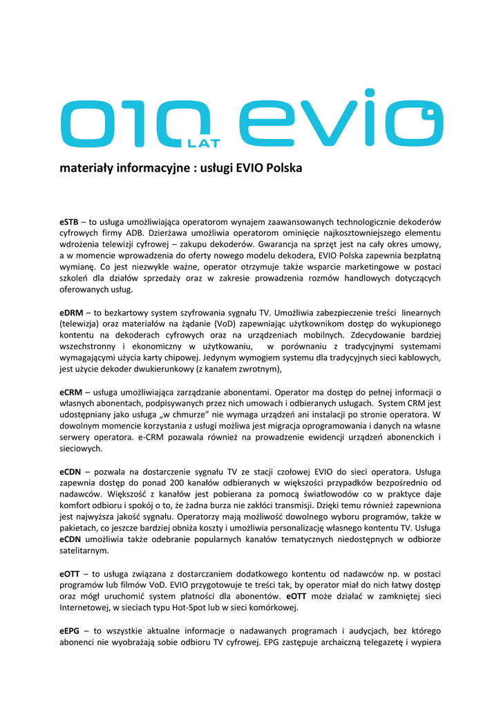 materiały informacyjne : usługi EVIO Polska eSTB – to usługa umożliwiająca operatorom wynajem zaawansowanych technologicznie dekoderów cyfrowych firmy ADB. Dzierżawa umożliwia operatorom ominięcie najkosztowniejszego elementu wdrożenia telewizji cyfrowej – zakupu dekoderów. Gwarancja na sprzęt jest na cały okres umowy, a w momencie wprowadzenia do oferty nowego modelu dekodera, EVIO Polska zapewnia bezpłatną wymianę. Co jest niezwykle ważne, operator otrzymuje także wsparcie marketingowe w postaci szkoleń dla działów sprzedaży oraz w zakresie prowadzenia rozmów handlowych dotyczących oferowanych usług. eDRM – to bezkartowy system szyfrowania sygnału TV. Umożliwia zabezpieczenie treści linearnych (telewizja) oraz materiałów na żądanie (VoD) zapewniając użytkownikom dostęp do wykupionego kontentu na dekoderach cyfrowych oraz na urządzeniach mobilnych. Zdecydowanie bardziej wszechstronny i ekonomiczny w użytkowaniu, w porównaniu z tradycyjnymi systemami wymagającymi użycia karty chipowej. Jedynym wymogiem systemu dla tradycyjnych sieci kablowych, jest użycie dekoder dwukierunkowy (z kanałem zwrotnym), eCRM – usługa umożliwiająca zarządzanie abonentami. Operator ma dostęp do pełnej informacji o własnych abonentach, podpisywanych przez nich umowach i odbieranych usługach. System CRM jest udostępniany jako usługa „w chmurze” nie wymaga urządzeń ani instalacji po stronie operatora. W dowolnym momencie korzystania z usługi możliwa jest migracja oprogramowania i danych na własne serwery operatora. e-CRM pozawala również na prowadzenie ewidencji urządzeń abonenckich i sieciowych. eCDN – pozwala na dostarczenie sygnału TV ze stacji czołowej EVIO do sieci operatora. Usługa zapewnia dostęp do ponad 200 kanałów odbieranych w większości przypadków bezpośrednio od nadawców. Większość z kanałów jest pobierana za pomocą światłowodów co w praktyce daje komfort odbioru i spokój o to, że żadna burza nie zakłóci transmisji. Dzięki temu również zapewniona jest najwyższa jakość sygnału. Operatorzy mają możliwość dowolnego wyboru programów, także w pakietach, co jeszcze bardziej obniża koszty i umożliwia personalizację własnego kontentu TV. Usługa eCDN umożliwia także odebranie popularnych kanałów tematycznych niedostępnych w odbiorze satelitarnym. eOTT – to usługa związana z dostarczaniem dodatkowego kontentu od nadawców np. w postaci programów lub filmów VoD. EVIO przygotowuje te treści tak, by operator miał do nich łatwy dostęp oraz mógł uruchomić system płatności dla abonentów. eOTT może działać w zamkniętej sieci Internetowej, w sieciach typu Hot-Spot lub w sieci komórkowej. eEPG – to wszystkie aktualne informacje o nadawanych programach i audycjach, bez którego abonenci nie wyobrażają sobie odbioru TV cyfrowej. EPG zastępuje archaiczną telegazetę i wypiera drukowane teleprzewodniki. EPG jest niezbędne przy programowaniu nagrywania ulubionych seriali czy programów telewizyjnych, który abonent nie ma szans obejrzeć w momencie emisji. W ramach usługi e-EPG dane dostarczane są do stacji czołowej operatora w postaci multicastu IP gotowego do dystrybucji w jego sieci. Nie są wymagane żadne dodatkowe urządzenia, licencje ani oprogramowanie. eGO! - najprościej mówiąc jest to możliwość odbioru treści TV poza tradycyjnym ekranem telewizora czyli na telefonie, tablecie lub komputerze. Kanałem transmisji jest Internet. Operator zyskuje nowe możliwości dystrybucji, a abonent komfort w oglądaniu materiałów, gdzie i kiedy chce. Biorąc pod uwagę wymagania konsumentów, jest to już absolutna konieczność, jeśli operator chce iść z duchem czasu i zatrzymać abonenta w swojej sieci. eCatchUp-TV – usługa pozwalająca na obejrzenie programów nawet kilka dni po ich rzeczywistej emisji. Zasady dostępności określane są przez nadawcę w zależności od tego czy jest producentem danego programu, czy też tylko nabył prawa do emisji. Z pewnością dla abonenta jest to kolejne udogodnienie pozwalające na obejrzenie programu nawet jeśli zapomniał zaprogramować nagrywanie. „TwójTIVIK” powstał z myślą o użytkownikach dekoderów ADB i jest interaktywnym portalem informacyjno-rozrywkowym. Przeglądając serwis, abonent może między innymi uzyskać dostęp do ponad 100 kamer pogodowych rozmieszczonych w całym kraju, może obejrzeć zwiastuny i zapowiedzi hitów kinowych lub korzystać z oferty najbardziej popularnego kanału treści video, jakim jest YouTube™. Ze względu na popularność, jaką się cieszy wśród odbiorców, rozwój TiViKa jest w chwili obecnej jednym z priorytetów EVIO Polska. Planowane jest zapewnienie dostępu do kontentu związanego z grami video, a także z serwisami kobiecymi, kulinariami i wszystkim tym co może zainteresować współczesnego konsumenta spragnionego dedykowanych treści dostępnych na żądanie. OPERATOR.TV – to usługa dedykowana operatorom tworzącym własne treści video. Umożliwia uruchomienie biblioteki VoD z własnymi materiałami. Jest to kompletne narzędzie pozwalające na dotarcie do abonentów i promocję własnego kontenu. Całość usługi jest technologicznie obsługiwana przez EVIO Polska, a operator musi jedynie dostarczyć kontent video. Kontakt dla mediów: Magdalena Jabłońska - Public & Media Relations, tel: 609 921 609, mail: [email protected]