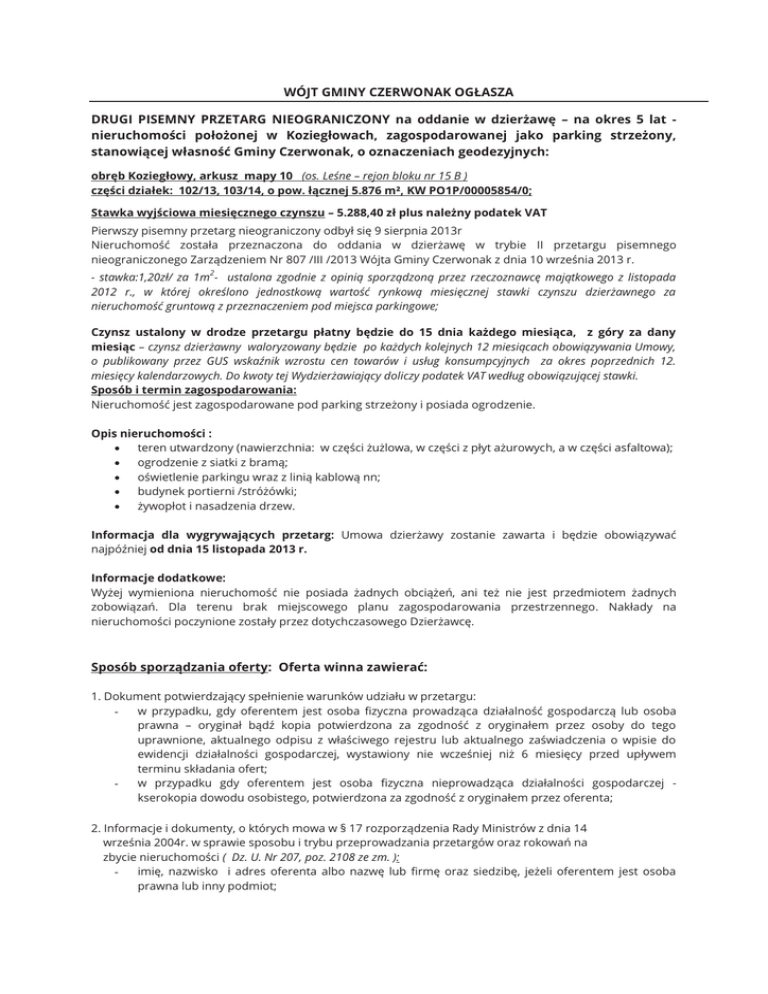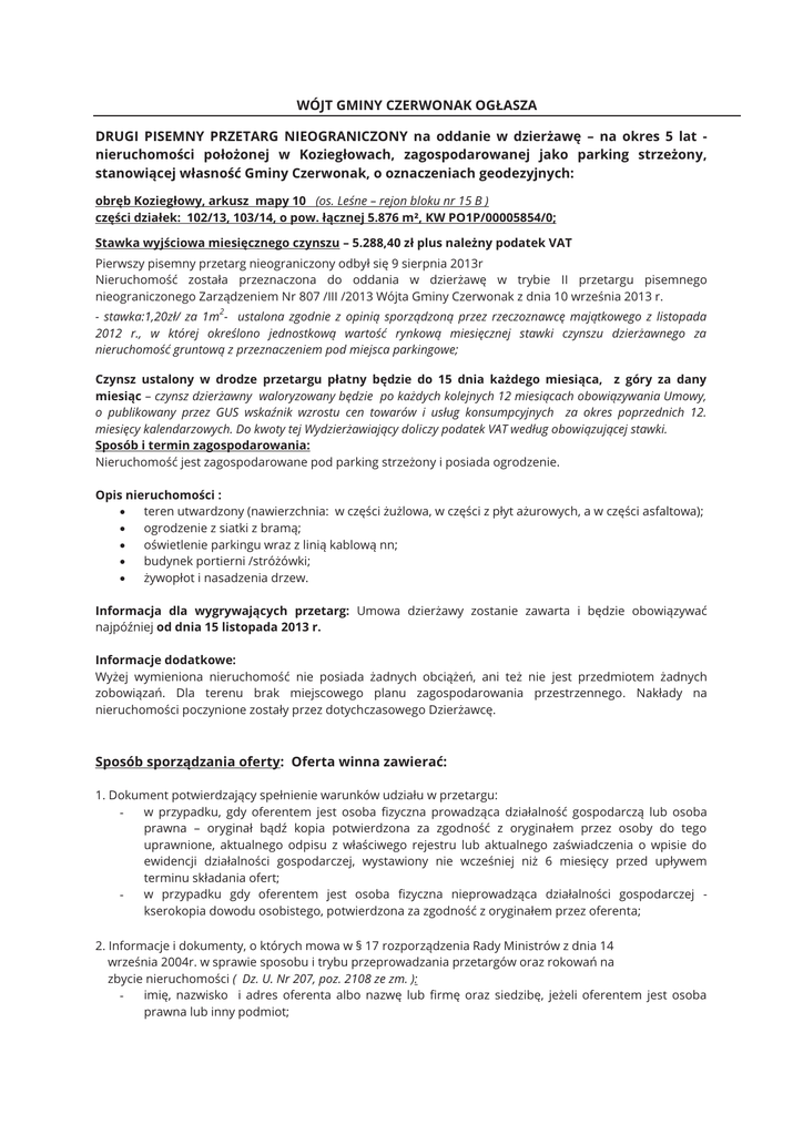 WÓJT GMINY CZERWONAK OGŁASZA DRUGI PISEMNY PRZETARG NIEOGRANICZONY na oddanie w dzierżawę – na okres 5 lat nieruchomości położonej w Koziegłowach, zagospodarowanej jako parking strzeżony, stanowiącej własność Gminy Czerwonak, o oznaczeniach geodezyjnych: obręb Koziegłowy, arkusz mapy 10 (os. Leśne – rejon bloku nr 15 B ) części działek: 102/13, 103/14, o pow. łącznej 5.876 m², KW PO1P/00005854/0; Stawka wyjściowa miesięcznego czynszu – 5.288,40 zł plus należny podatek VAT Pierwszy pisemny przetarg nieograniczony odbył się 9 sierpnia 2013r Nieruchomość została przeznaczona do oddania w dzierżawę w trybie II przetargu pisemnego nieograniczonego Zarządzeniem Nr 807 /III /2013 Wójta Gminy Czerwonak z dnia 10 września 2013 r. 2 - stawka:1,20zł/ za 1m - ustalona zgodnie z opinią sporządzoną przez rzeczoznawcę majątkowego z listopada 2012 r., w której określono jednostkową wartość rynkową miesięcznej stawki czynszu dzierżawnego za nieruchomość gruntową z przeznaczeniem pod miejsca parkingowe; Czynsz ustalony w drodze przetargu płatny będzie do 15 dnia każdego miesiąca, z góry za dany miesiąc – czynsz dzierżawny waloryzowany będzie po każdych kolejnych 12 miesiącach obowiązywania Umowy, o publikowany przez GUS wskaźnik wzrostu cen towarów i usług konsumpcyjnych za okres poprzednich 12. miesięcy kalendarzowych. Do kwoty tej Wydzierżawiający doliczy podatek VAT według obowiązującej stawki. Sposób i termin zagospodarowania: Nieruchomość jest zagospodarowane pod parking strzeżony i posiada ogrodzenie. Opis nieruchomości : · teren utwardzony (nawierzchnia: w części żużlowa, w części z płyt ażurowych, a w części asfaltowa); · ogrodzenie z siatki z bramą; · oświetlenie parkingu wraz z linią kablową nn; · budynek portierni /stróżówki; · żywopłot i nasadzenia drzew. Informacja dla wygrywających przetarg: Umowa dzierżawy zostanie zawarta i będzie obowiązywać najpóźniej od dnia 15 listopada 2013 r. Informacje dodatkowe: Wyżej wymieniona nieruchomość nie posiada żadnych obciążeń, ani też nie jest przedmiotem żadnych zobowiązań. Dla terenu brak miejscowego planu zagospodarowania przestrzennego. Nakłady na nieruchomości poczynione zostały przez dotychczasowego Dzierżawcę. Sposób sporządzania oferty: Oferta winna zawierać: 1. Dokument potwierdzający spełnienie warunków udziału w przetargu: w przypadku, gdy oferentem jest osoba fizyczna prowadząca działalność gospodarczą lub osoba prawna – oryginał bądź kopia potwierdzona za zgodność z oryginałem przez osoby do tego uprawnione, aktualnego odpisu z właściwego rejestru lub aktualnego zaświadczenia o wpisie do ewidencji działalności gospodarczej, wystawiony nie wcześniej niż 6 miesięcy przed upływem terminu składania ofert; w przypadku gdy oferentem jest osoba fizyczna nieprowadząca działalności gospodarczej kserokopia dowodu osobistego, potwierdzona za zgodność z oryginałem przez oferenta; 2. Informacje i dokumenty, o których mowa w § 17 rozporządzenia Rady Ministrów z dnia 14 września 2004r. w sprawie sposobu i trybu przeprowadzania przetargów oraz rokowań na zbycie nieruchomości ( Dz. U. Nr 207, poz. 2108 ze zm. ): imię, nazwisko i adres oferenta albo nazwę lub firmę oraz siedzibę, jeżeli oferentem jest osoba prawna lub inny podmiot; proponowana stawkę czynszu dzierżawnego wyrażoną w PLN netto, przy czym zaoferowana stawka musi być wyższa od stawki wyjściowej miesięcznego czynszu dzierżawnego; datę sporządzenia oferty; oświadczenie o zapoznaniu się z warunkami przetargu i przyjęciem ich bez zastrzeżeń; podpisy: oferenta lub osób upoważnionych. Do oferty należy załączyć: oświadczenie o zapoznaniu się ze stanem faktyczno-technicznym i prawnym nieruchomości; oświadczenie o zapoznaniu się z warunkami przetargu i przyjęciu ich bez zastrzeżeń; oświadczenie o zapoznaniu się z projektem umowy dzierżawy i przyjęciu go bez zastrzeżeń (wzór umowy dostępny w siedzibie Urzędu Gminy Czerwonak ul. Źródlana 39, II piętro, pok. 202 oraz zamieszczony na stronie internetowej urzędu www.czerwonak.pl i www.bip.czerwonak.pl); kopię dowodu wpłaty wadium; - Wadium: Ustala się wadium w wysokości 10.000,00 zł, które należy wpłacić w formie pieniężnej na konto Urzędu Gminy Czerwonak: Bank Zachodni WBK SA VII Oddział w Poznaniu Nr 24 1090 1737 0000 0001 0792 9837, z dopiskiem: „przetarg – dzierżawa- os. Leśne” - najdalej do dnia 8 października 2013 r. Za dzień wpłaty wadium uznaje się datę wpływu środków pieniężnych na konto Urzędu Gminy Czerwonak. Wadium wpłacone przez oferenta, który przetarg wygrał, zalicza się na poczet czynszu dzierżawnego. Wadium ulega przepadkowi w razie uchylenia się oferenta, który wygrał przetarg, od zawarcia umowy dzierżawy. Tryb składania ofert: Oferty w zaklejonych kopertach uniemożliwiających identyfikację Oferenta z napisem: „Przetarg – dzierżawa – parking –os. Leśne” należy składać w biurze podawczym Urzędu Gminy Czerwonak 00 do dnia 08 października 2013 r., do godz. 15 Otwarcie ofert: Przetarg składa się z części jawnej i niejawnej. Część jawna przetargu odbędzie się w obecności Oferentów w siedzibie Urzędu Gminy Czerwonak, 00 ul. Źródlana 39, pok. 01, w dniu 14 października 2013 r., o godz. 10 Przetarg ma na celu wybranie najkorzystniejszej oferty. Informacja o zamknięciu przetargu bez wybrania którejkolwiek z ofert: Wójt Gminy Czerwonak ma prawo zamknięcia przetargu bez wybrania którejkolwiek z ofert. Umowa dzierżawy: O terminie zawarcia umowy wygrywający przetarg zawiadamiany jest na piśmie. Informacje dodatkowe: Szczegółowych informacji udziela Urząd Gminy Czerwonak ul. Źródlana 39 - Wydział Urbanistyki i Gospodarki Gruntami, pok. 202, tel. 61/65-44-257, 61/65-44-254, 61/65-44-253. Ogłoszenie o II pisemnym przetargu nieograniczonym wywieszo